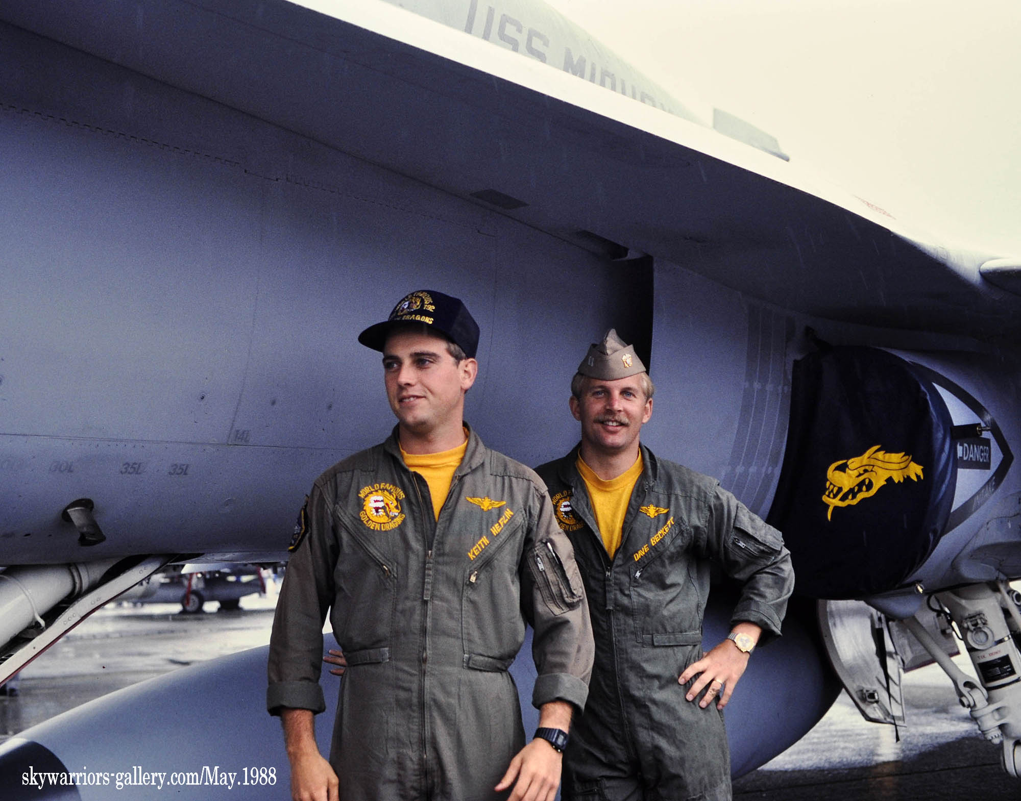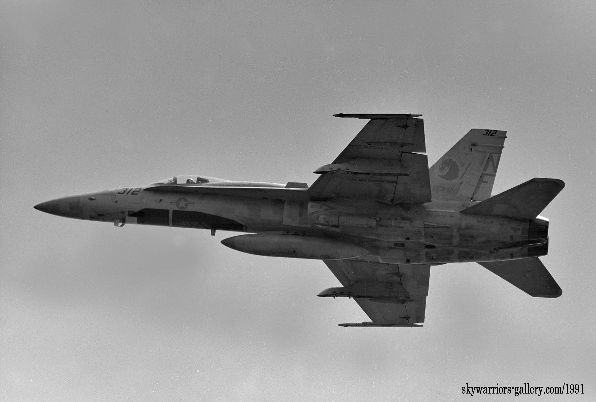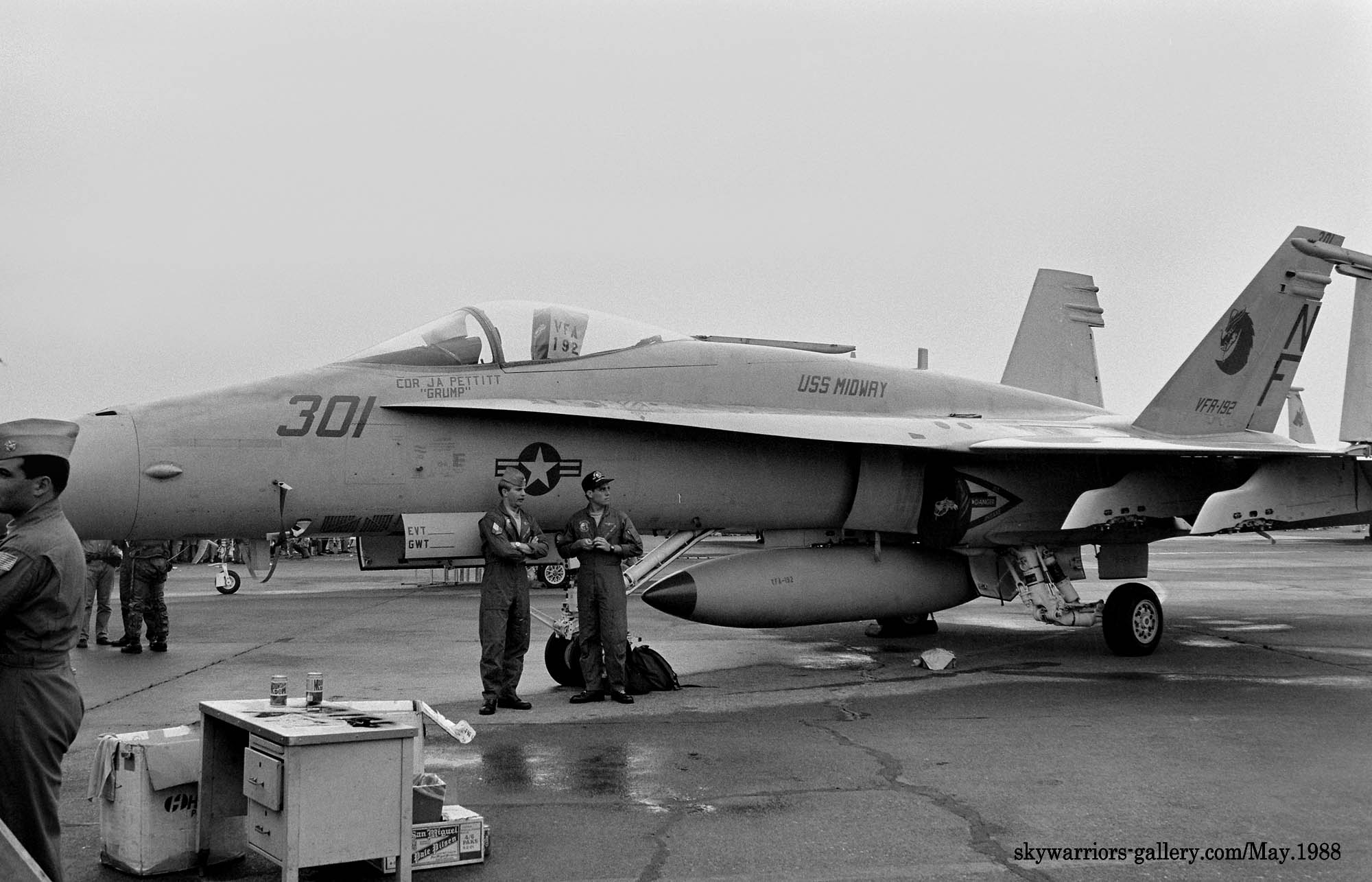 ↑ USSミッドウェイに配備されて間もないVFA-192は1988年の厚木基地公開日、遠方であったが列線を見る事が出来た。 NF-300.ドラゴンが暗いグレーで書き込まれ 胴体に”USS MIDWAY”の文字、もちろん配備当時はA型である。VFA-195と異なりテールレターは、最初からラダーに”NF”と描かれていた。
