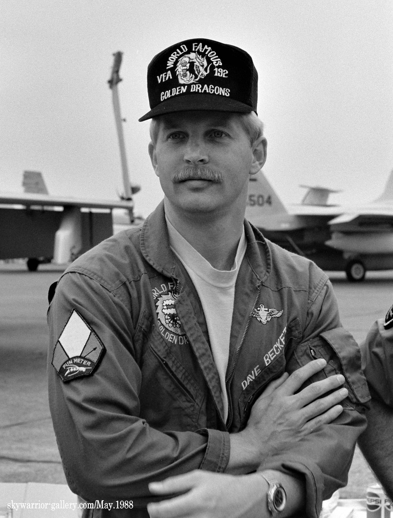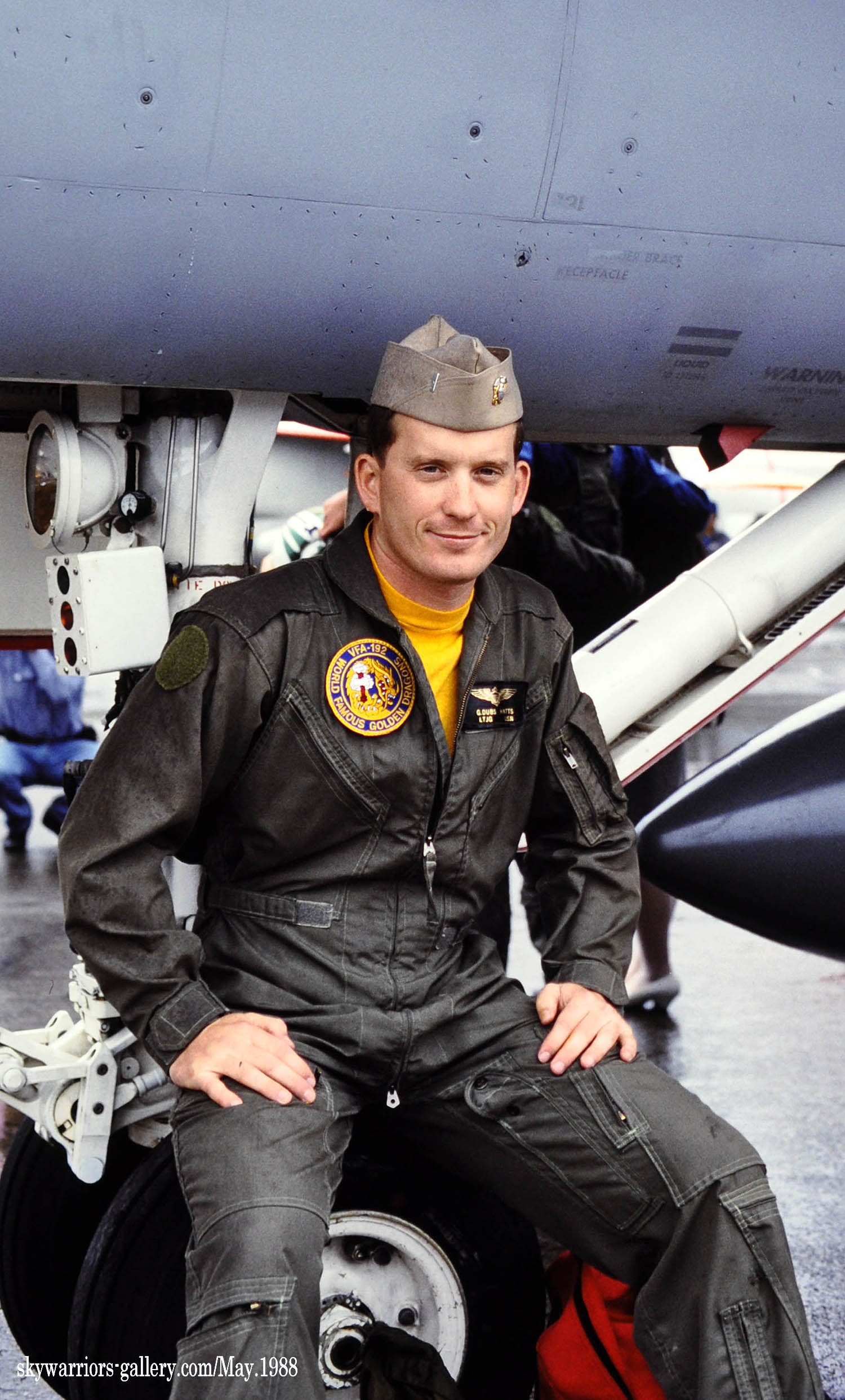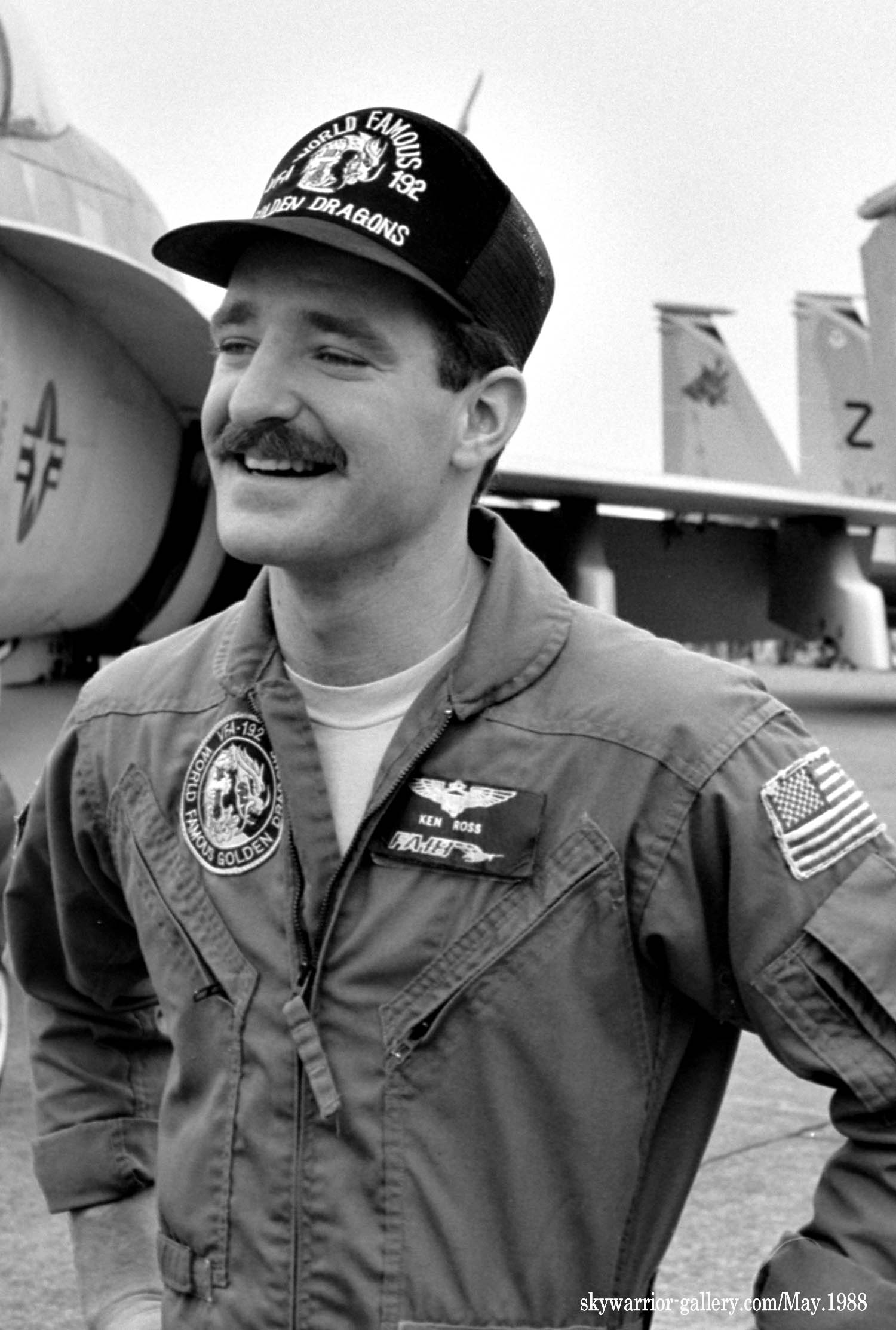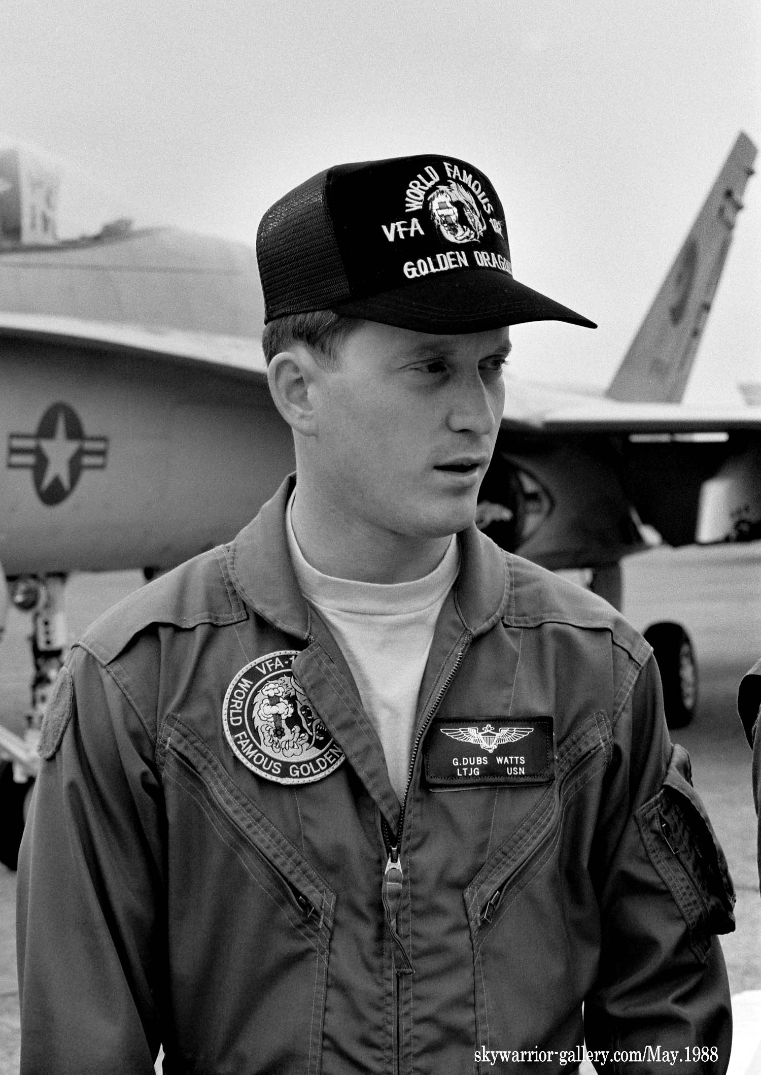 ↑ USSミッドウェイに配備されて間もないVFA-192は1988年の厚木基地公開日、遠方であったが列線を見る事が出来た。 NF-300.ドラゴンが暗いグレーで書き込まれ 胴体に”USS MIDWAY”の文字、もちろん配備当時はA型である。VFA-195と異なりテールレターは、最初からラダーに”NF”と描かれていた。