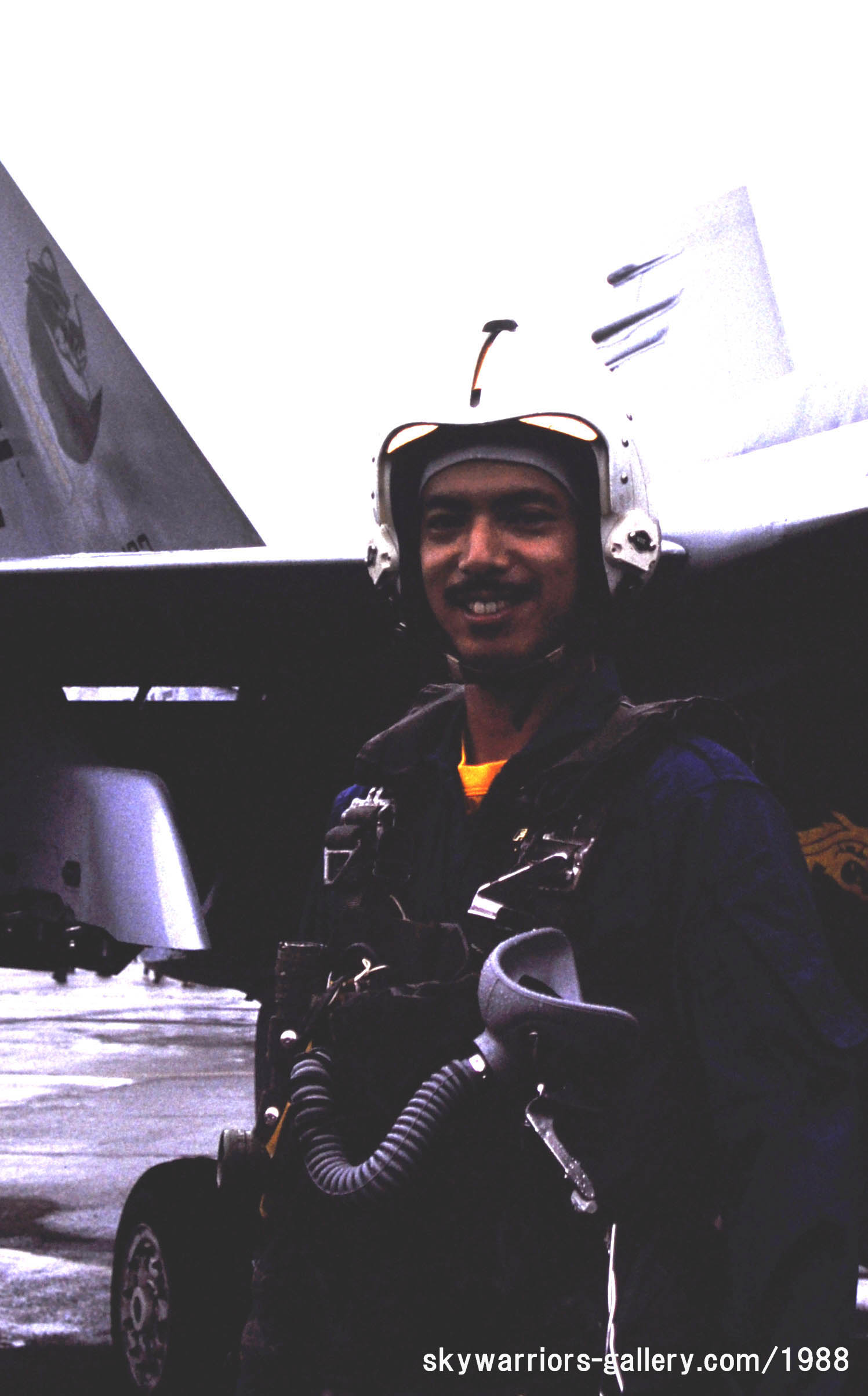 ↑ 1988年5月22日の厚木基地公開日に、VFA-195FA-18A/NF-301/Bu.No.162873が初めて展示された。センタータンクの先端は色が塗られていたが、何色か記憶にない。部隊黄や文字が黒に近いグレーではっきりと書かれ、すっきりとした印象であった。パイロットのスーツは、この時点ではグリーン色であった。