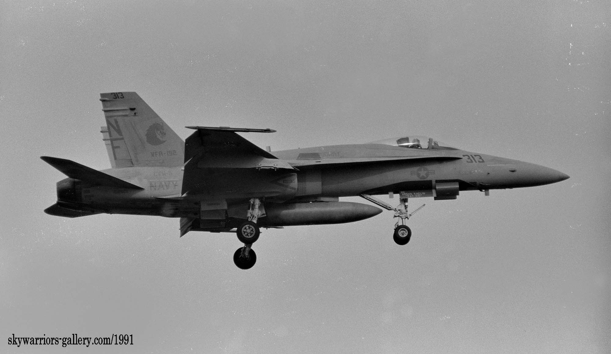 ↑ 厚木基地でローカル訓練を行っていたVFA-192のFA-18A。疑似コクピットの効果を出すために他のマーキングを全て薄いグレーにしたため。何となくすっきりしない印象である。