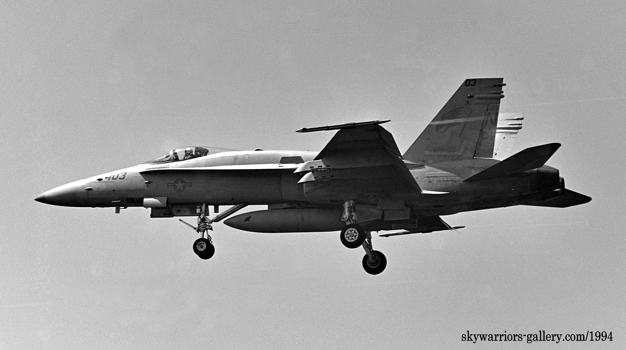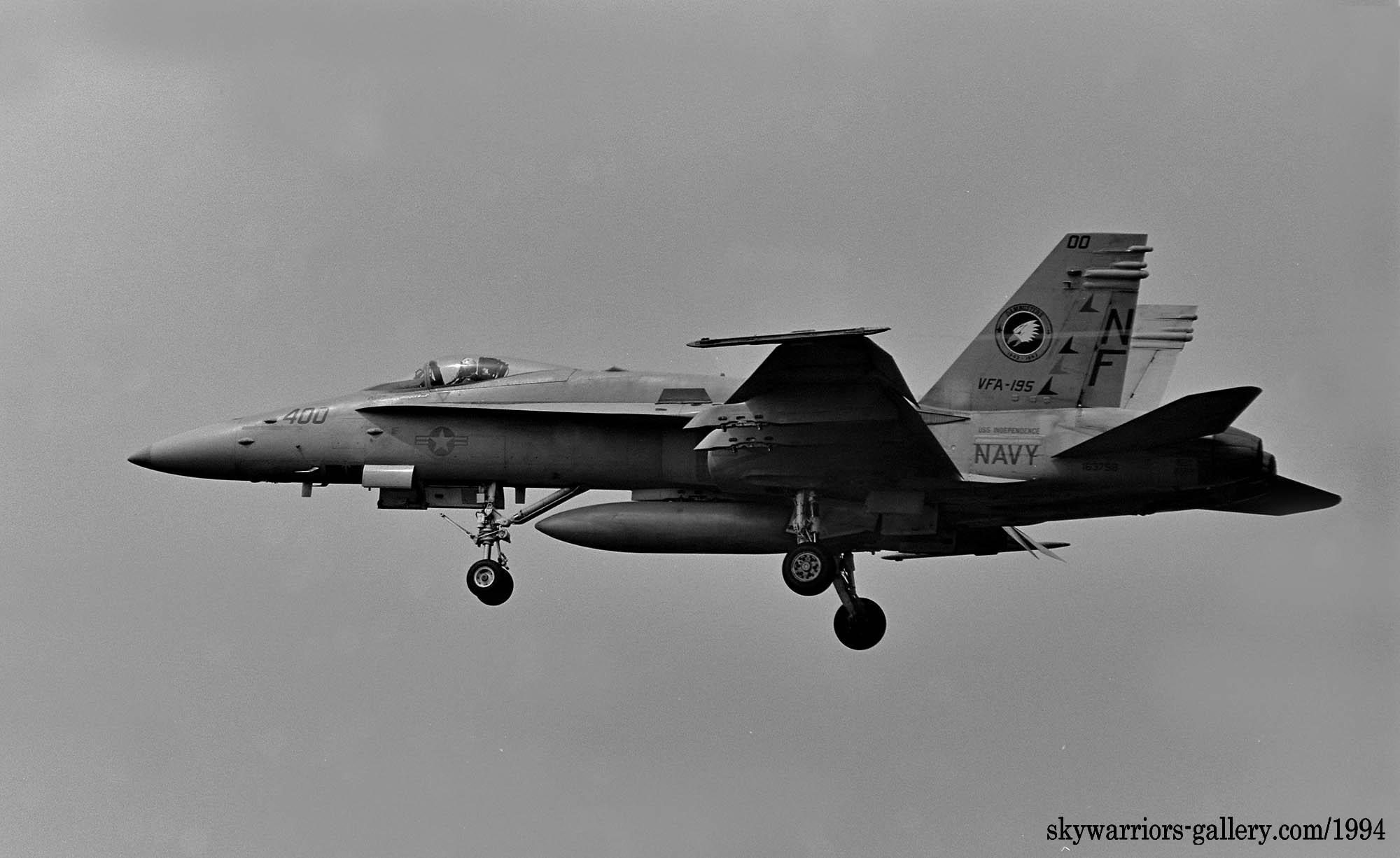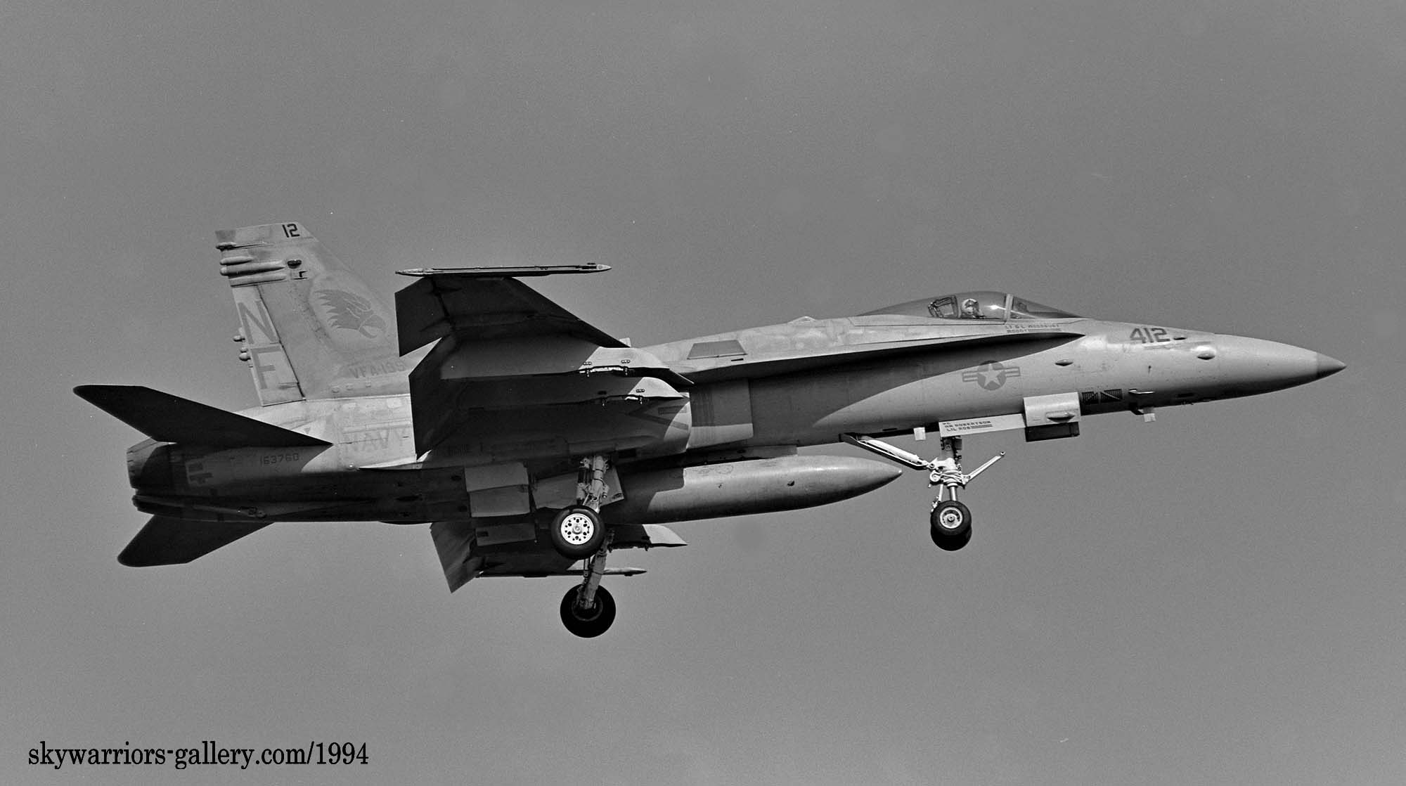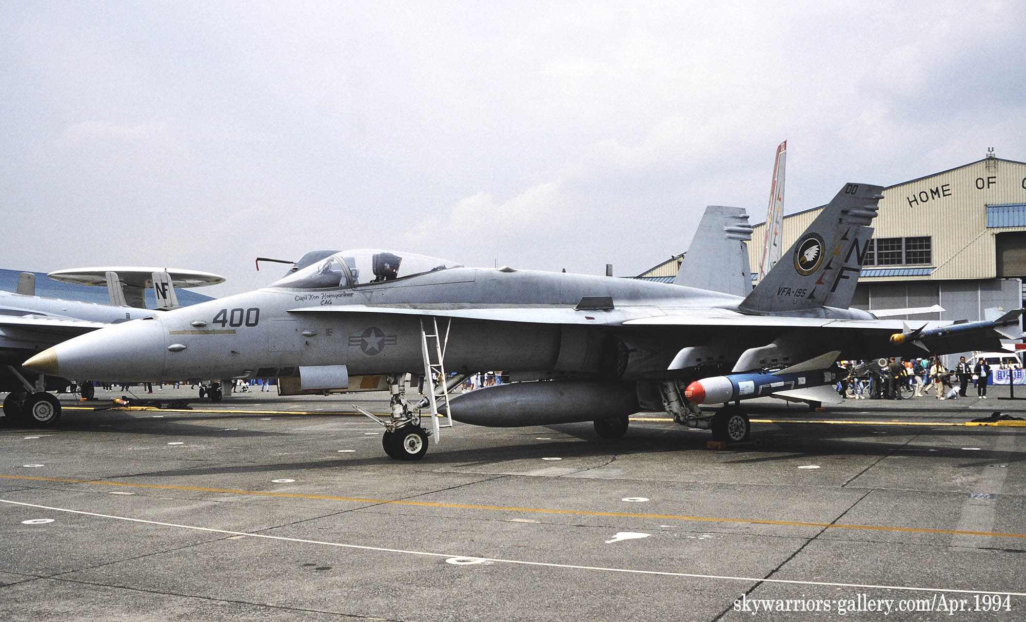 ↑ 上の2枚の写真は、厚木航空祭Wing-93と5月のイベントなど2度展示されたチッピー400。Bu.no.163758が再びCVW-5司令官指定機(CAG機)に返り咲いた。前年1993年のCAG機のデザインと比較すると。各飛行隊のスコードロンカラ―のシェブロンが追加された事と尾翼の”00”が少し小さくなり、”NAVY”の文字が黒くなった事が上げられる。同隊創設50周年のマークもチッピーの姿がカラーに変化している。
