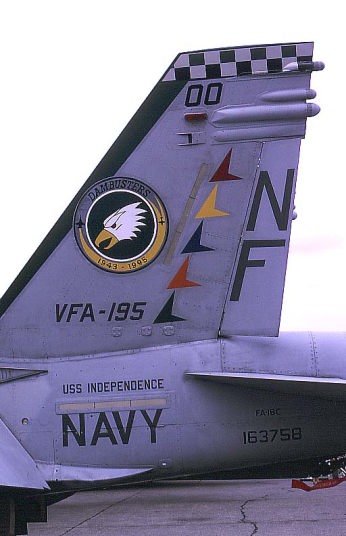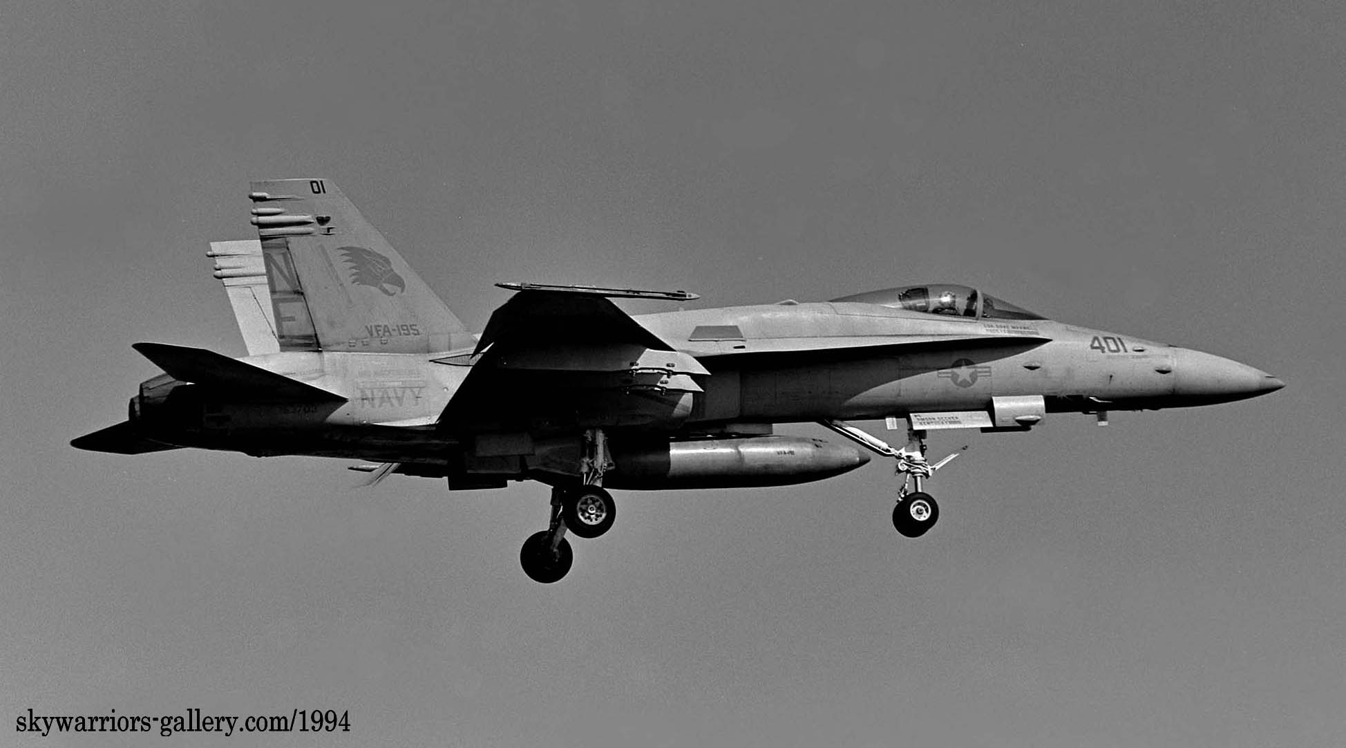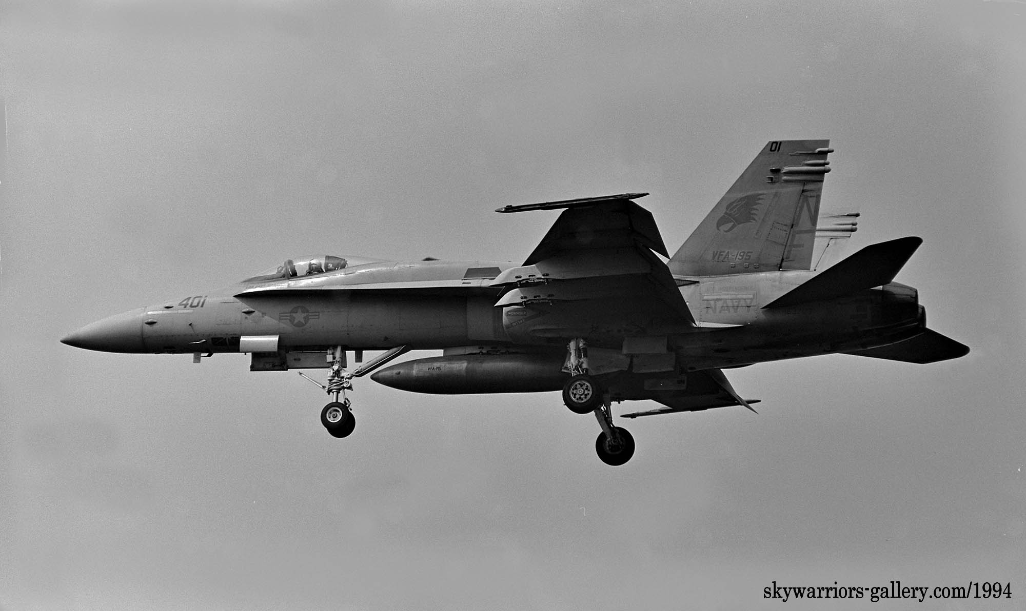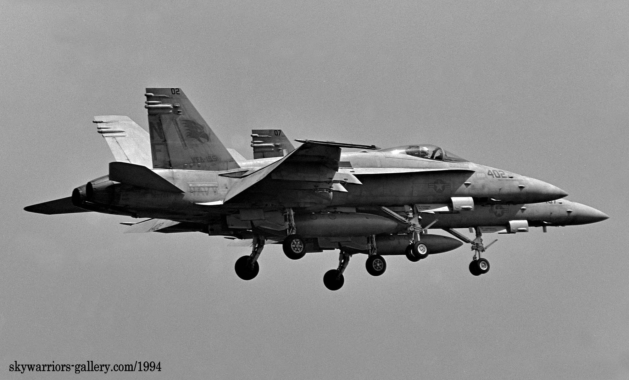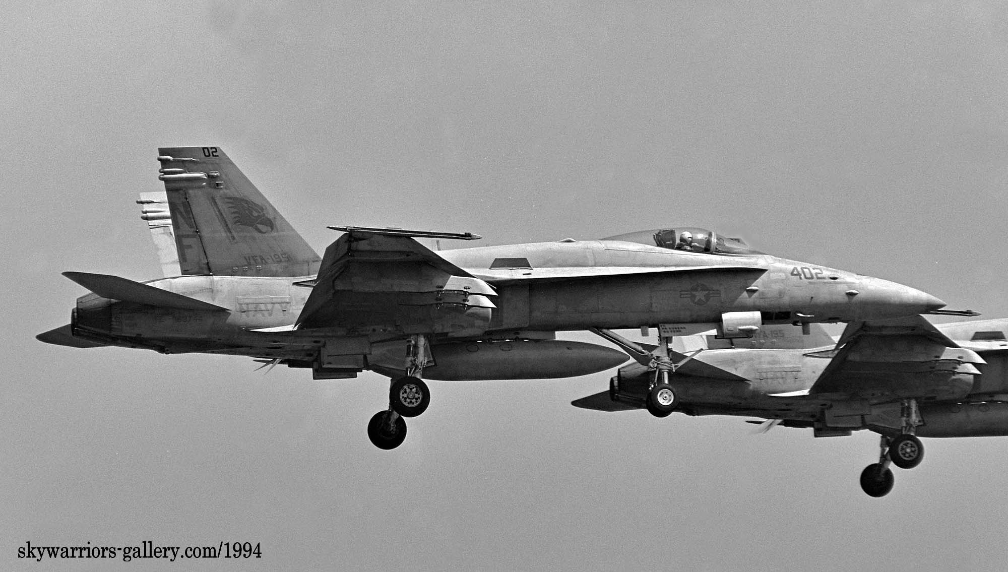 ↑ 上の2枚の写真は、厚木航空祭Wing-93と5月のイベントなど2度展示されたチッピー400。Bu.no.163758が再びCVW-5司令官指定機(CAG機)に返り咲いた。前年1993年のCAG機のデザインと比較すると。各飛行隊のスコードロンカラ―のシェブロンが追加された事と尾翼の”00”が少し小さくなり、”NAVY”の文字が黒くなった事が上げられる。同隊創設50周年のマークもチッピーの姿がカラーに変化している。
