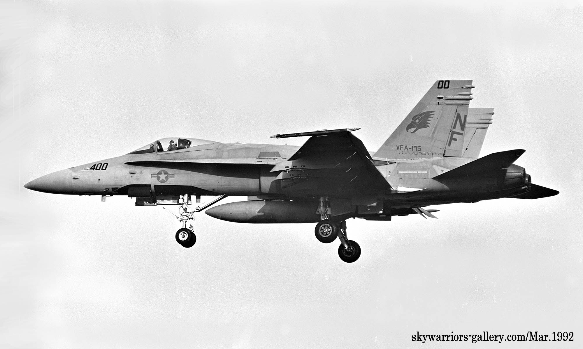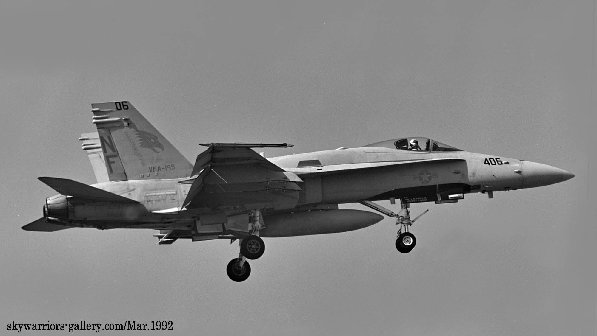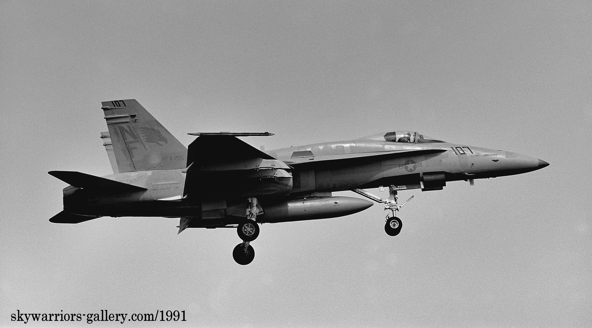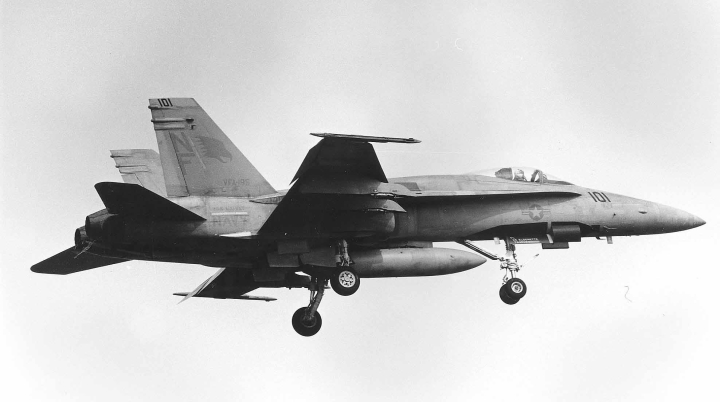 ↑ 1990年から1991年に掛けてVFA-195の各機はコックピットの下面にフォールスキャノピーを描くようになった。これは敵との空戦時に機体の上下が敵機から判りにくくし 次の自機の動きを敵機に判らないようにするためである。