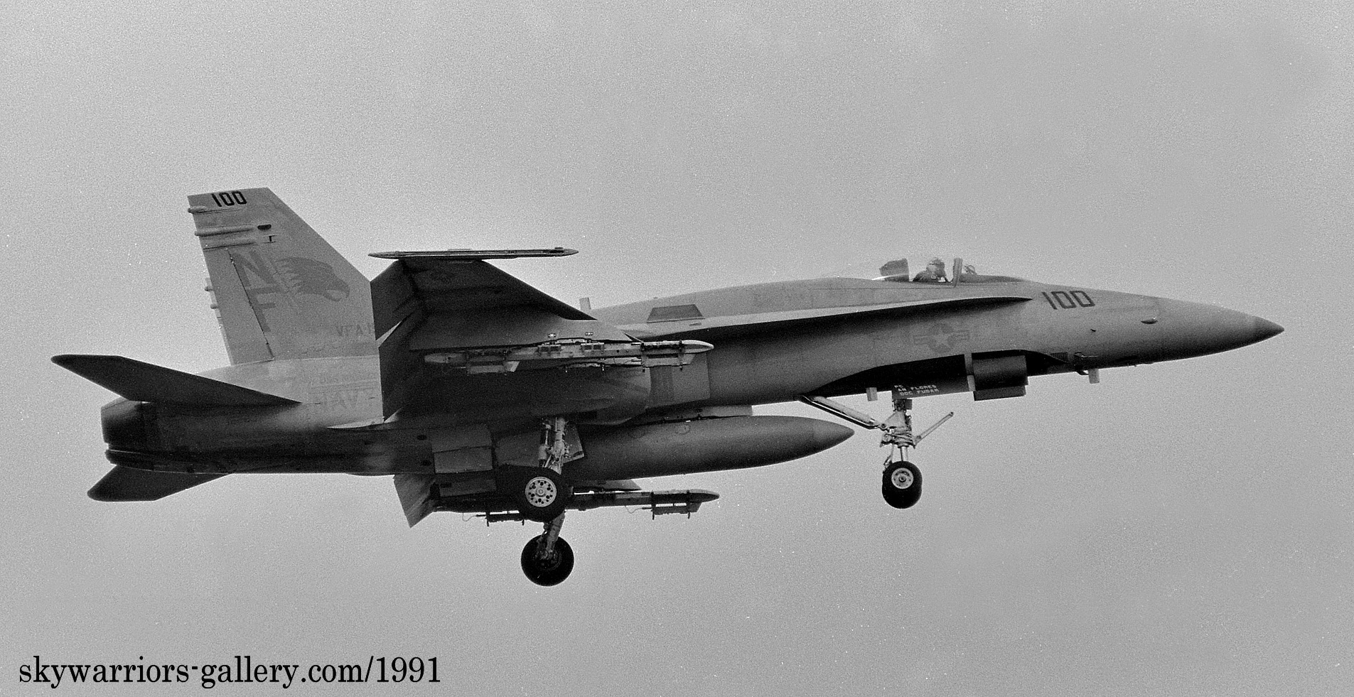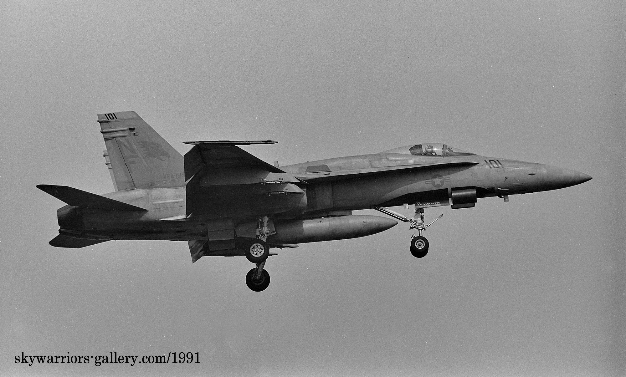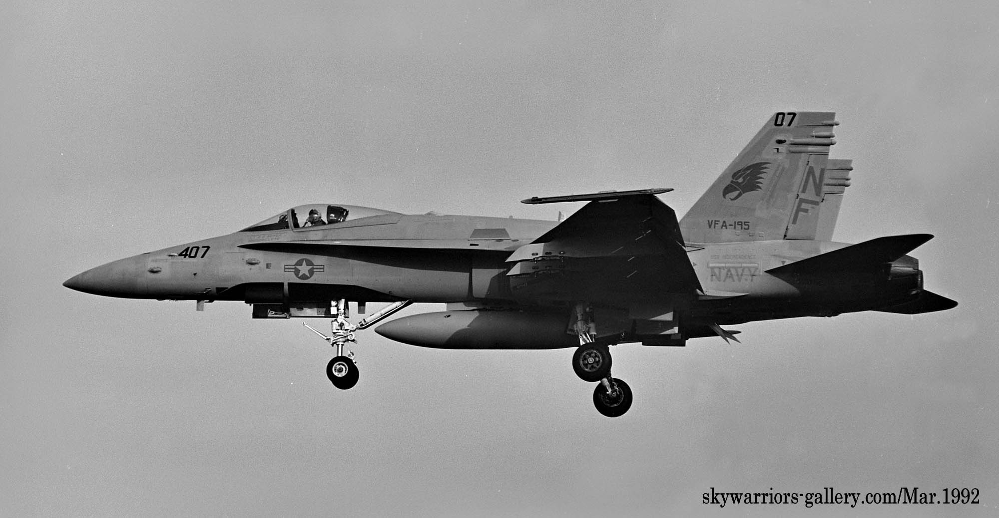 ↑ 1990年から1991年に掛けてVFA-195の各機はコックピットの下面にフォールスキャノピーを描くようになった。これは敵との空戦時に機体の上下が敵機から判りにくくし 次の自機の動きを敵機に判らないようにするためである。