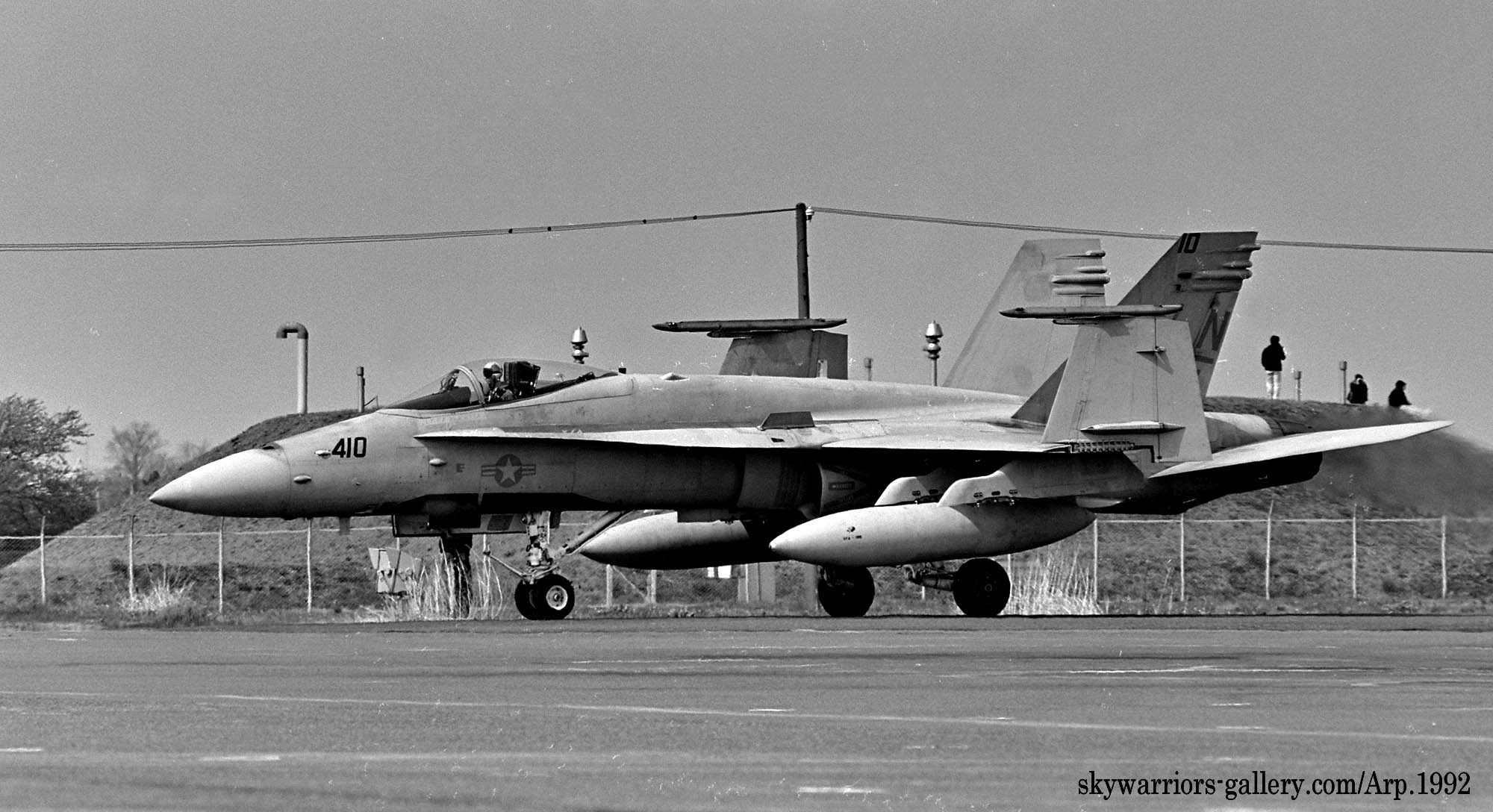 ↑ タキシーしながら主翼を折りたたむFA-18C/NF-410。折り畳みの角度は100°で、少々内側へ傾く程度。レーダーは、JPG-65でJバンドを使っており、9種類の対空モードが用意されている。翼端に装着できる短距離ミサイルは、360°対応可能な当時の最新型AIM-9M(サイドワインダーミサイル M型)を使っている。
