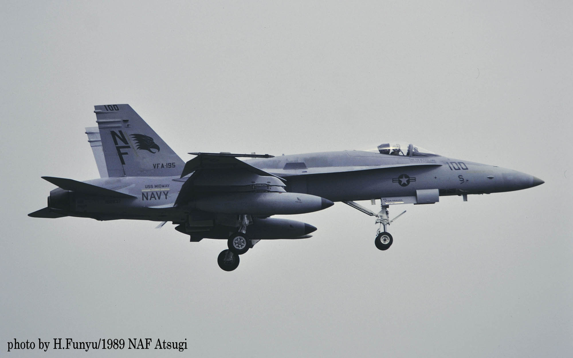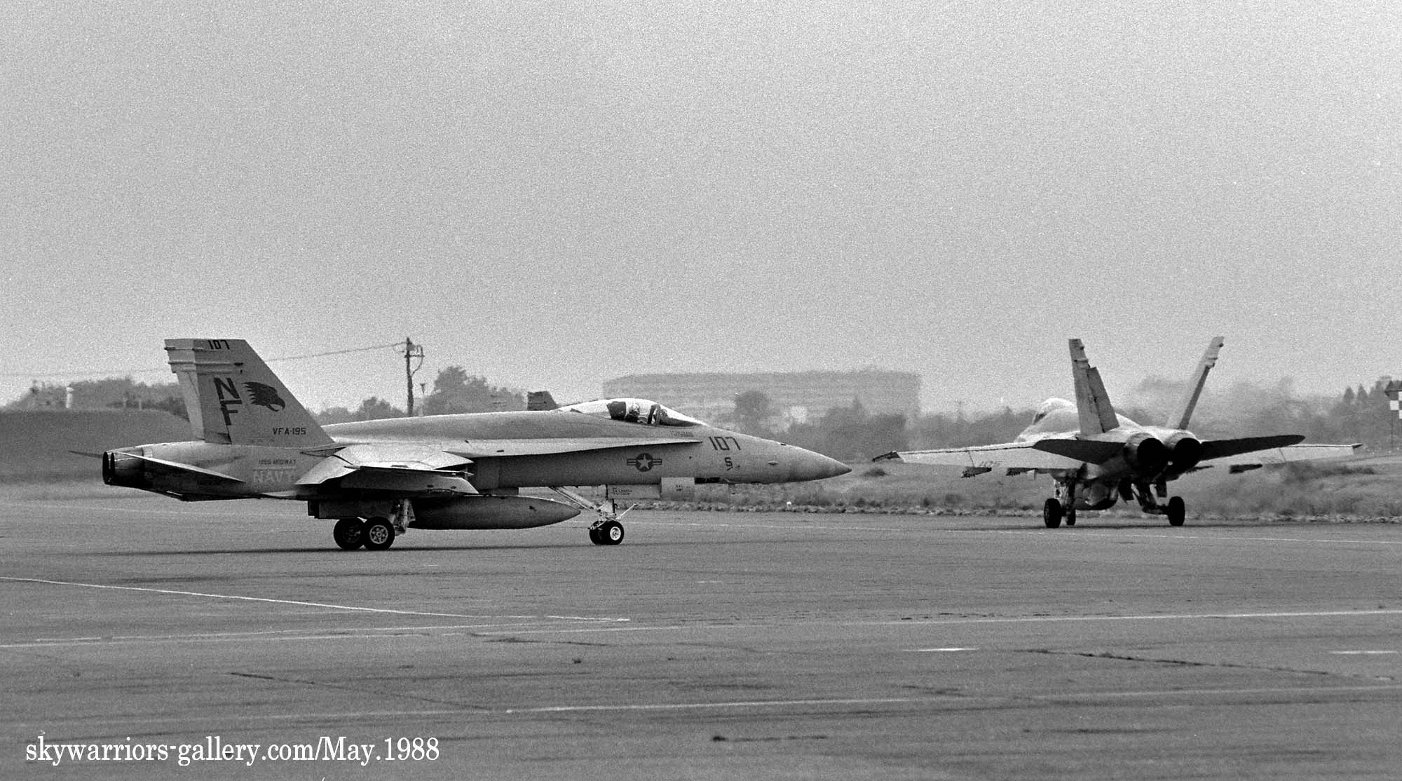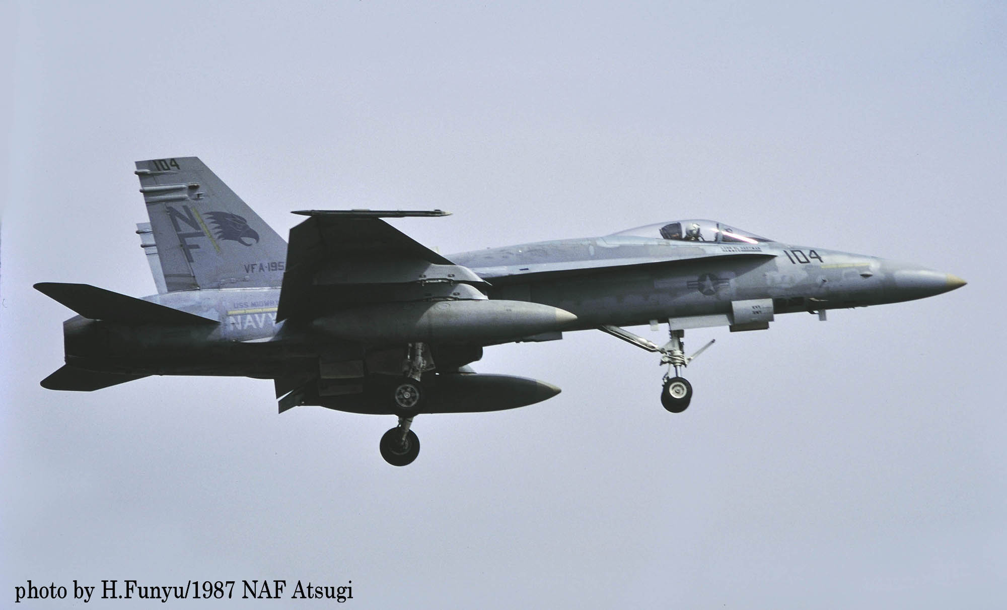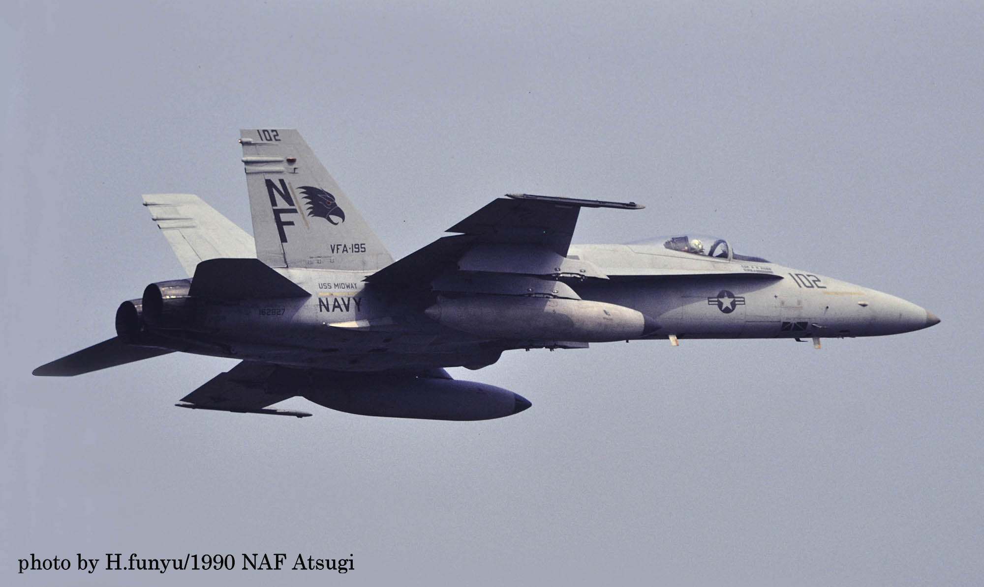 1987年の秋、VFA-195飛行隊がCVW-5の仲間入りをして厚木に移動をしてきた。永らくF-4J〜Sと言ったファントム戦闘機に親しんでいた厚木の海軍機ファンにとって、F/A-18は初めて見る海軍の新鋭戦闘機。来日の情報は事前にマニアの察知する所となり、初飛来の日は厚木基地の南側国道沿いは押し寄せたファンで一杯となった。皆が期待していたのが、F/A-18Aの尾翼に大きく書き込んでいるであろう鷲のマークだ。A-7E時代の派手なマーキングでファンを虜にしていた飛行隊だけに、ロービジの時代となってしまったとは言え、VFA-195の新塗装には興味津々で第一編隊が刻々と厚木基地に近づくなか期待が膨らんだ。その日は結局第1陣の4機しか到着しなかったが、次々に舞い降りるVFA-195の尾翼に、うっすらと書かれていたマークに正直とても落胆したのは、今でも覚えている。翌年、厚木の公開で出会ったパイロットのフライトスーツは期待以上に派手なものだったが、戦闘機のマーキングはショーバードを除き、その後も暫くの間は地味さが抜けなかった。