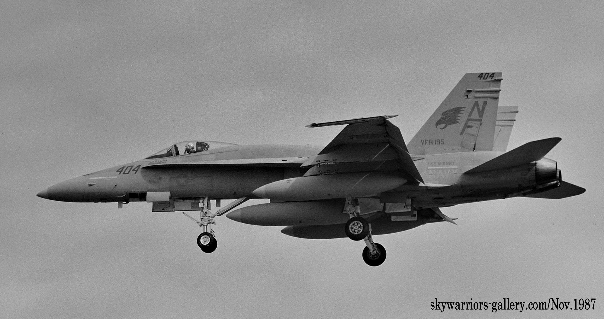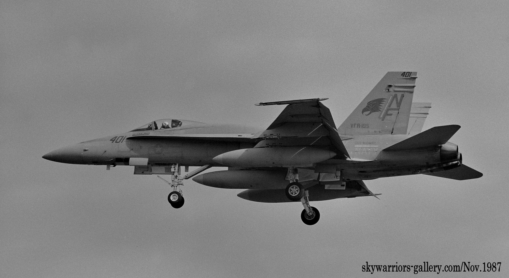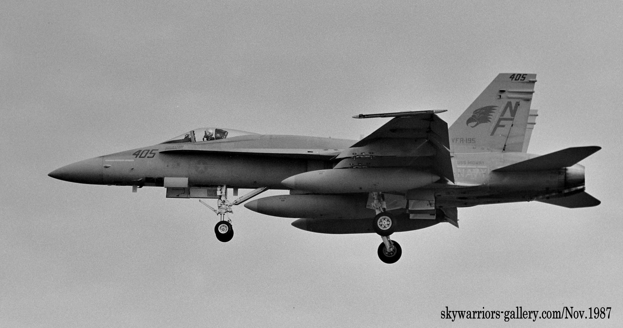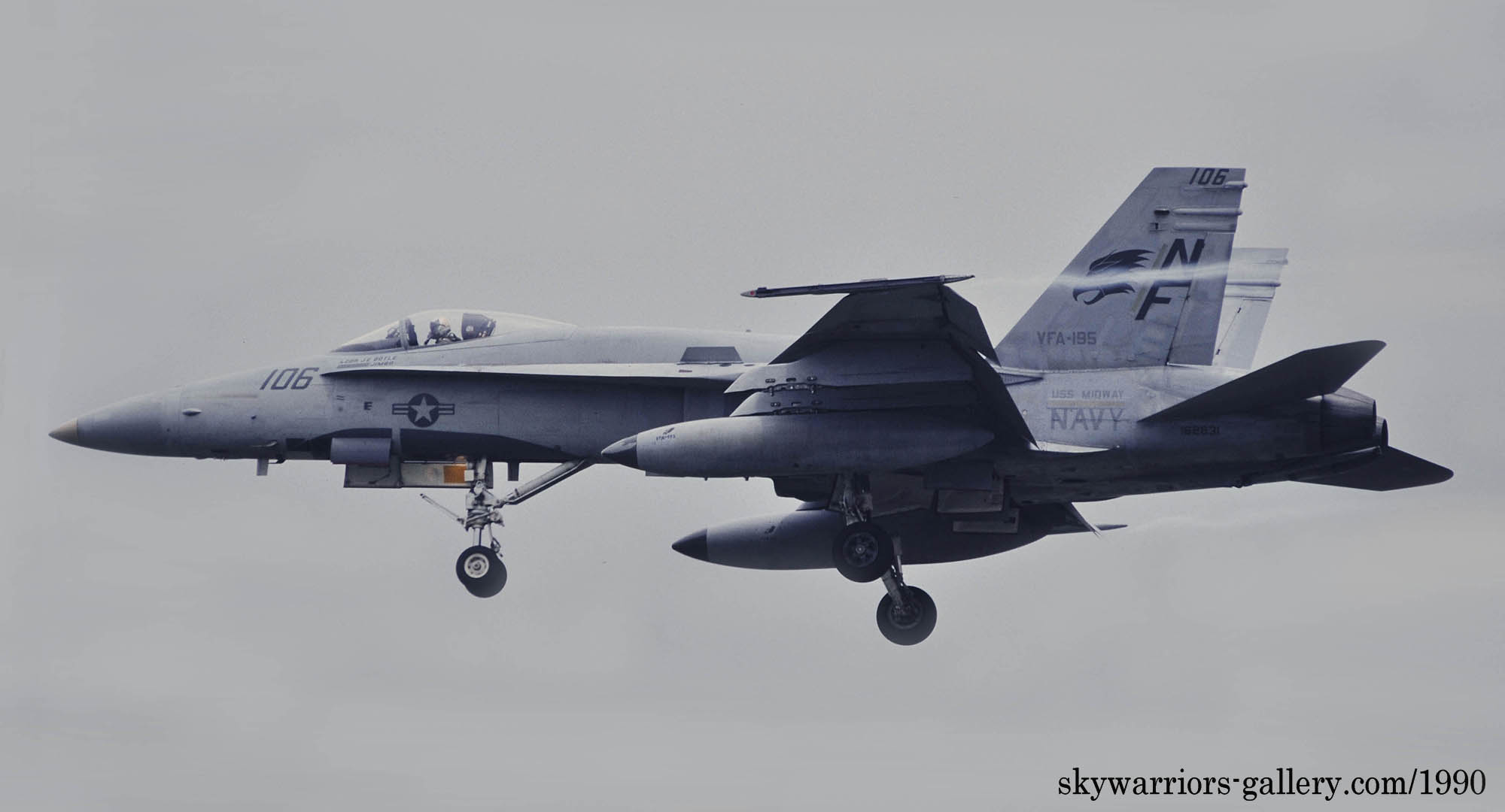 1987年の秋、VFA-195飛行隊がCVW-5の仲間入りをして厚木に移動をしてきた。永らくF-4J〜Sと言ったファントム戦闘機に親しんでいた厚木の海軍機ファンにとって、F/A-18は初めて見る海軍の新鋭戦闘機。来日の情報は事前にマニアの察知する所となり、初飛来の日は厚木基地の南側国道沿いは押し寄せたファンで一杯となった。皆が期待していたのが、F/A-18Aの尾翼に大きく書き込んでいるであろう鷲のマークだ。A-7E時代の派手なマーキングでファンを虜にしていた飛行隊だけに、ロービジの時代となってしまったとは言え、VFA-195の新塗装には興味津々で第一編隊が刻々と厚木基地に近づくなか期待が膨らんだ。その日は結局第1陣の4機しか到着しなかったが、次々に舞い降りるVFA-195の尾翼に、うっすらと書かれていたマークに正直とても落胆したのは、今でも覚えている。翌年、厚木の公開で出会ったパイロットのフライトスーツは期待以上に派手なものだったが、戦闘機のマーキングはショーバードを除き、その後も暫くの間は地味さが抜けなかった。