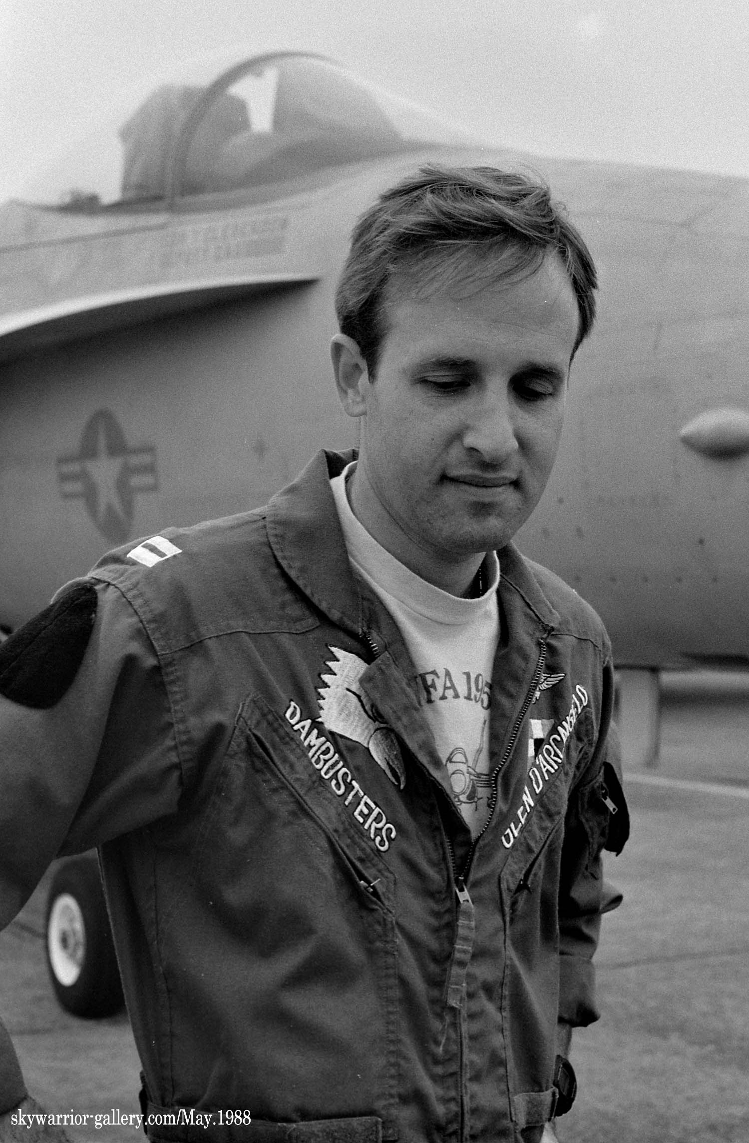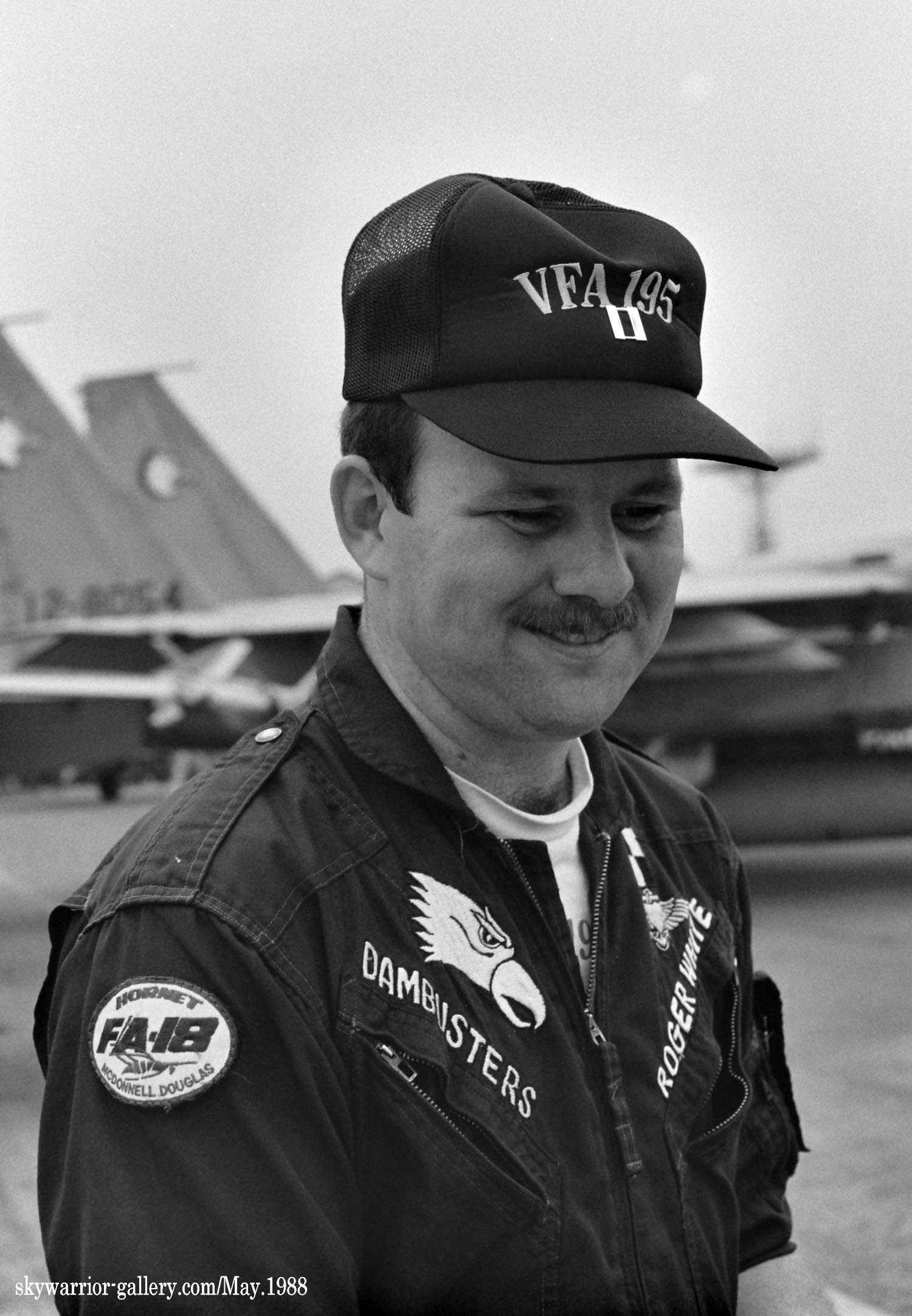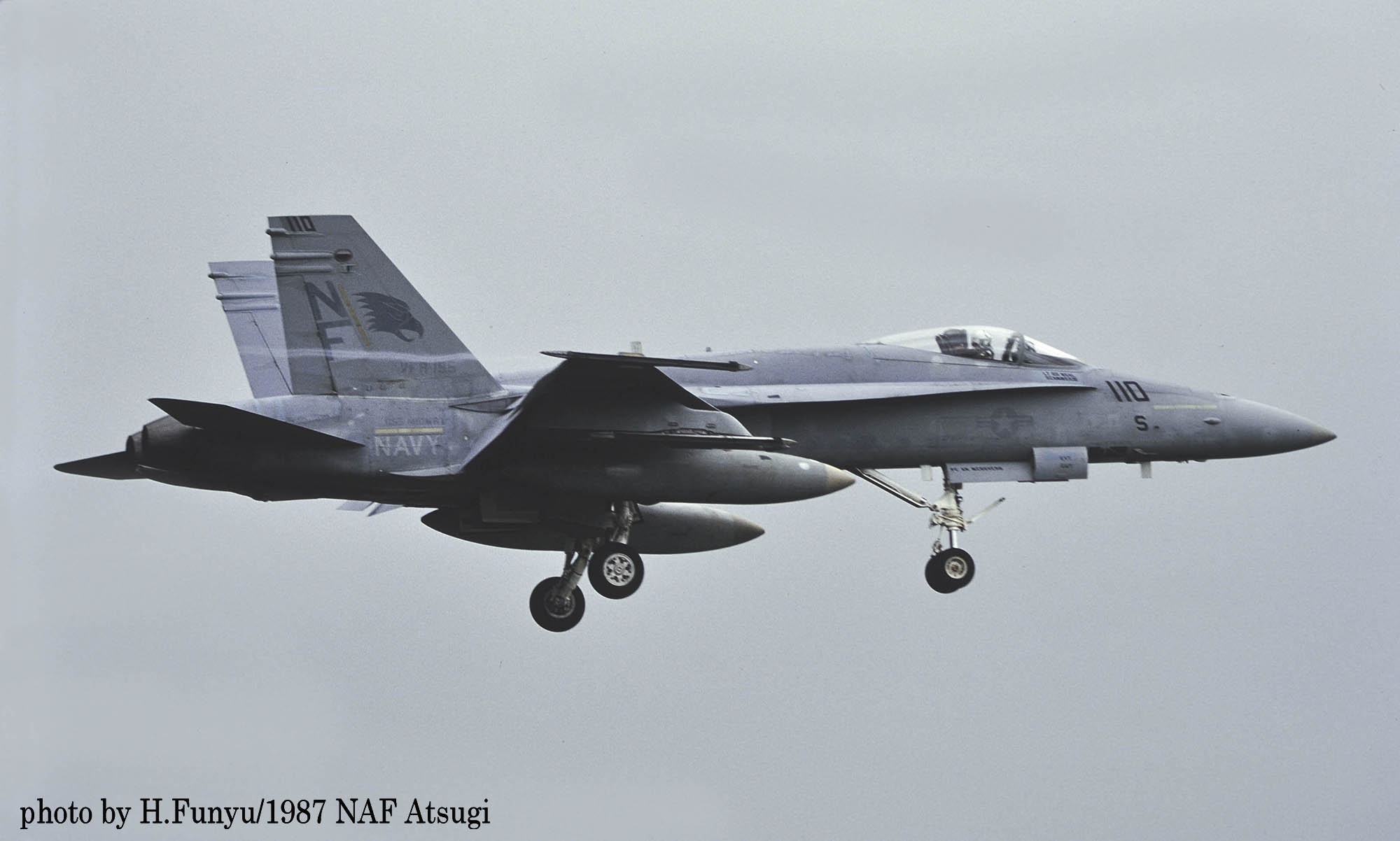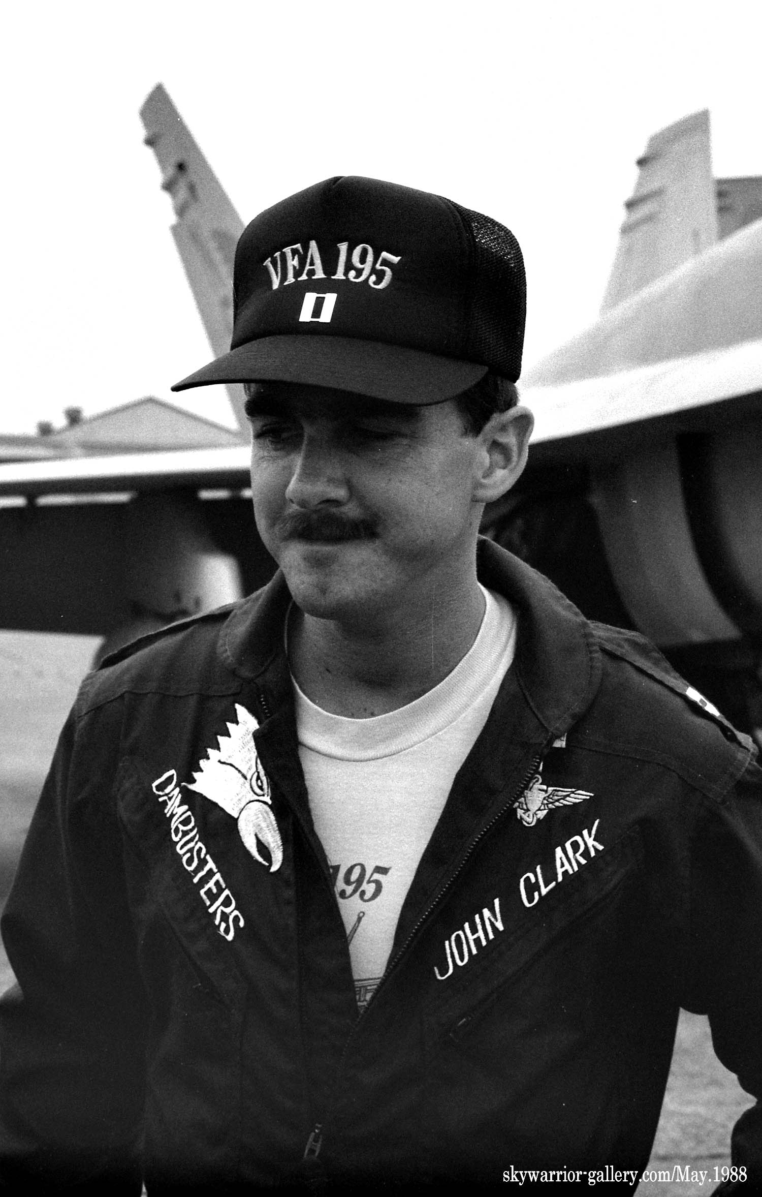1987年の秋、VFA-195飛行隊がCVW-5の仲間入りをして厚木に移動をしてきた。永らくF-4J〜Sと言ったファントム戦闘機に親しんでいた厚木の海軍機ファンにとって、F/A-18は初めて見る海軍の新鋭戦闘機。来日の情報は事前にマニアの察知する所となり、初飛来の日は厚木基地の南側国道沿いは押し寄せたファンで一杯となった。皆が期待していたのが、F/A-18Aの尾翼に大きく書き込んでいるであろう鷲のマークだ。A-7E時代の派手なマーキングでファンを虜にしていた飛行隊だけに、ロービジの時代となってしまったとは言え、VFA-195の新塗装には興味津々で第一編隊が刻々と厚木基地に近づくなか期待が膨らんだ。その日は結局第1陣の4機しか到着しなかったが、次々に舞い降りるVFA-195の尾翼に、うっすらと書かれていたマークに正直とても落胆したのは、今でも覚えている。翌年、厚木の公開で出会ったパイロットのフライトスーツは期待以上に派手なものだったが、戦闘機のマーキングはショーバードを除き、その後も暫くの間は地味さが抜けなかった。