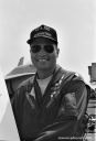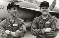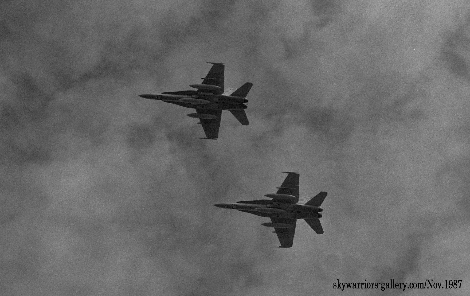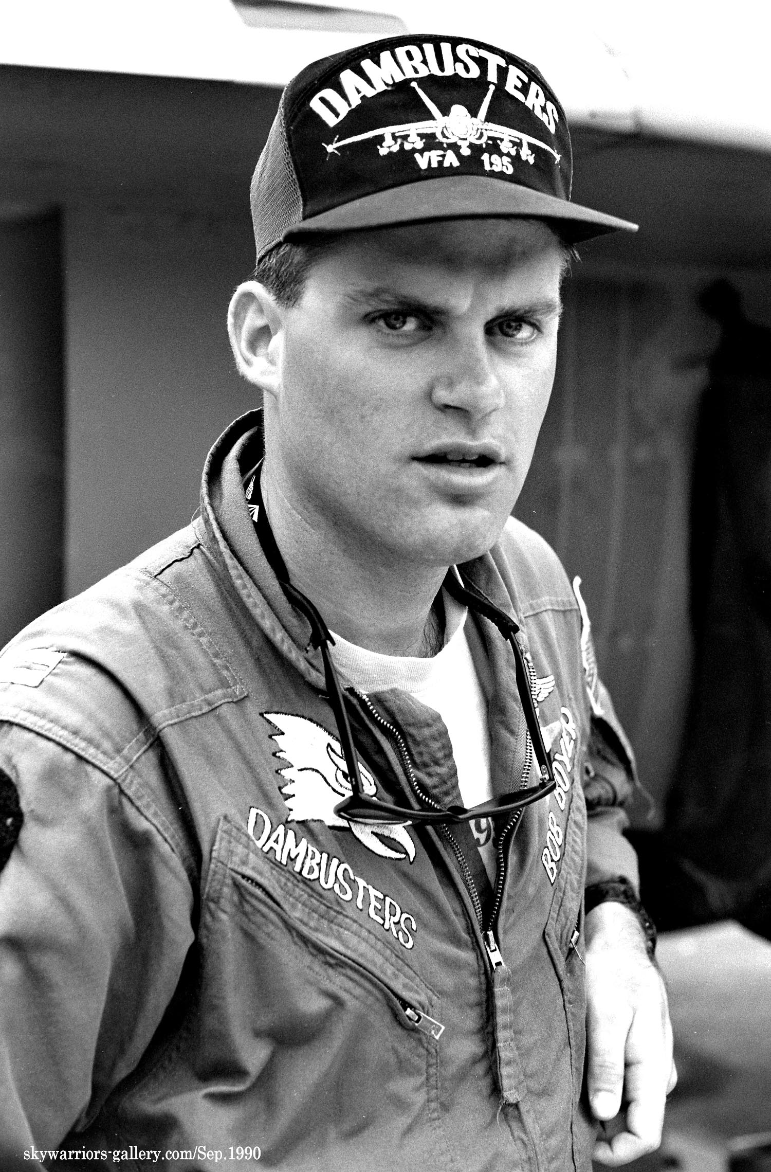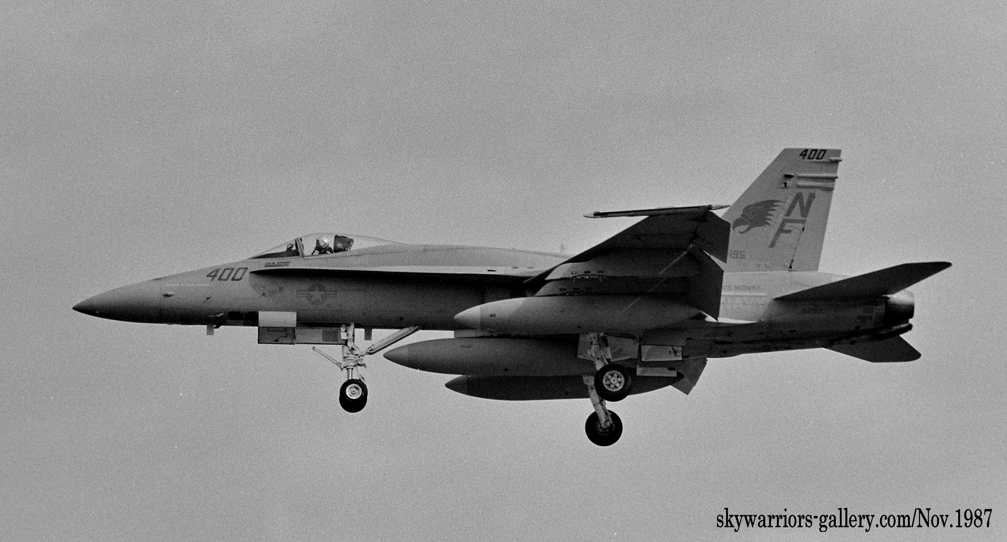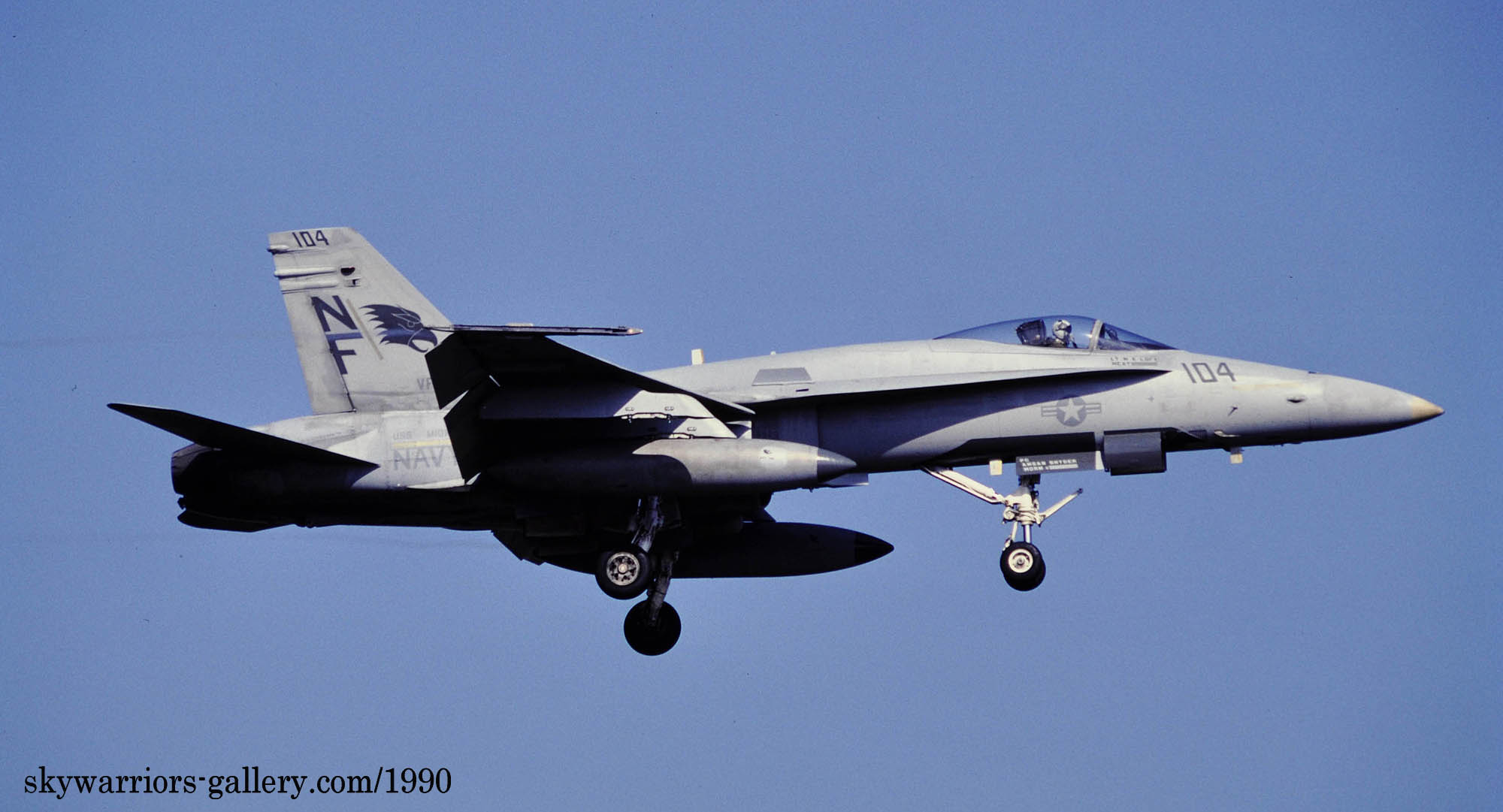 1987年の秋、VFA-195飛行隊がCVW-5の仲間入りをして厚木に移動をしてきた。永らくF-4J〜Sと言ったファントム戦闘機に親しんでいた厚木の海軍機ファンにとって、F/A-18は初めて見る海軍の新鋭戦闘機。来日の情報は事前にマニアの察知する所となり、初飛来の日は厚木基地の南側国道沿いは押し寄せたファンで一杯となった。皆が期待していたのが、F/A-18Aの尾翼に大きく書き込んでいるであろう鷲のマークだ。A-7E時代の派手なマーキングでファンを虜にしていた飛行隊だけに、ロービジの時代となってしまったとは言え、VFA-195の新塗装には興味津々で第一編隊が刻々と厚木基地に近づくなか期待が膨らんだ。その日は結局第1陣の4機しか到着しなかったが、次々に舞い降りるVFA-195の尾翼に、うっすらと書かれていたマークに正直とても落胆したのは、今でも覚えている。翌年、厚木の公開で出会ったパイロットのフライトスーツは期待以上に派手なものだったが、戦闘機のマーキングはショーバードを除き、その後も暫くの間は地味さが抜けなかった。