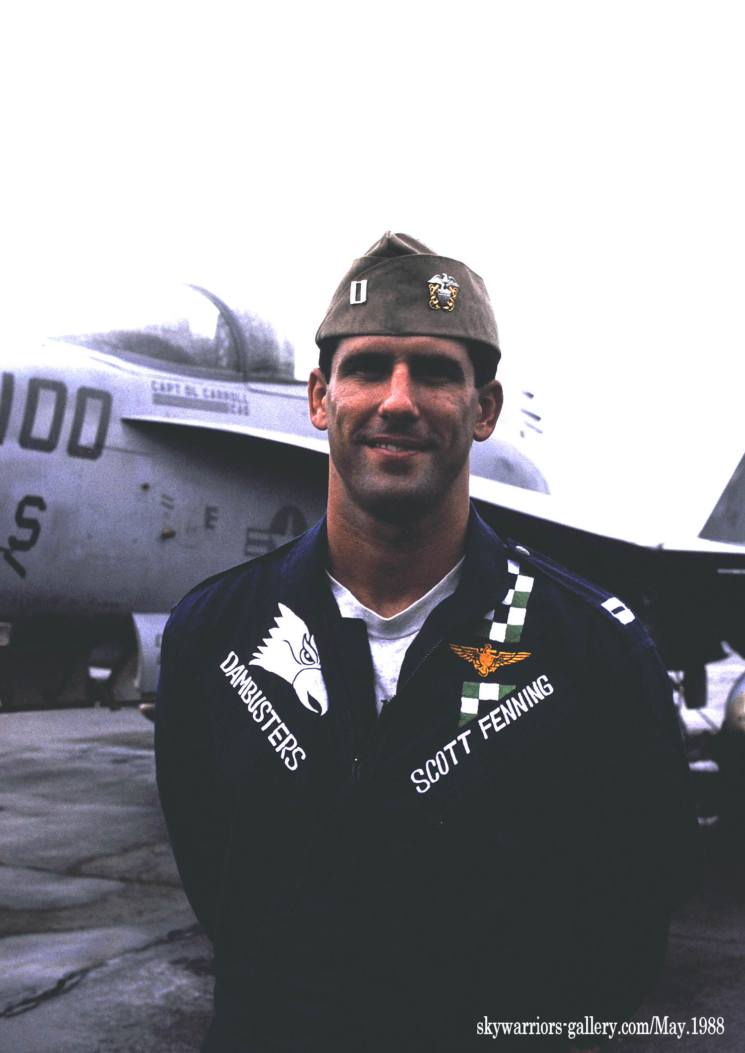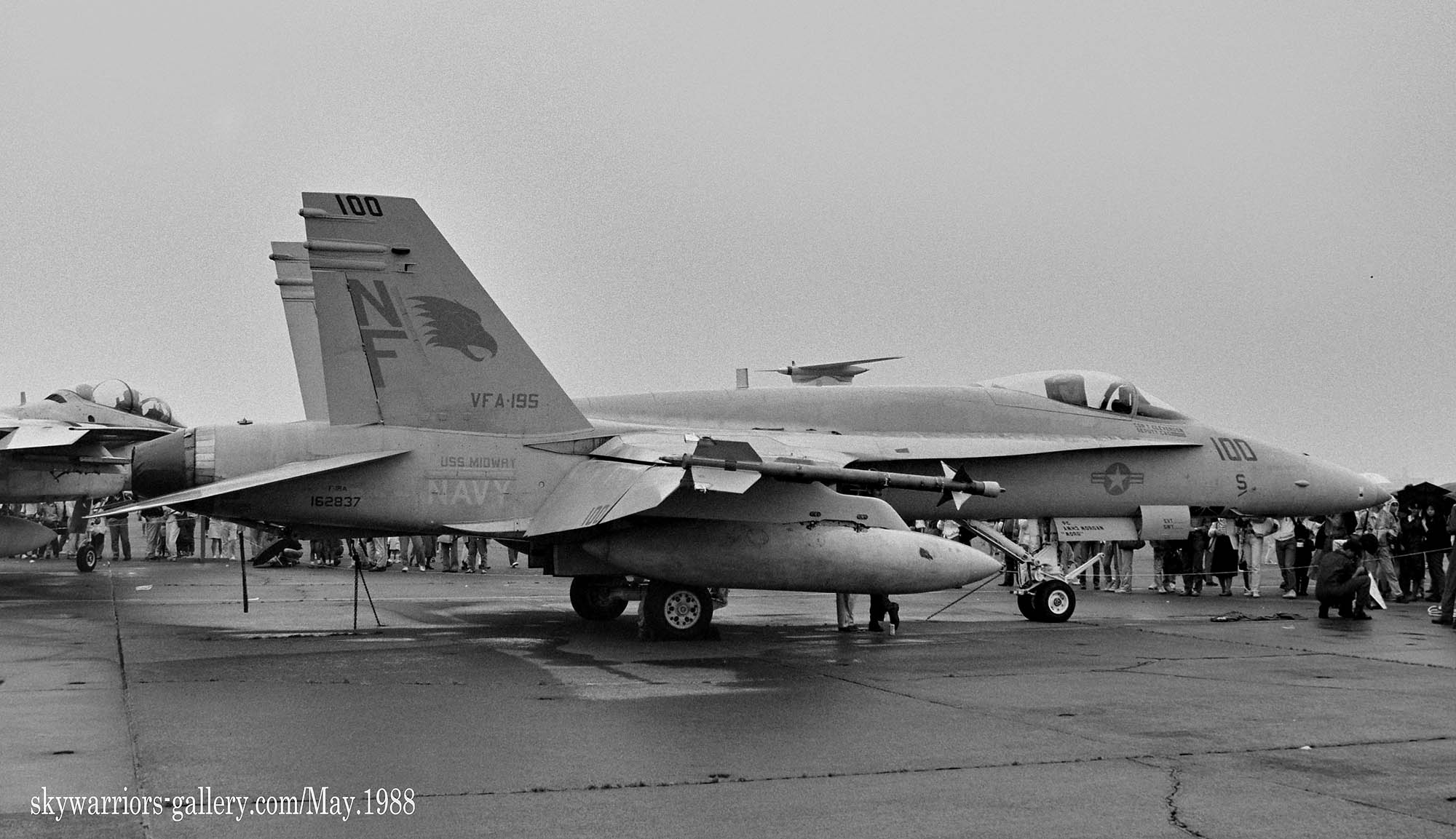 ↑ 同じく1988年に展示されたNF-100の全体像。テールレターは、ラダーではなくその内側に書かれているが、後にラダーに移動することになる。VFA-195は、安全賞を獲得していたらしく 機首に”S”の文字が。