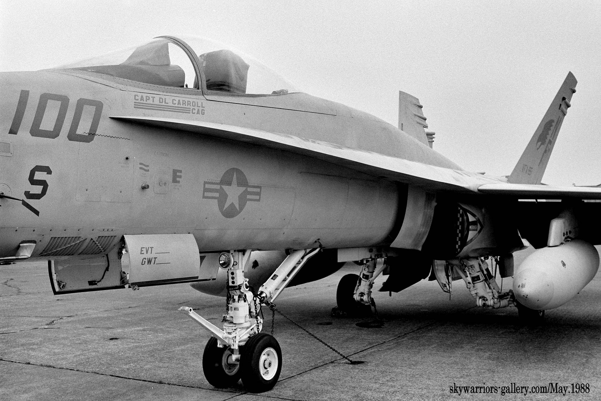 ↑ 展示されたFA-18A/NF-100の機首コクピットラインには、当時の航空団司令”CAG”デーブ・キャロル大佐の名前が書かれていた。彼は元ブルーエンジェルスのリーダーだった人物である。合わせて”CVW-5”のページを参照されたし。