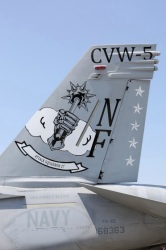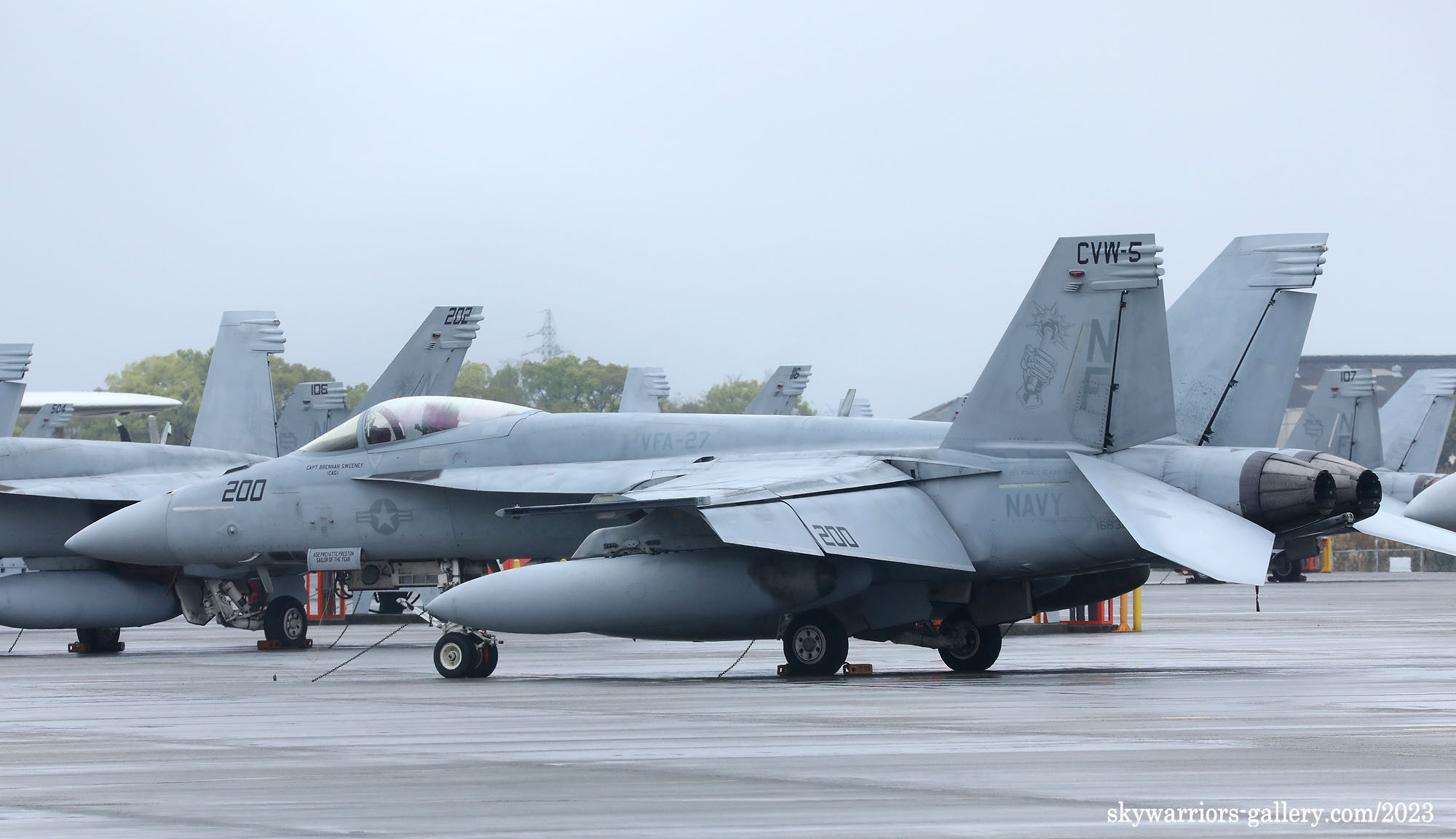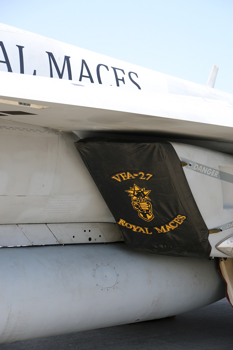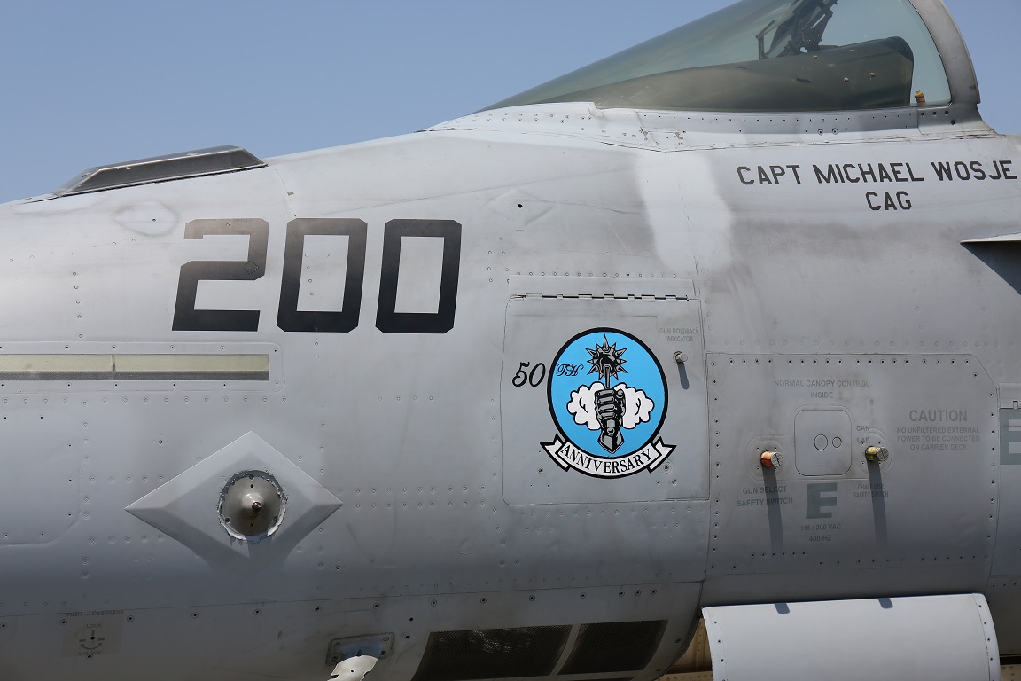 50周年は、伝統に基づいたマーキングでキメたようだ。機首のインシグニアは、A-7A時代のもの 尾翼にも派手なカラーは使わず ロイヤルメイセスの初代インシグニアを模したものを地味な色調で書き込んでいるが、ラダーに並ぶ5つの星がCVW-5の”5”か、50周年の”5”なのかは、不明である。