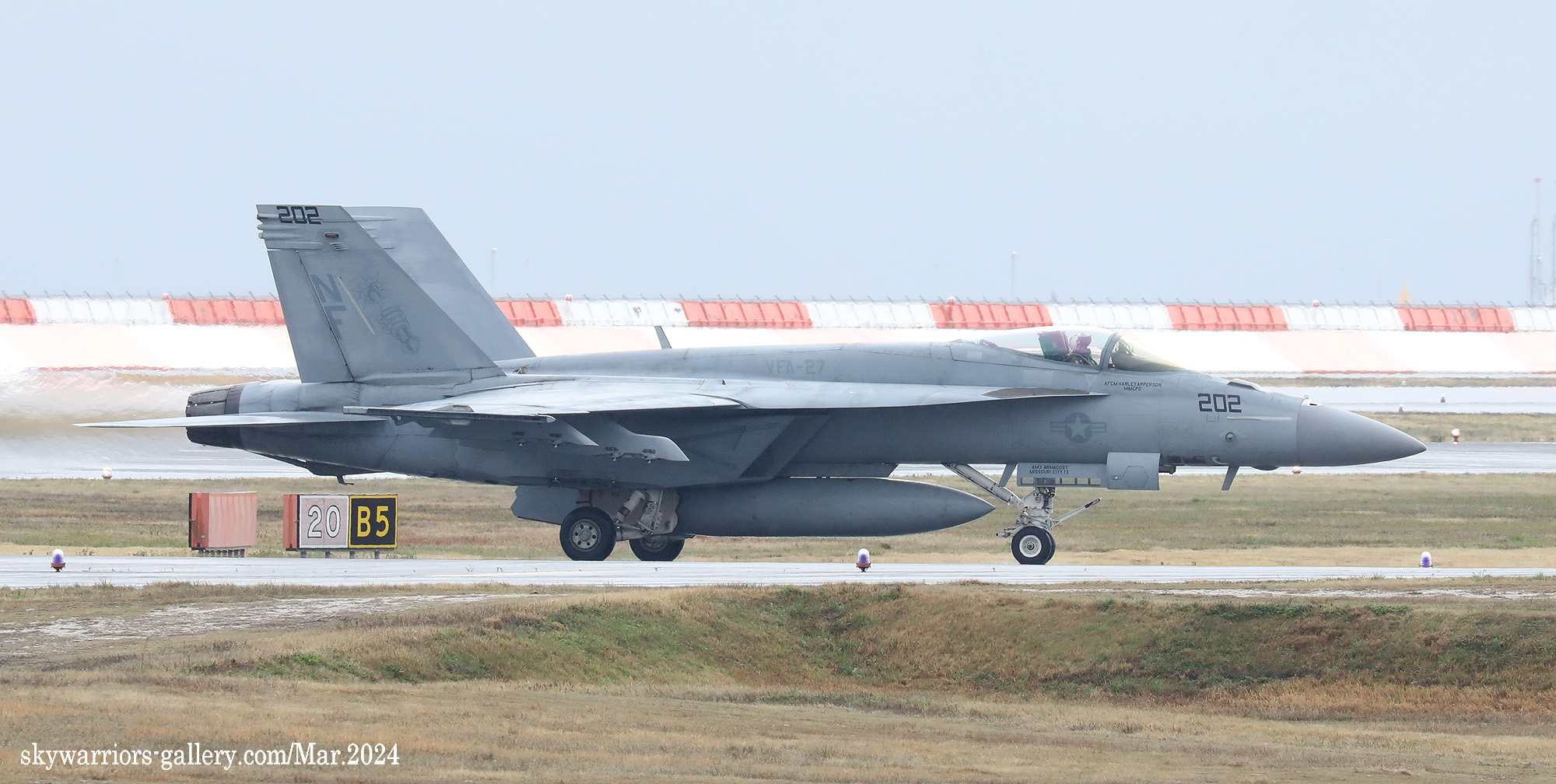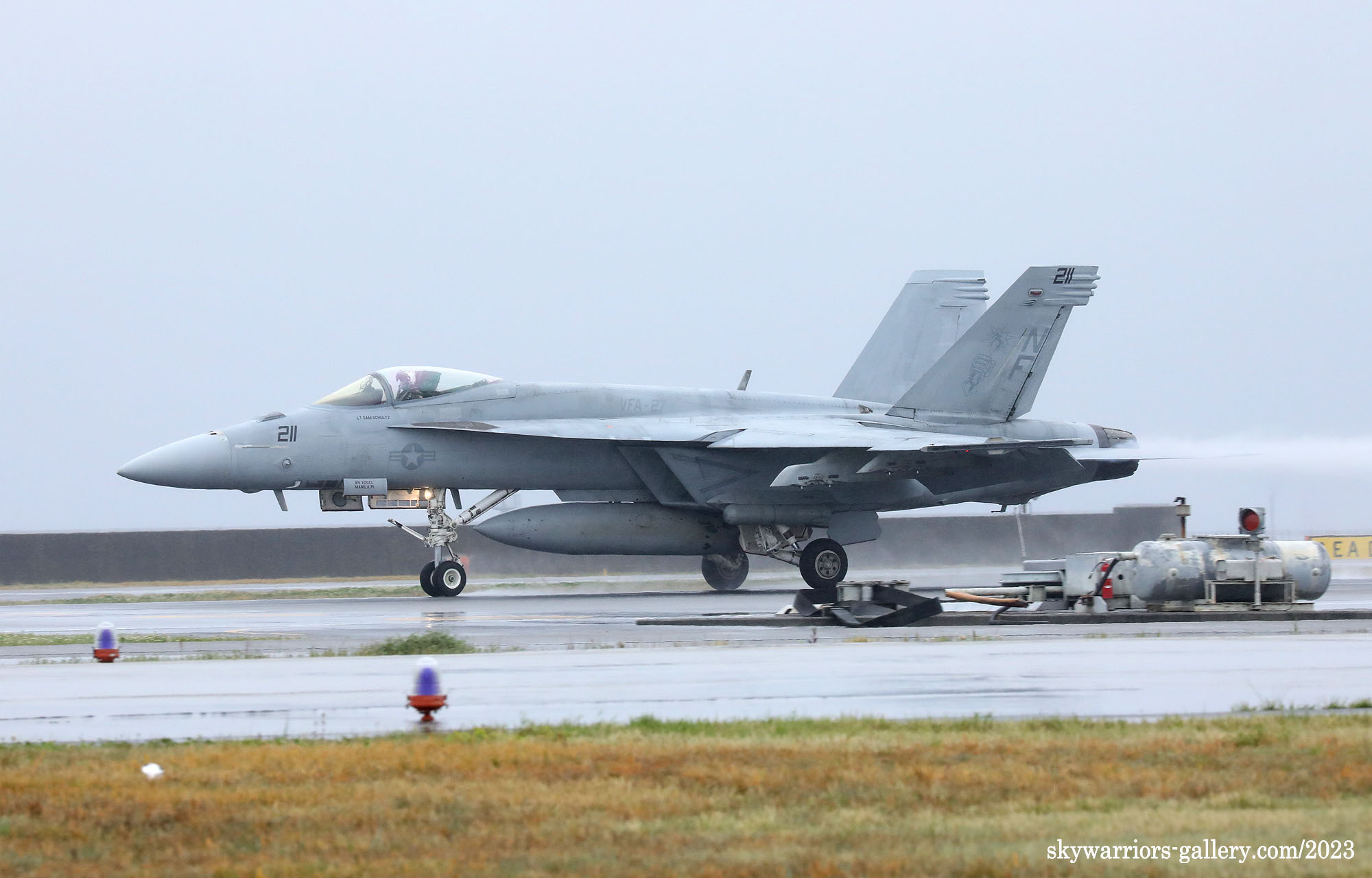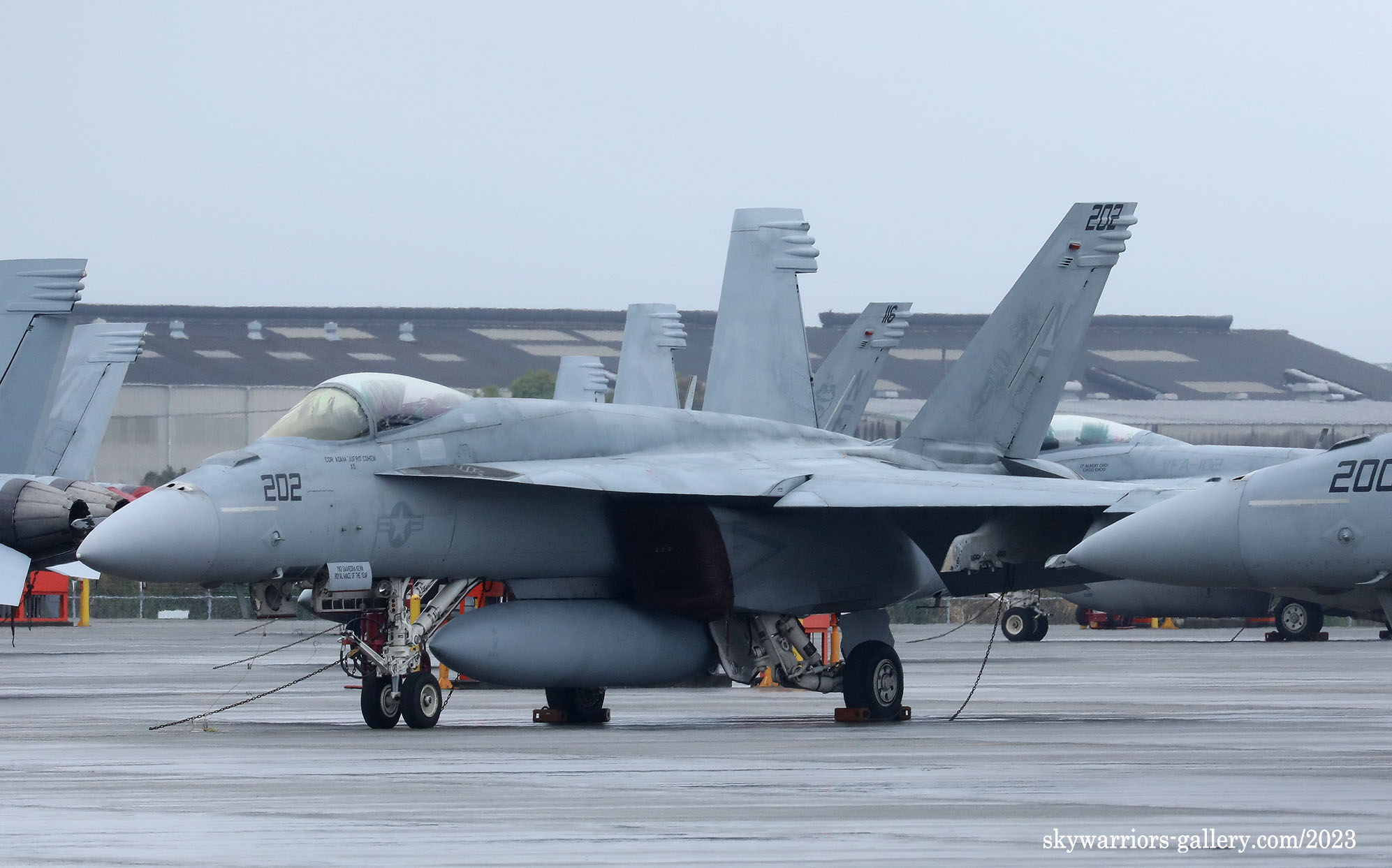 50周年は、伝統に基づいたマーキングでキメたようだ。機首のインシグニアは、A-7A時代のもの 尾翼にも派手なカラーは使わず ロイヤルメイセスの初代インシグニアを模したものを地味な色調で書き込んでいるが、ラダーに並ぶ5つの星がCVW-5の”5”か、50周年の”5”なのかは、不明である。