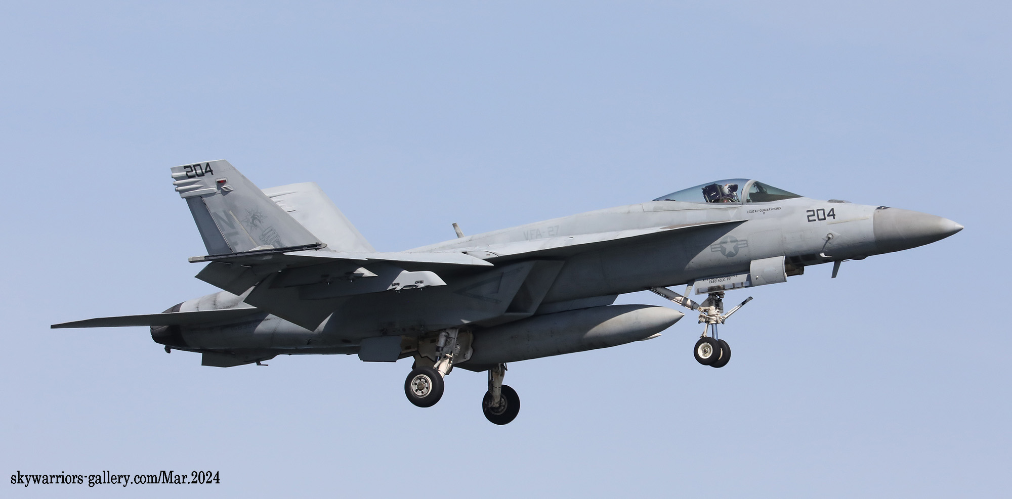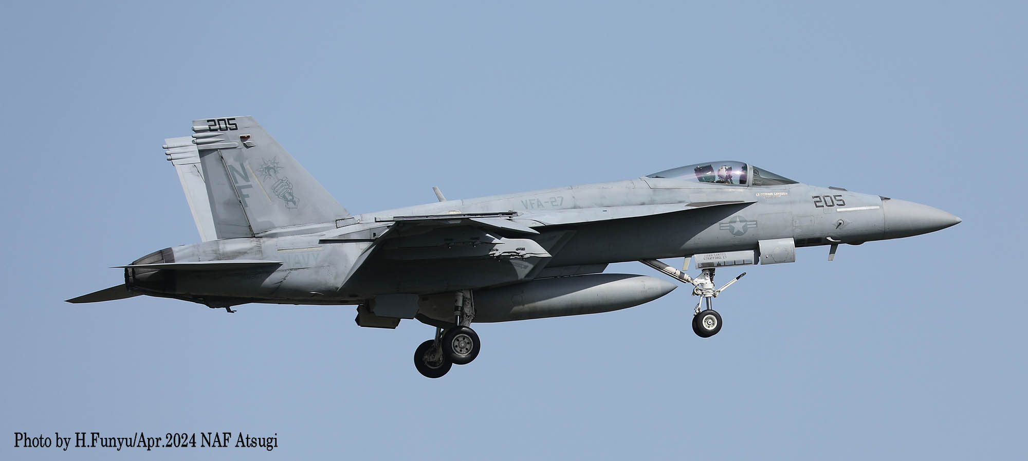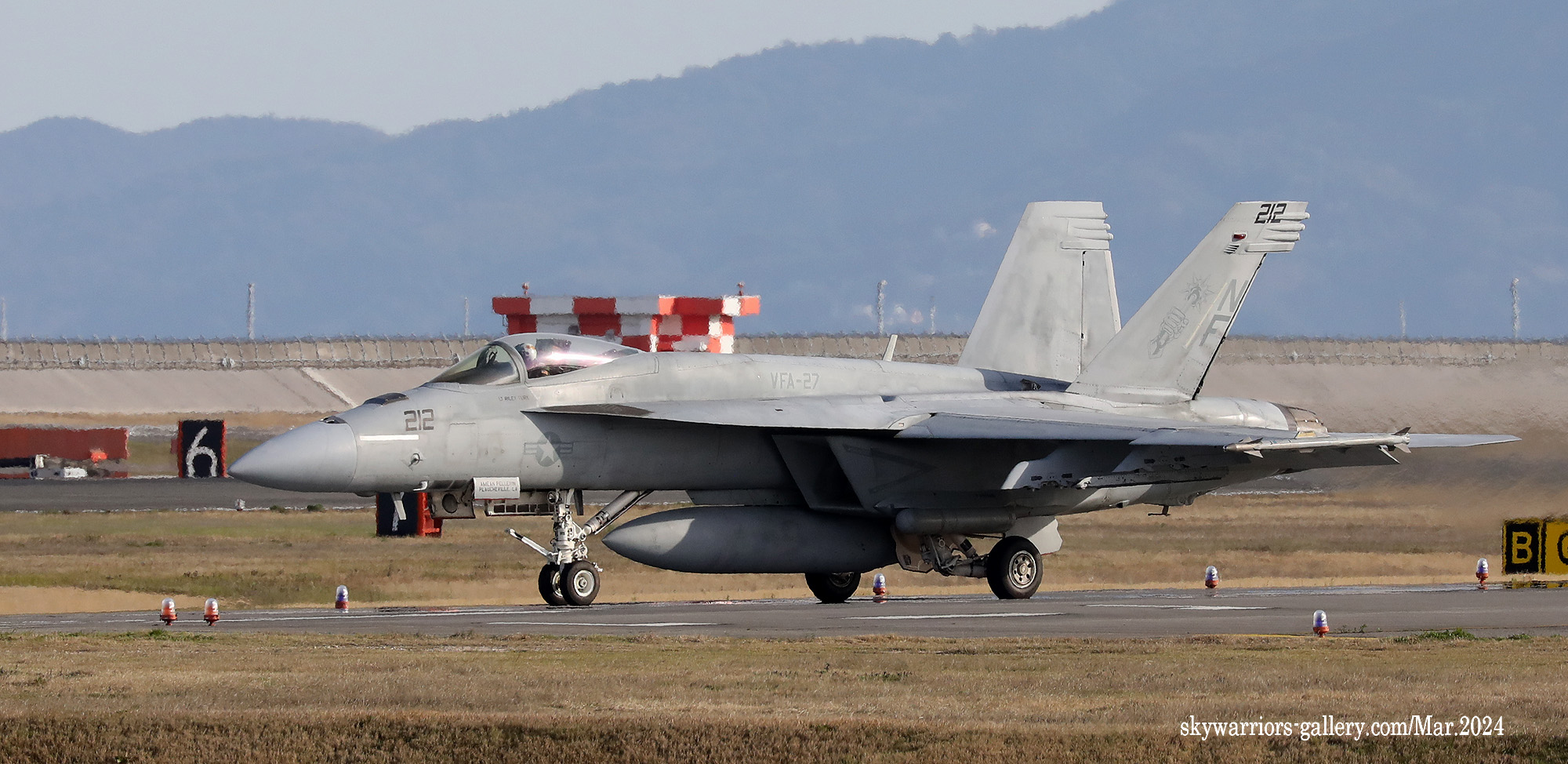↑ 2024年3月27日 岩国基地R/W-20に着陸するVFA-27のFA-18E。岩国では前週までずっと長雨、昨年は雨が降らず水不足だったらしいが、2024年に入り雨の多いhが続いていたそうである。3月25日からの一週間も、1日中晴れたのはこの27日のみであった。この日は天気予報通り朝から晴天、昼前には風が替ってR/W-20となった。CVW-5の面々が一通り離陸した後のランウェイチェンジだったので、ギャラリーの期待は大きかった。