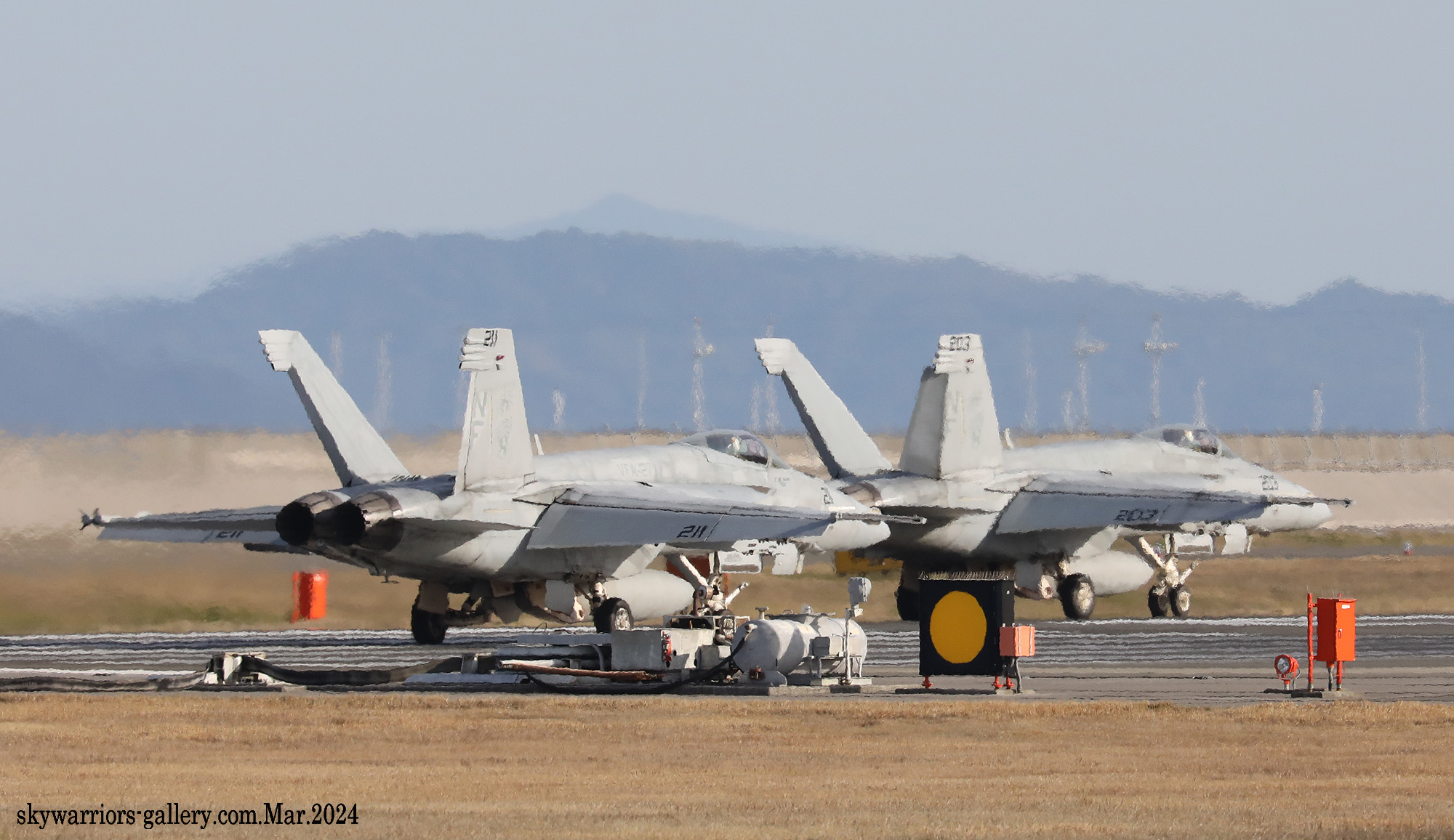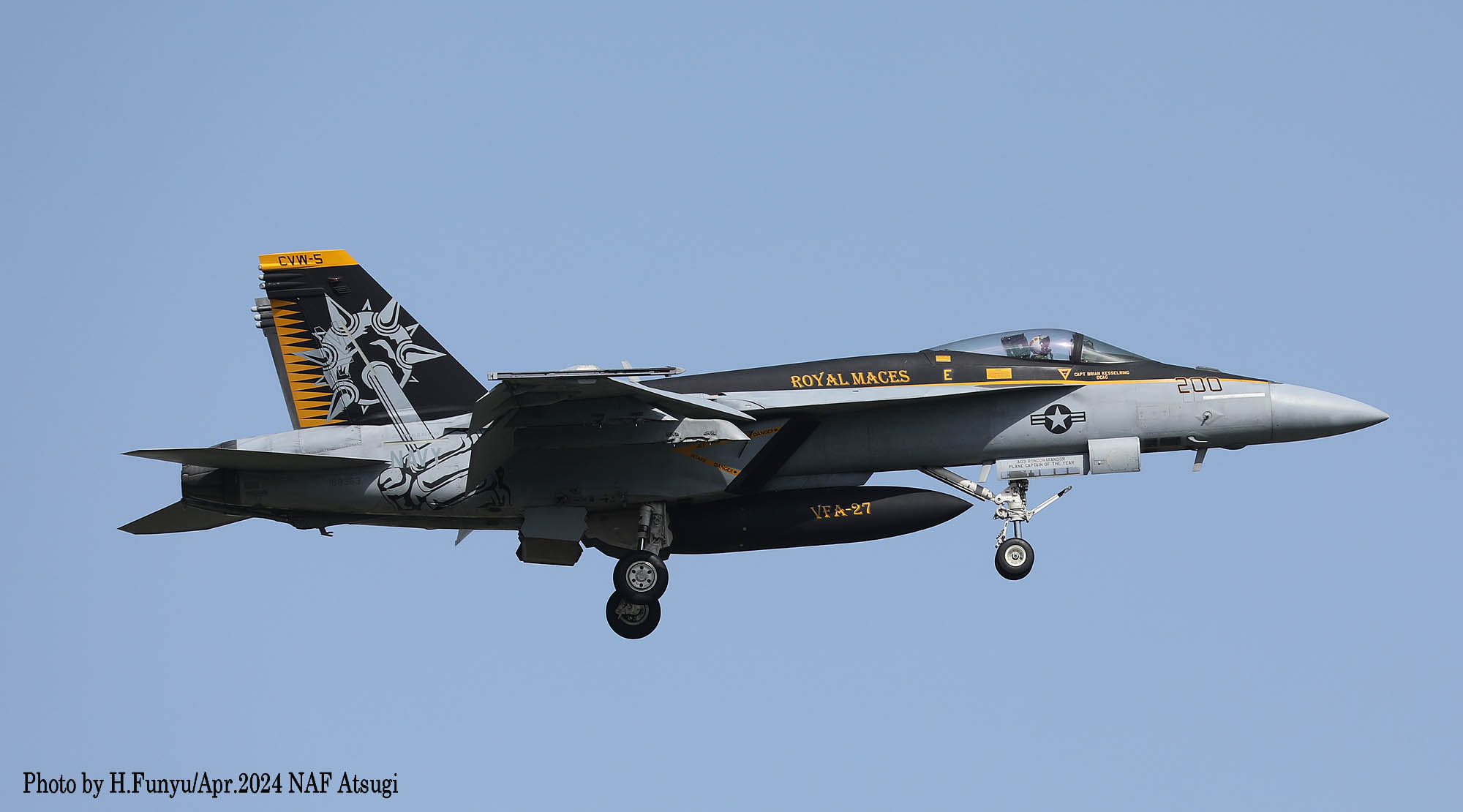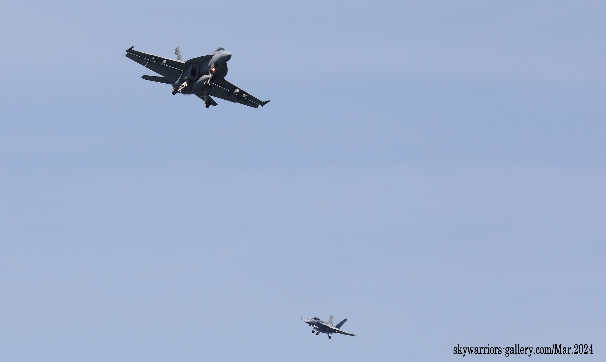 ↑ 2024年3月27日 岩国基地R/W-20に着陸するVFA-27のFA-18E。岩国では前週までずっと長雨、昨年は雨が降らず水不足だったらしいが、2024年に入り雨の多いhが続いていたそうである。3月25日からの一週間も、1日中晴れたのはこの27日のみであった。この日は天気予報通り朝から晴天、昼前には風が替ってR/W-20となった。CVW-5の面々が一通り離陸した後のランウェイチェンジだったので、ギャラリーの期待は大きかった。