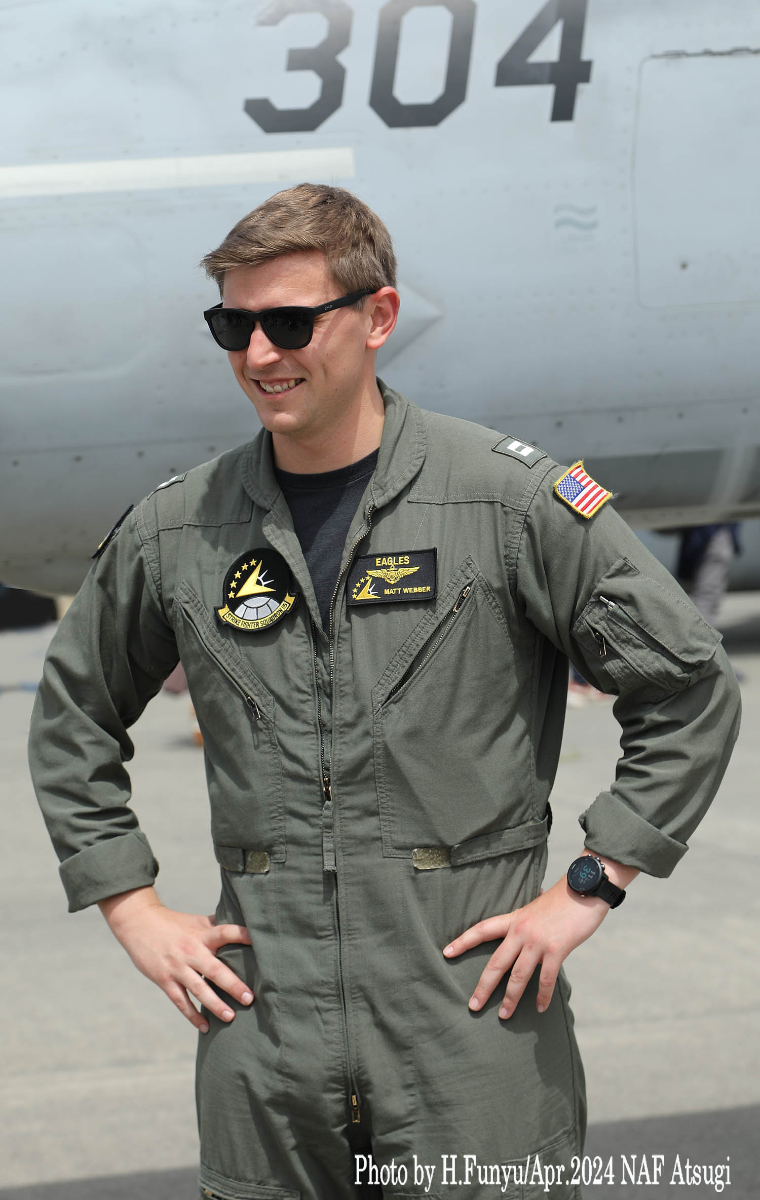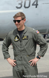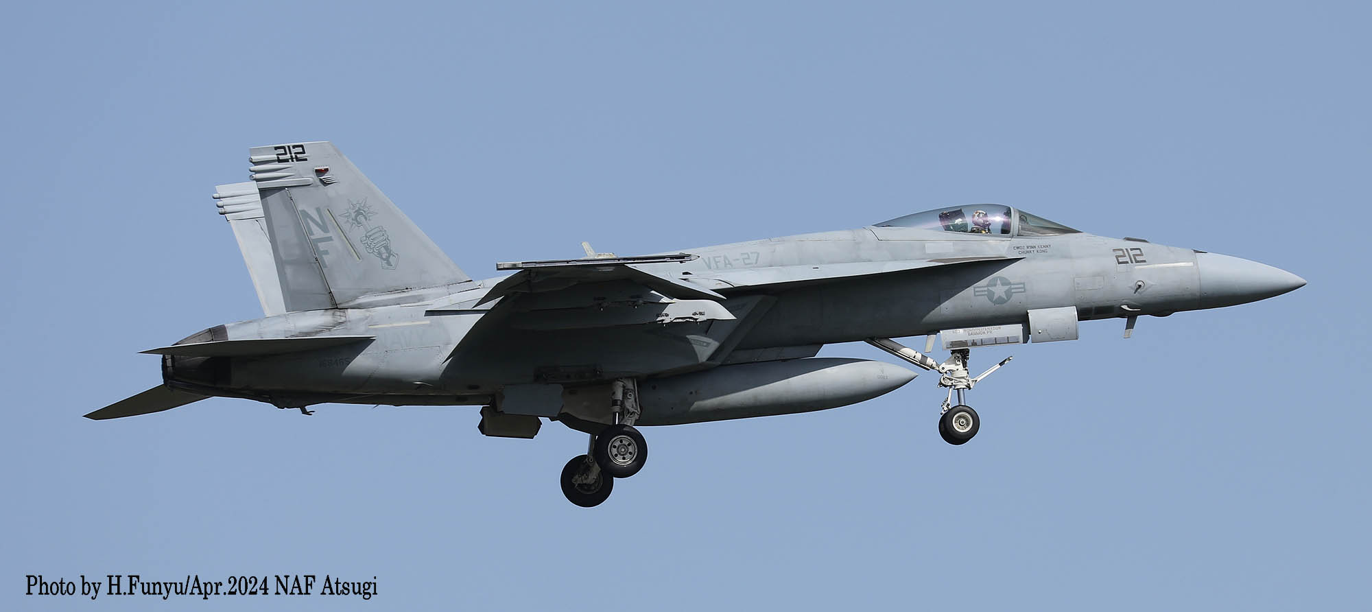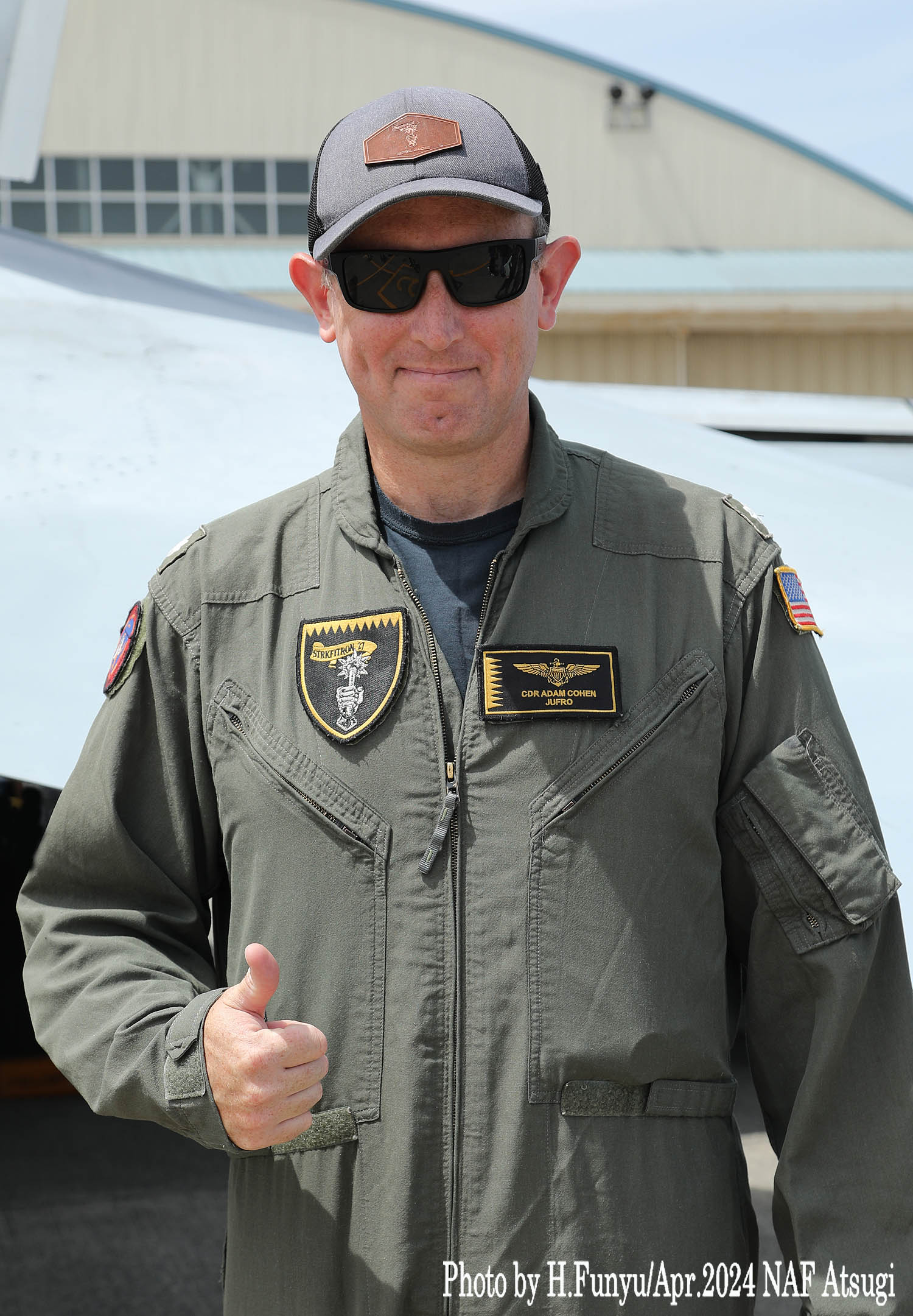 左側の写真は、2024年4月時点でのVFA-27の隊長(コマンダー)アダム・コーヘン中佐。ニューヨーク州出身、2004年に海軍大学を卒業して、VFA-106でFA-18の操縦を学び、VFA-31やVX-9を経て、TOPGUNも卒業したエリートで、3100飛行時間と730回の着艦記録を持つ。