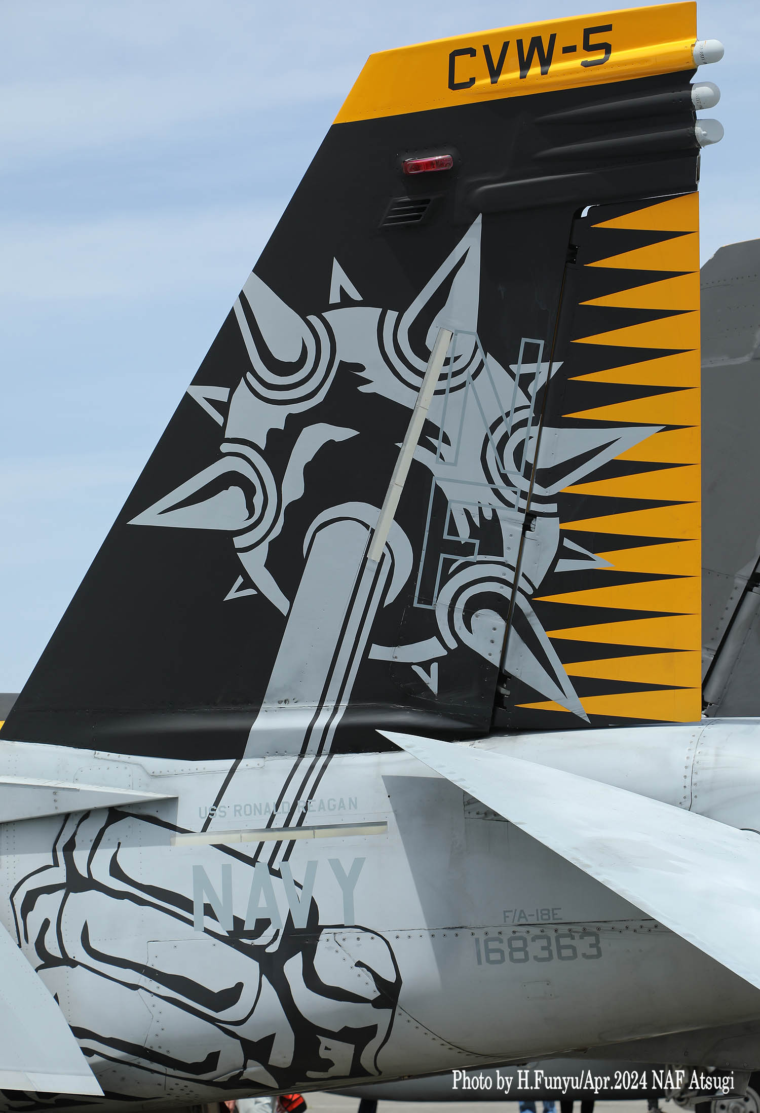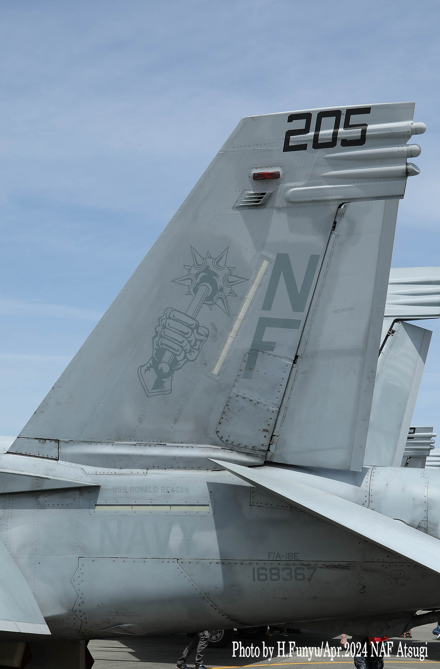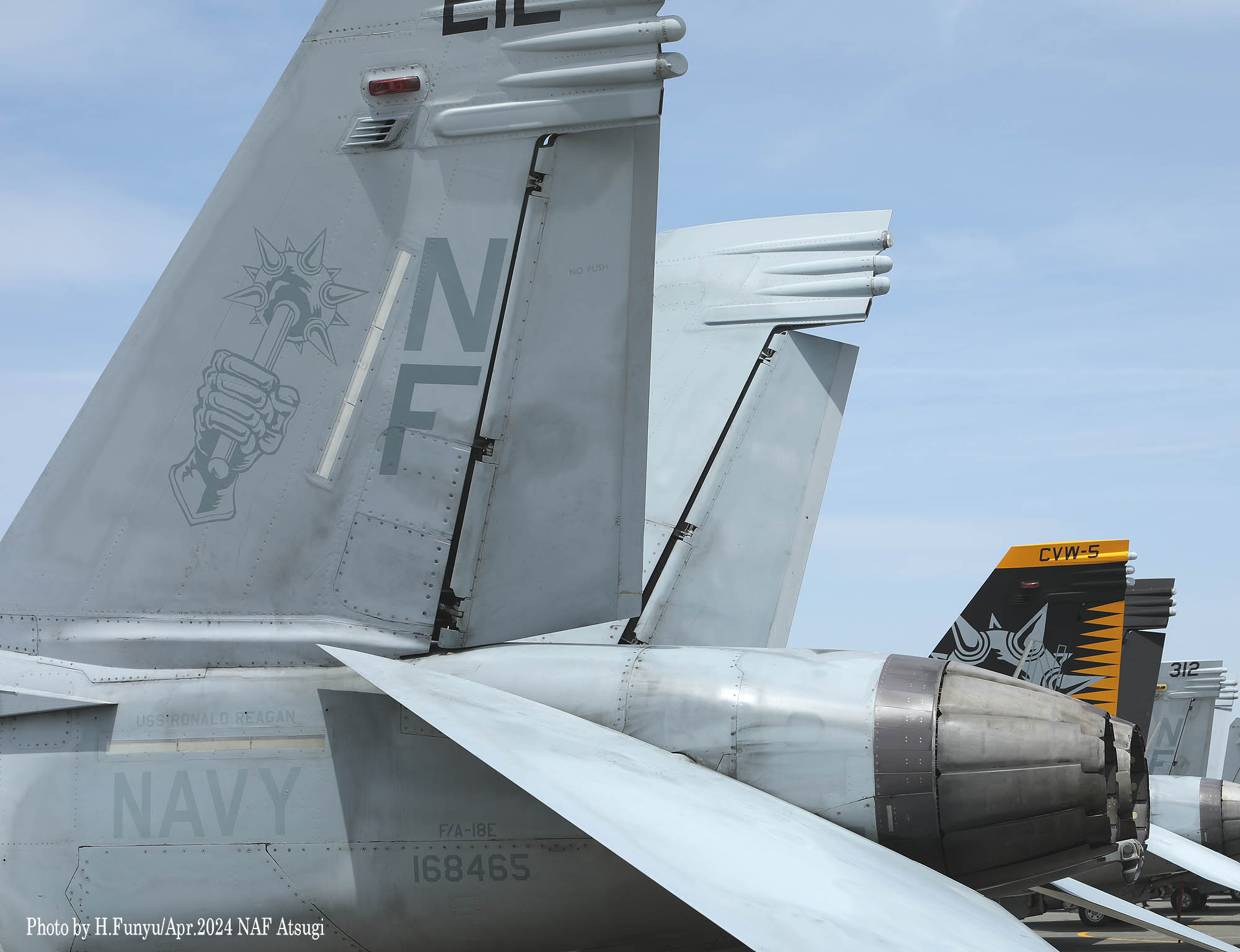 ↑ かつてメースの各機は、A-7時代からの踏襲でラダーに新選組のようなギザギザ模様を入れていたが、スーパーホーネッになって暫くしてから、ラダーへのマーキングの書き込みが戒められ、特別塗装機以外は見られなくなった。恐らくラダーは交換頻度が激しい為に、塗装を施すと部品のやりくりに支障が出るのかもしれない。