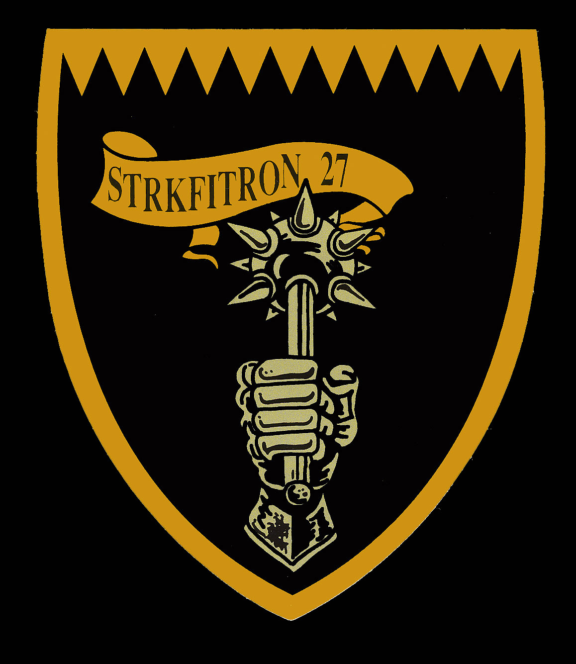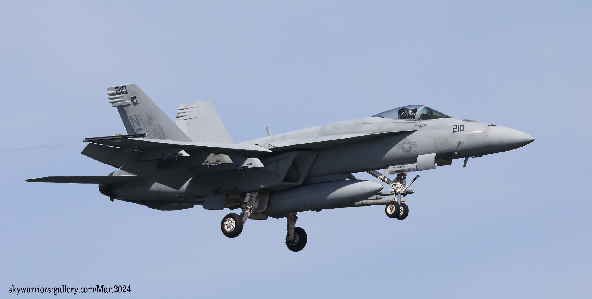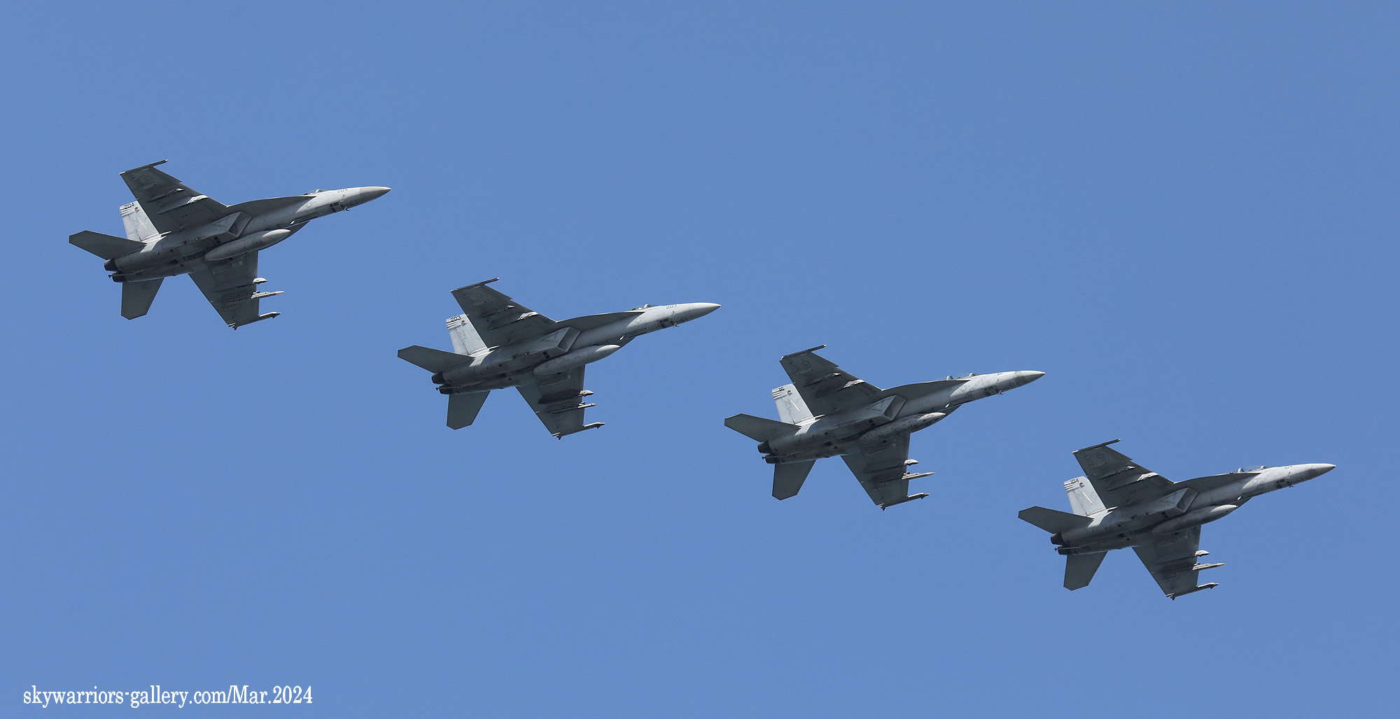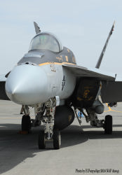 ↑ かつてメースの各機は、A-7時代からの踏襲でラダーに新選組のようなギザギザ模様を入れていたが、スーパーホーネッになって暫くしてから、ラダーへのマーキングの書き込みが戒められ、特別塗装機以外は見られなくなった。恐らくラダーは交換頻度が激しい為に、塗装を施すと部品のやりくりに支障が出るのかもしれない。