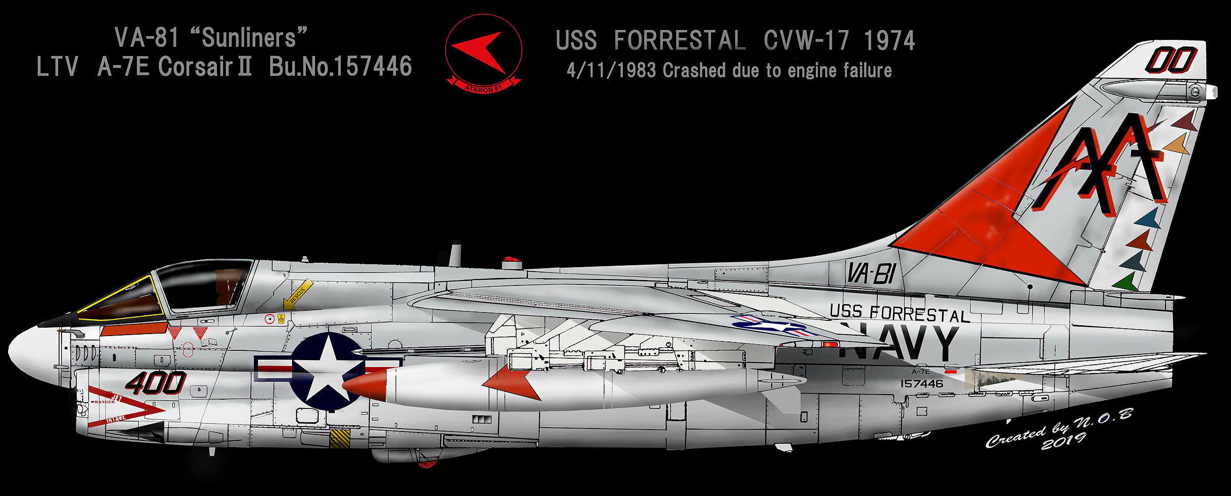1974年当時のVA-81のA-7Aの400番CAG塗装である。尾翼ラダーにはCVW-17各飛行隊のスコードロンカラ―でマッハシェブロンが書き込まれていた。また 機首の20mmガン(M-61A)の砲口付近もシェブロンとデザインをまとめている。USSフォレスタルに載っていた期間は1971年から1982年の11年間と長い。1974年には同じNATO軍の一員であるトルコとギリシャとの間で紛争となったキプロス紛争時、地中海上のフォレスタルからキプロスの上空監視任務にも就いている。