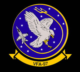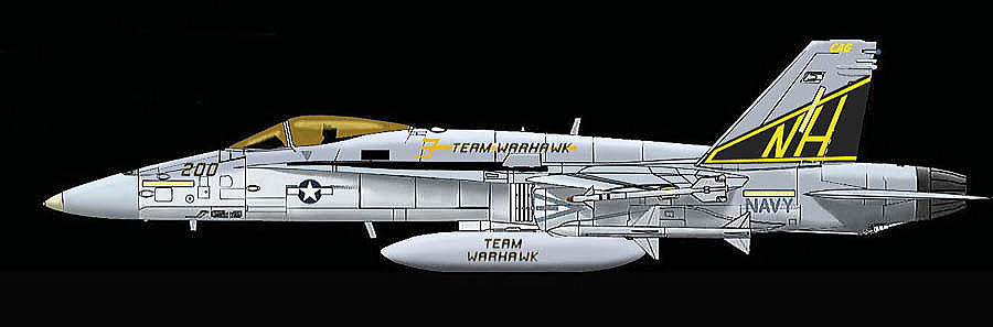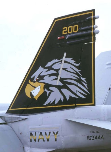 A-7E時代のマーキングをそのままFA-18Aに踏襲した時代のもので、こうして見るとセンスが良い塗装に見える。しかしA-7時代の青い基調のテールを見慣れた人から見ると色使いやシェブロンのラインの流れに違和感のあるマーキングなのだ。USSカールビンソンに載って航海に出た際にCAG機のみ、この派手なマーキングが施されていたが、他の機体はグレーのツートーンである。尚、尾翼内側にはVFA-97の新しいインシグニアが書き込まれていた。