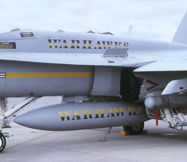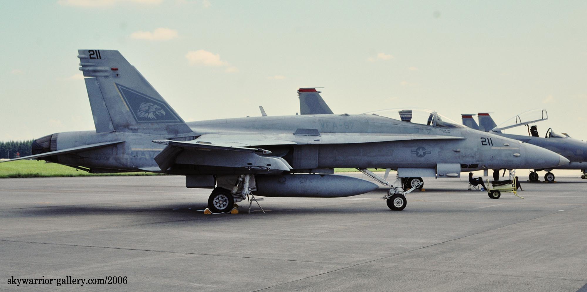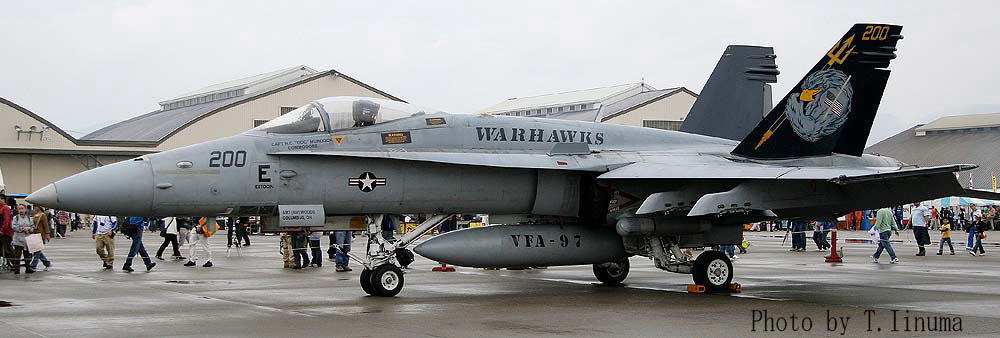 最初にこの部隊が岩国に来たのは2004年9月で、ポール・マックレイ中佐に率いられ派遣されたF/A-18はC型であった。2004年3月にA型からC型に機種更新を終え間もなくして配備されたのだ。”戦う鷹”部隊は、従来のマーキングからシンボルの鷹をアメリカ風アニメに書き換えた派手なものに変わった。何と鷹のくちばしの中にきらりと光る歯が書かれている。2005年のトリプルナッツ(163769)は、他の機体と同じマーキングで背中は”VFA-97”となっていたが、一度リムーアに戻り塗り直されたこの機体は、尾翼一杯をキャンバスとし”WARHAWKS”の文字が背中にも増装タンクにシツコイ程書き込まれていた。