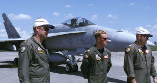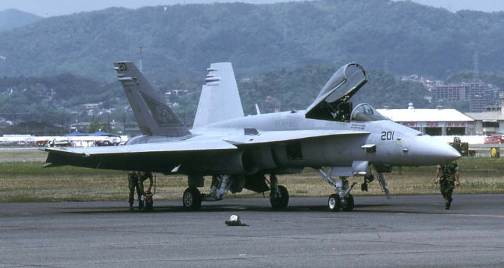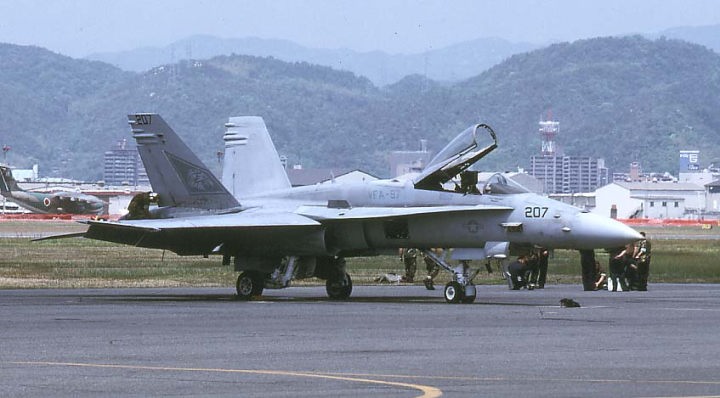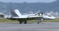 A-7時代から航空母艦に艦載され運用されてきたVA-97は爆撃など攻撃任務を主としていた。それがF/A-18Aを受領してから戦闘機の任務も兼ねるようになり、C型に更新されたらローテーションで岩国基地に半年間配備されるという・・・そうなれば軍用機マニアの端くれとしても、5月の岩国基地公開日には絶対に行かなくてはならない。2004年5月早速彼らに会いに出かけた。