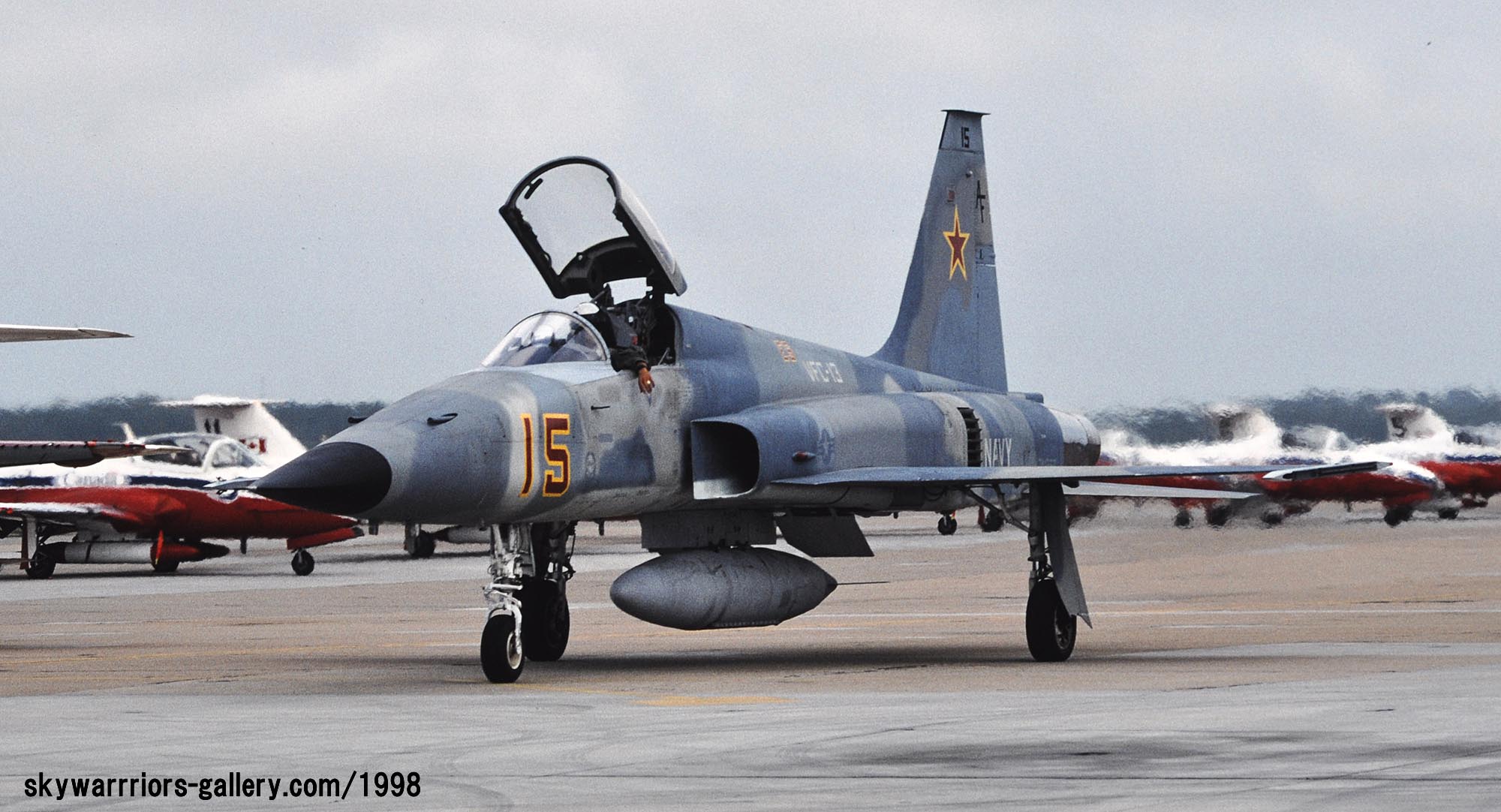 ↑ この塗装スキームは、唯一”21”にしか確認できないが、この機体F-5E(160792)は映画トップガンで黒いMig役を演じたF-5Eとの事で、長い間海軍で使われたベテラン機。パイロットの証言ではこの塗装は、濃淡がはっきりし過ぎて、夏場は良いが冬の雪景色の中では致命的に目立ってしまったそうである。