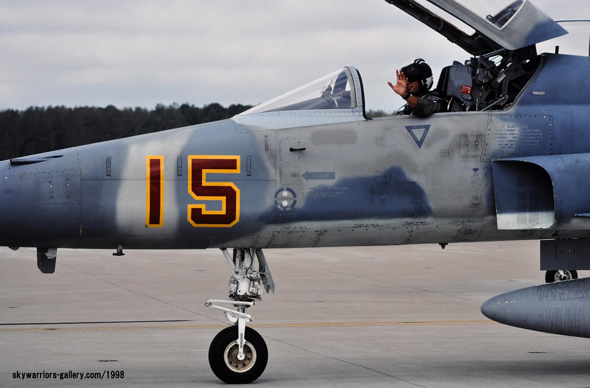 1998年のオシアナ基地イベントでタキシングするVFC-13のF-5E。ニューブルー・スキームと言われた塗装パターンでるが、色は3色以上使われている。