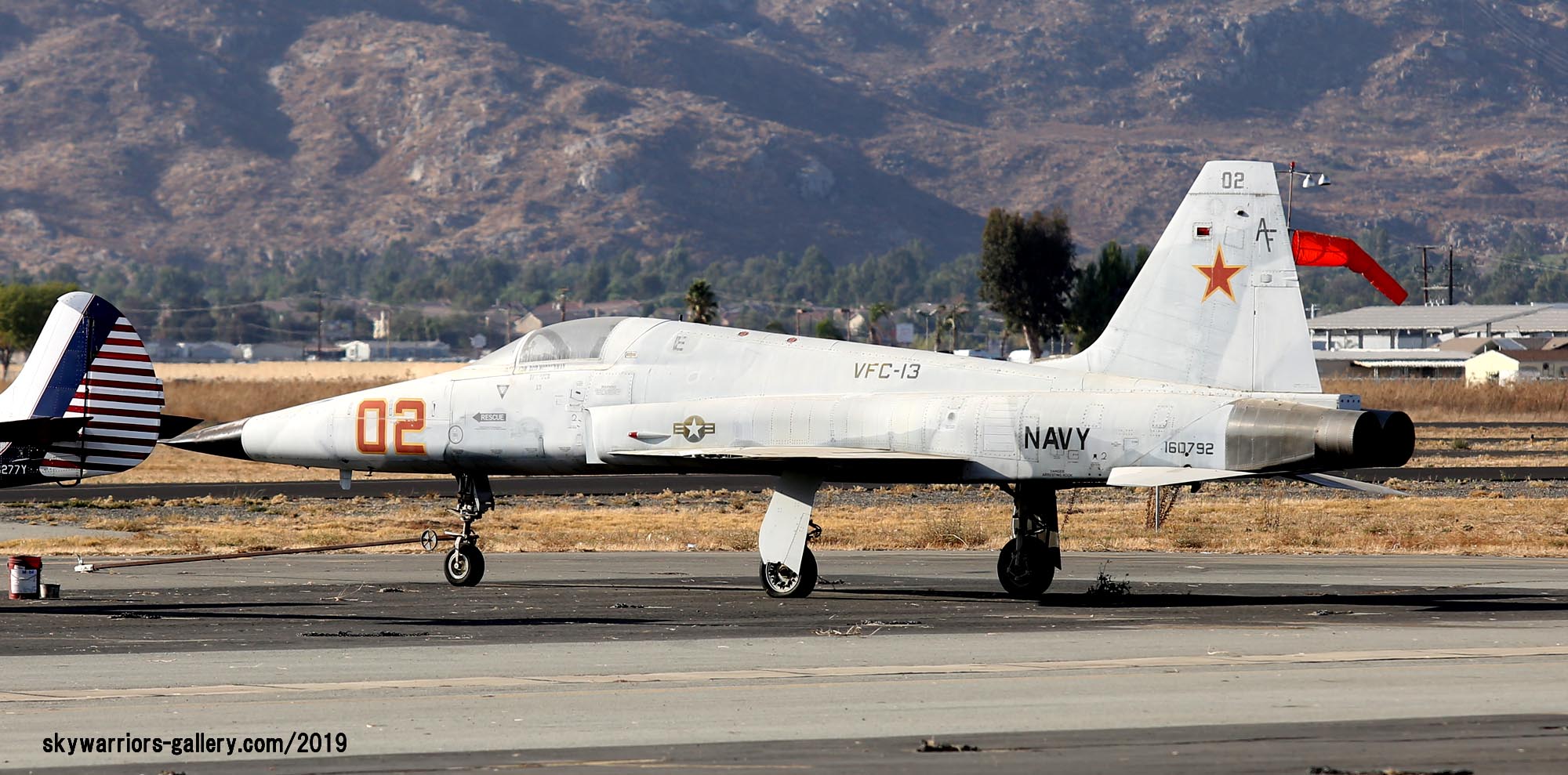2019年12月 カルフォルニア州のエメット・ライヤン飛行場に置かれた元?VFC-13のF-5E(160792)、塗装は色落ちしており、この時すでに引退していた機体だと思うが、塗装は当時まま一切の手が加わっていなかった。F-5Nは機能強化としてチャフや電子ポッドを携行する能力を持っていたが、新型機が携行するAIM-9Xなどの最新のミサイルには対応しきれず、次第に敵戦闘機役としての役割は限界を迎えている。