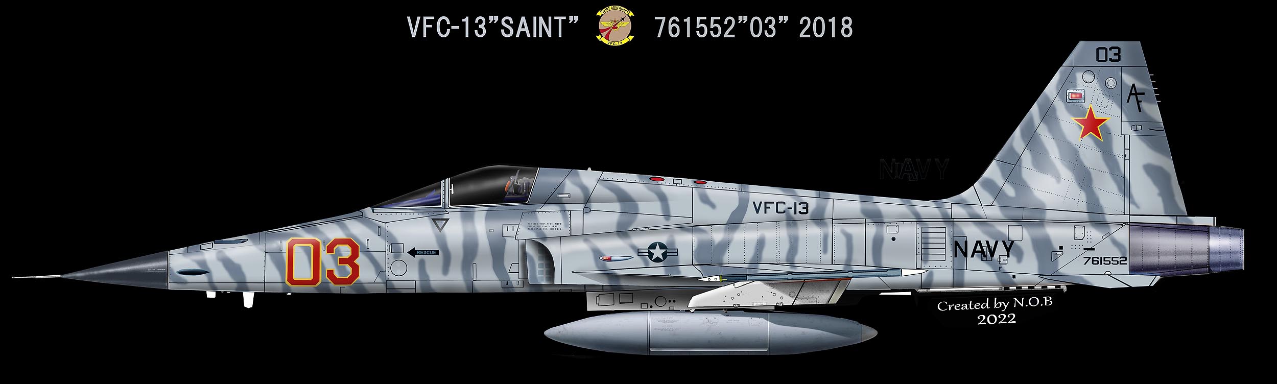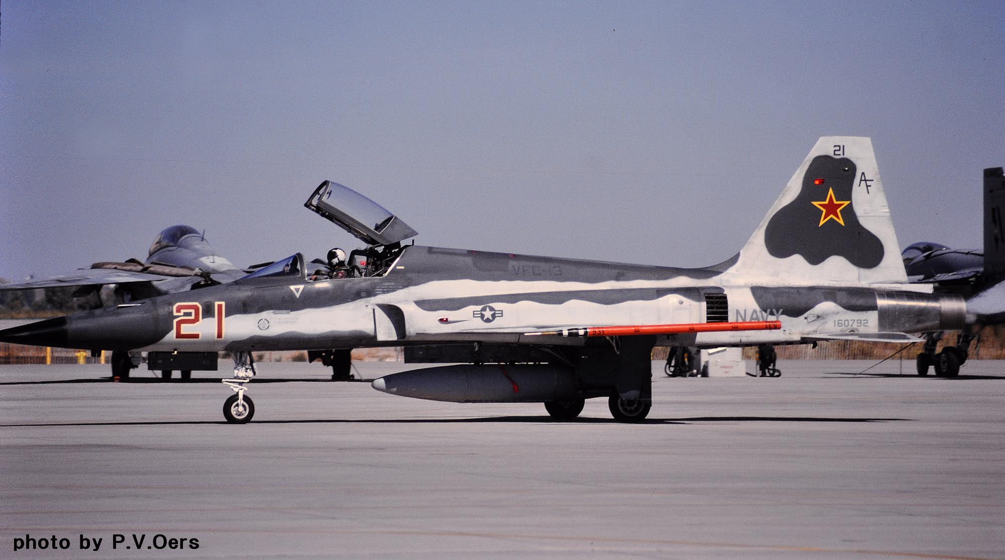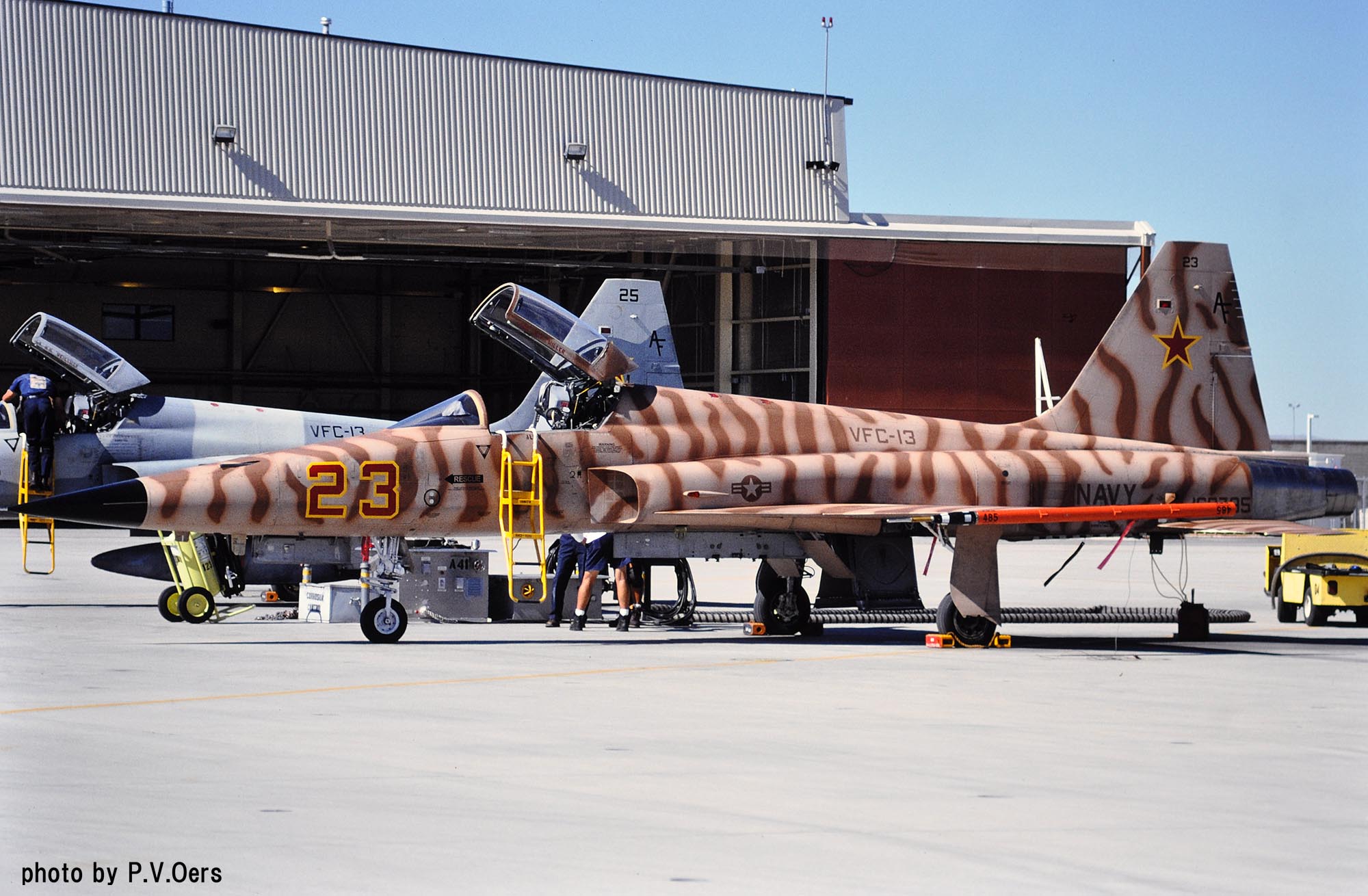 機首が切れてしまっているがVFC-13の独特な迷彩塗装を施した機体で、航空専門誌でも時々取り上げられたマーキングである。このカーキ色の細い虎柄マーキングは、ブラウンタイガー・スキームとも呼ばれ、Modex”23”(150795)と”05”(160795)の2機が確認されている。VFC-13はVF-127のF-5E同様、オールブラックのF-5Fなども存在し、東側のVFC-111と共にF-5Eファンを魅了する存在だった。