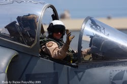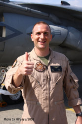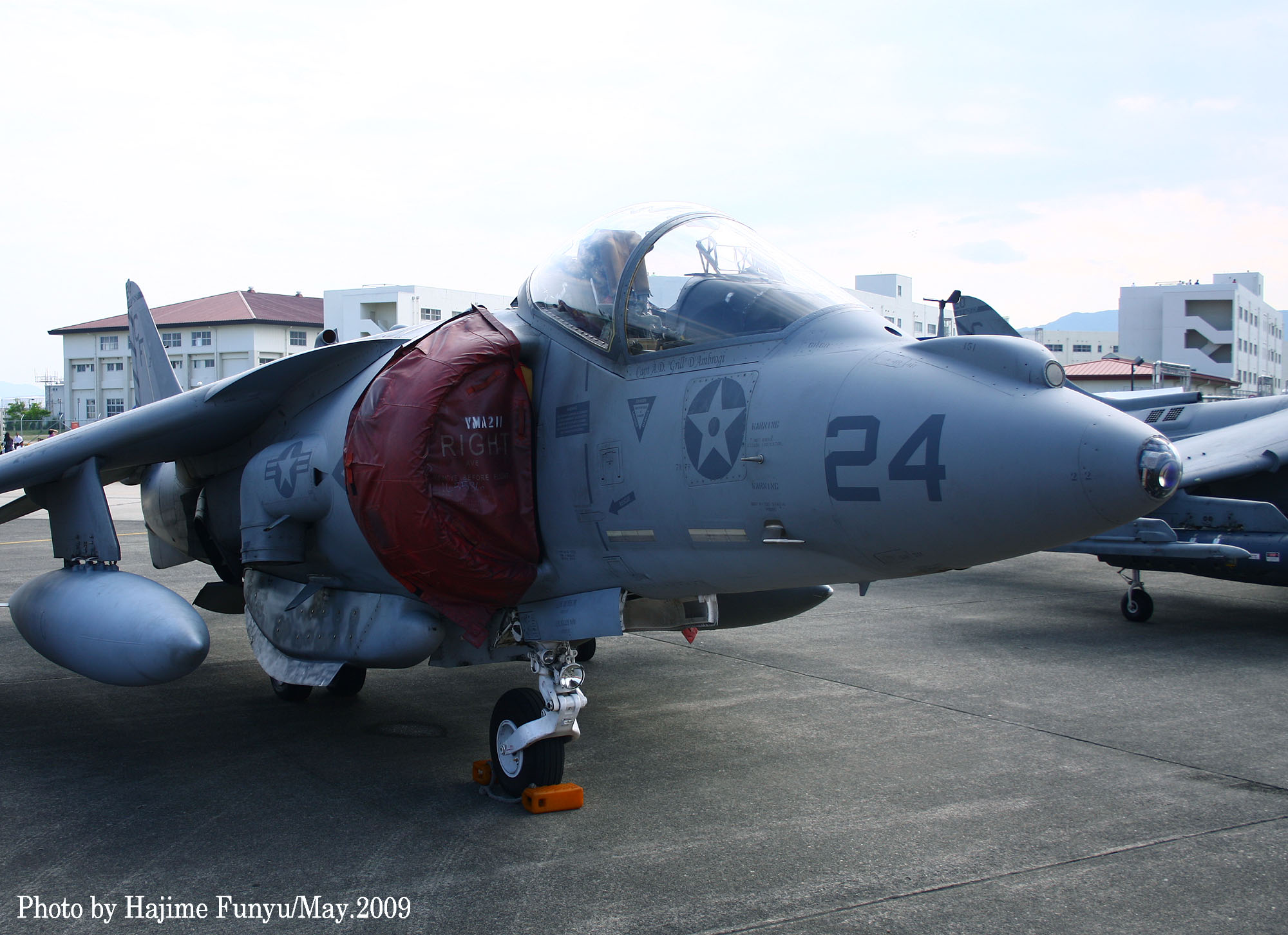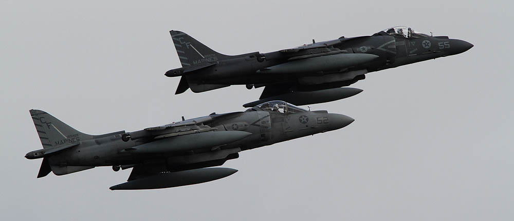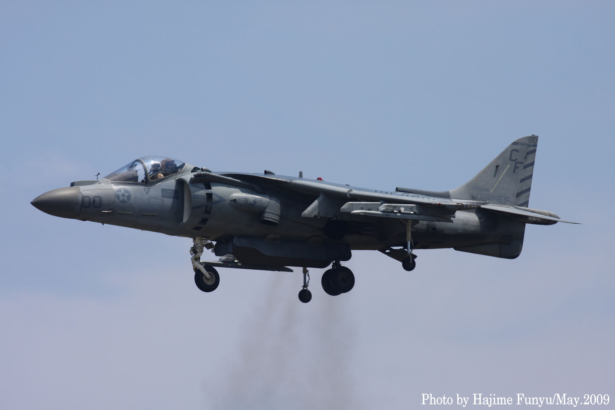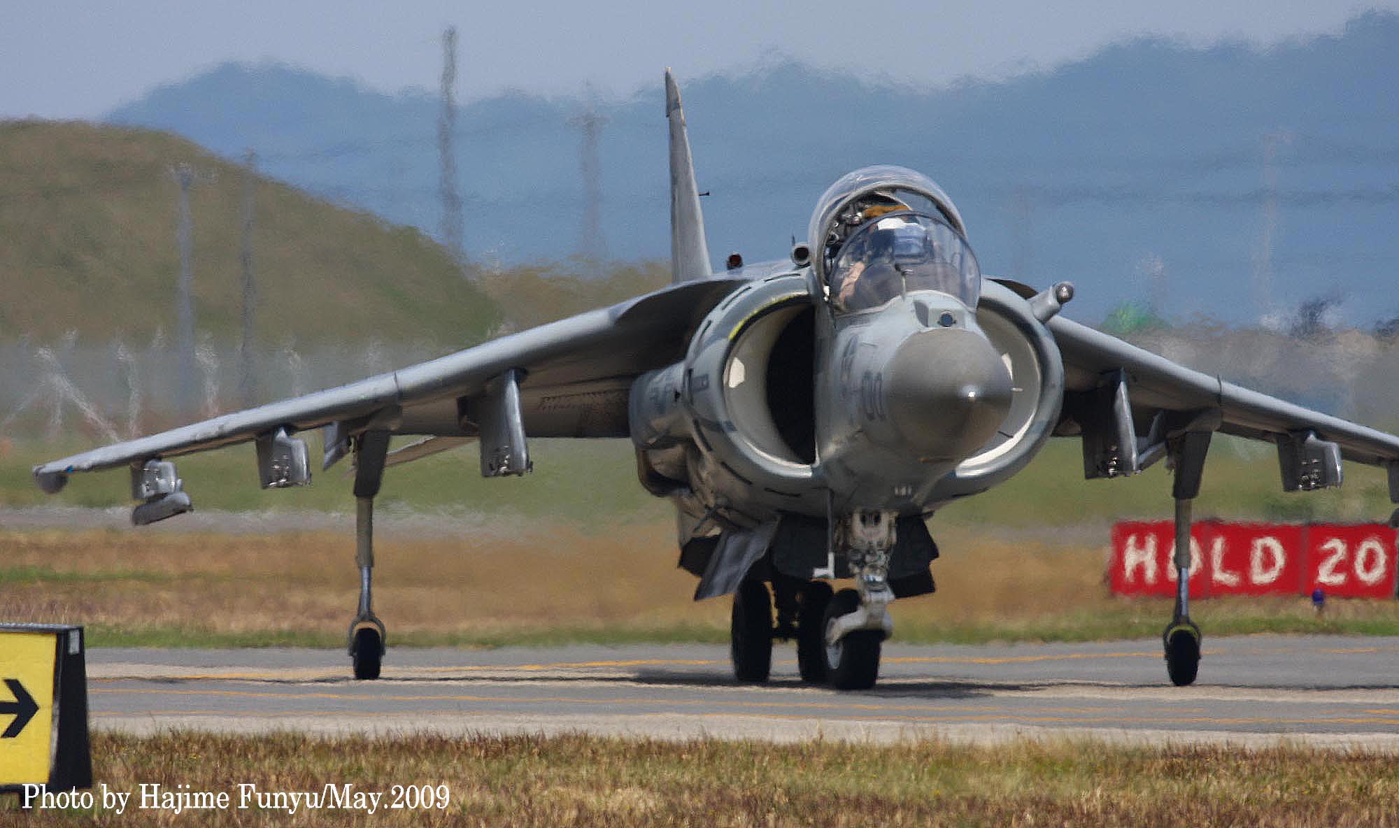 ↑ 2009年5月5日.恒例の岩国公開日 この日は、久々にAV-8Bの展示フライトが多かった。何とナイトハリアー2機 飛行展示には、レーダーハリアー”CF-00”が使われ 垂直上昇などハリアーの飛行特性を生かした展示飛行が披露された。フニュ師匠のレポートより