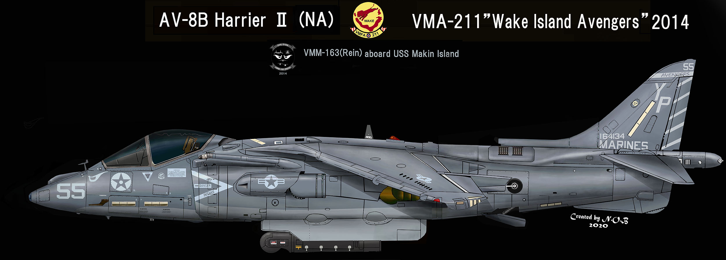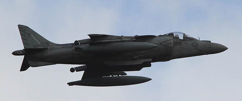 ↑ 22014年強襲揚陸艦マキン・アイランドに搭載されて航海に出た際のマーキングで、尾翼には海兵隊遠征部隊の統合運用飛行隊HMM-163のテールレター「YP」が入っている。VMM-163は、2011年MV-22Bオスプレーに機種交換を終えたばかりの飛行隊で、有名な「Evil Eyes」(邪悪なまなざし)飛行隊である。彼らのマーキングのポイントである「目」がハリアーの機首に書き込まれていた。AV-8B(NA)Bu.No.164134は、1999年VMA-311として嘉手納に飛来している。
