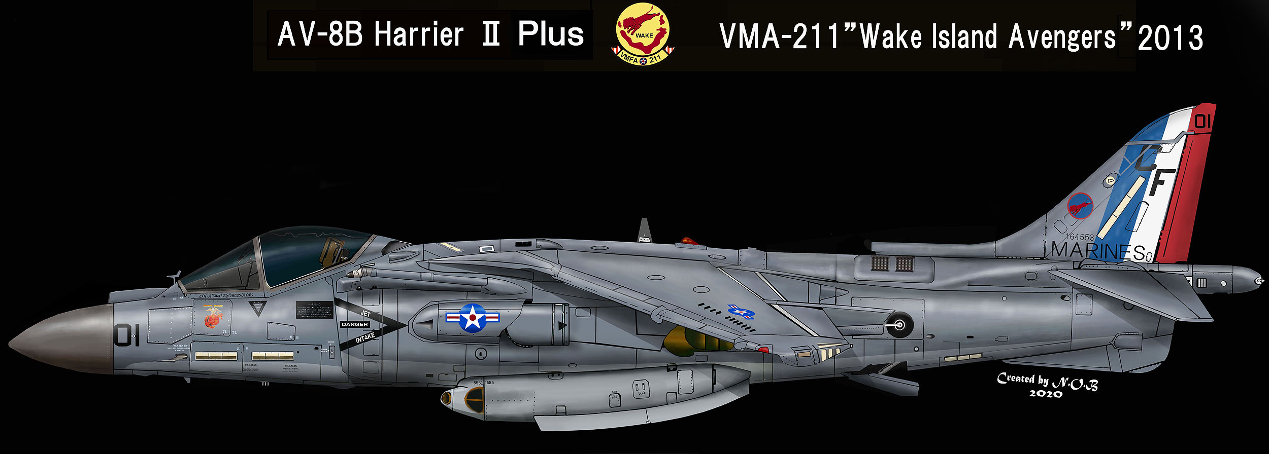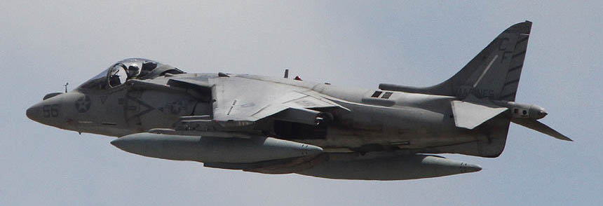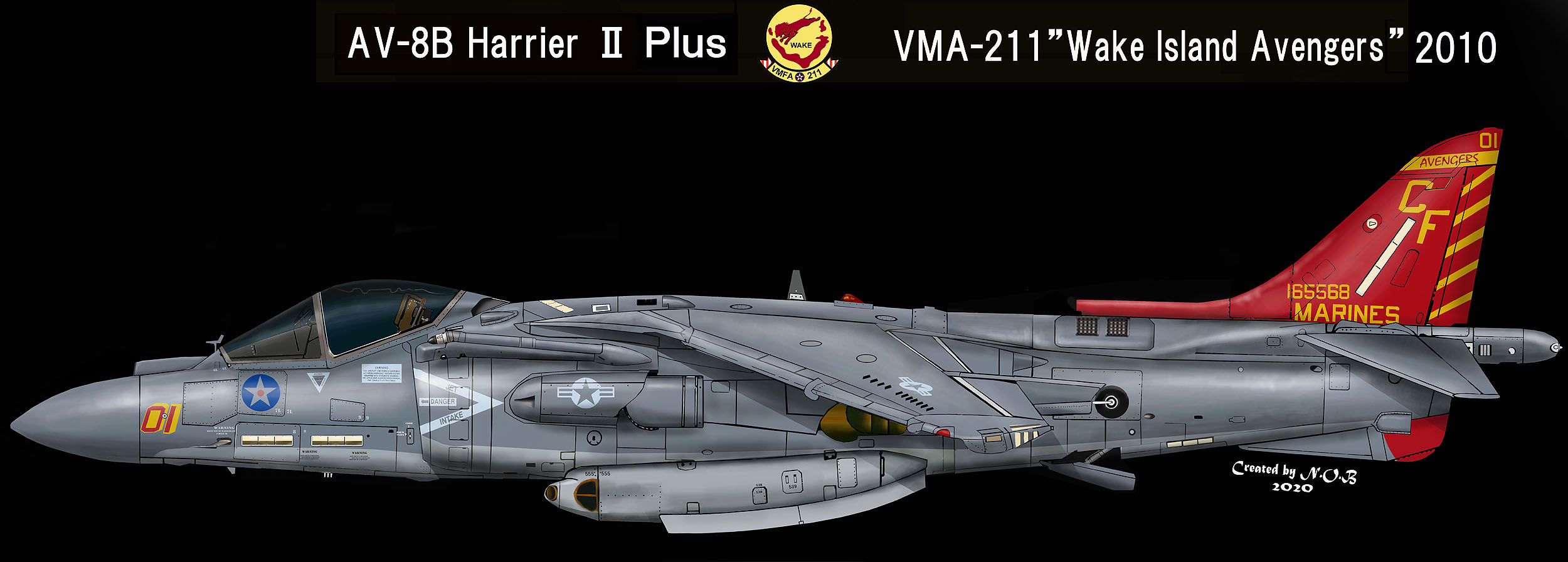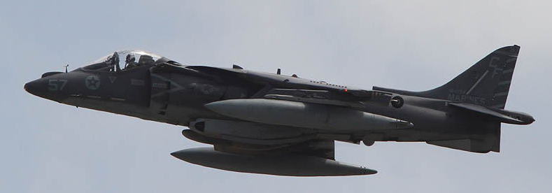 ↑ 2010年ハリアーになって初めて尾翼一面を派手に塗りあげた機体で、アメリカ本国のショーでデビューしたが残念ながらこのマーキングで日本に飛来したことはない。歴代のVMA-211ショーバード機でもっとも目立つマーキングで、機首Modex01は黄色のシャドーが太めに書かれている。尾翼の赤/黄はインシグニアの2色から選ばれたものである。AV-8B Bu.No.165568