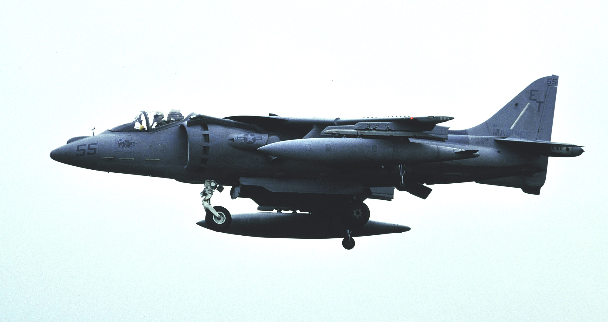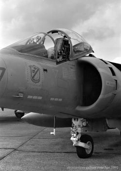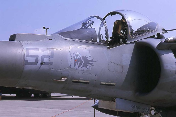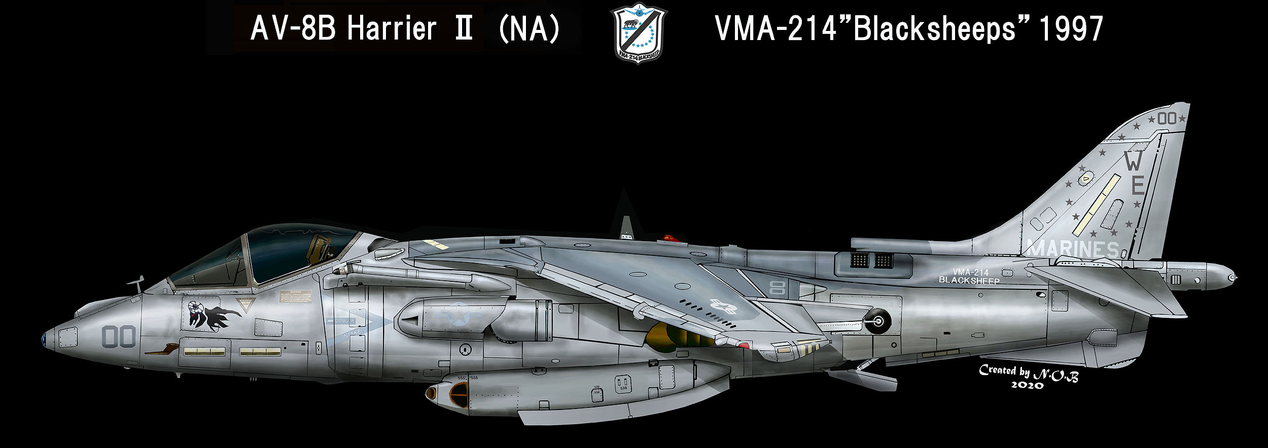 ↑ 1997年当時のVMA-214の標準塗装で 機首に黒い羊がモチーフされている。この飛行隊は、ハリアー飛行隊としては機種転換が遅く、1989年にAV-8Bを受領しているため、グリーン系迷彩の期間がほとんどなかったと思われ 写真が少ない。この黒羊のデザインは、その後レーダーハリアー受領時に再び機首に再現されている。 Bu.No.不明