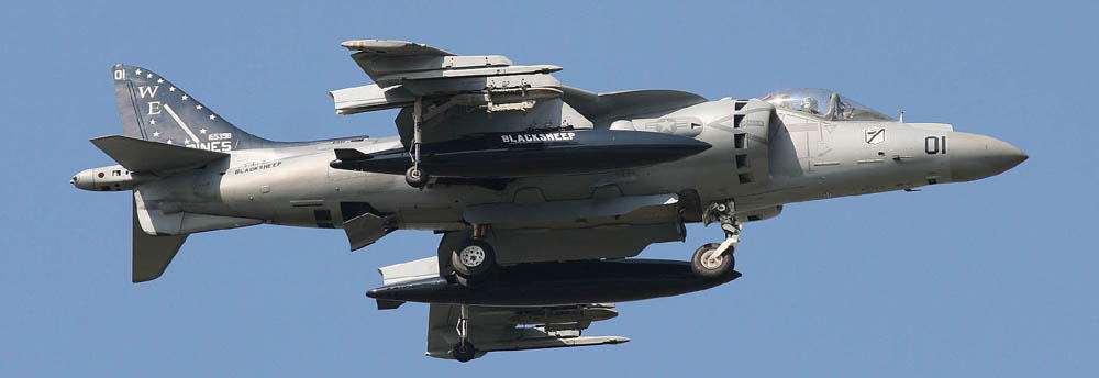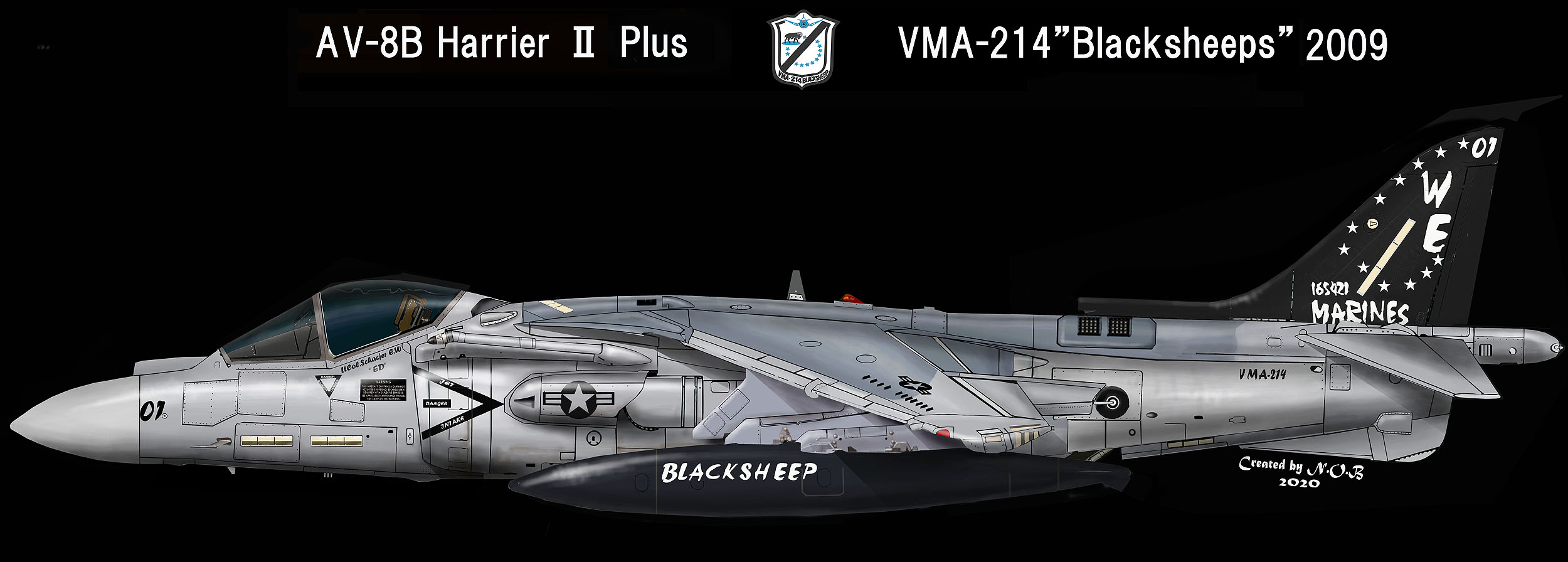 ↑ 2011年2代目ブラックテール機、文字は、センチュリー文字で統一され 機首にインシグニアと星の入った黒いラインが入った。VMA-214歴代のハリアーで最も艶やかで 部隊創設時の初代隊長で映画にもなったボイントン少佐の名前が 機首に入っている。彼は、名誉勲章受章者で英雄であるが、愛称が「PAPPY」で部下からは親しまれた好人物だったらしい。AV-8B Bu.No.165421