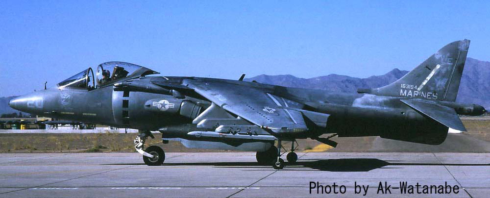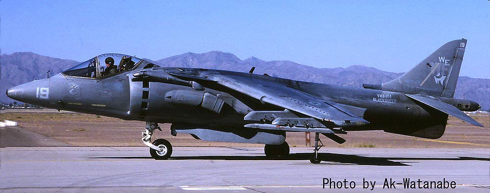海兵隊最初のナイトアタック・ハリアーになったのがVMA-214だった。A-4Mスカイホークの時代、少しの撮影チャンスに恵まれたこの部隊もハリアーになってから ほとんどお目に掛かることなく レーダー・ハリアーが加わるまでの間、写真がほとんどない。たまたま 渡辺 明さんがアメリカで撮影されたスライドを送っていただいたのでご覧いただきましょう。マリングレー迷彩になった後の機体ですが WE-19.20は、アリゾナ州ルーク空軍基地での撮影だ。特にWE-20は、ほとんど所属部隊がわからないほど 徹底したロービジで僅かに機首のインシグニアと薄いテールレターだけが 判別できるポイントだ。