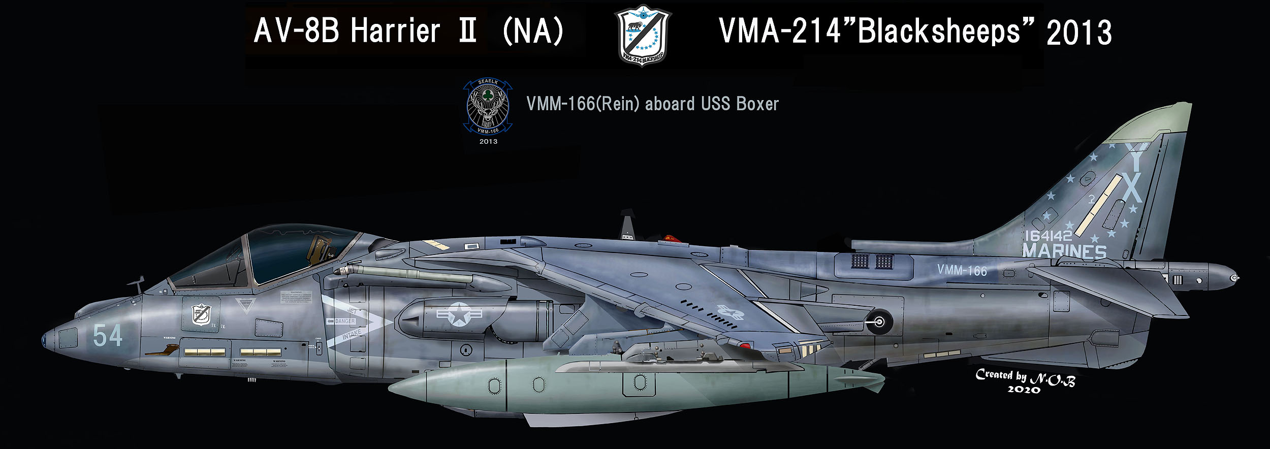↑ 2013年強襲揚陸艦USSボクサーに搭載され、VMM-166(REIN)として遠征部隊に加わった時のもので、VMM-166のテーレター「YX」を入れている。また、VMAの代わりにVMMの部隊番号も胴体後部に書き込み 遠征部隊としての一体感を醸し出している。(REIN)は、強襲揚陸艦に積まれた各飛行隊の指揮系統を一本化して作戦に当るようにする為、オスプレーを擁するVMMが頭になっている。AV-8B Bu.No.164142