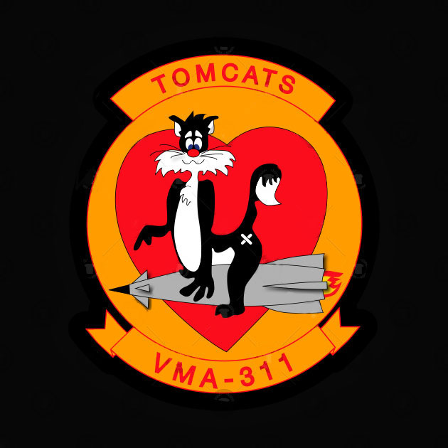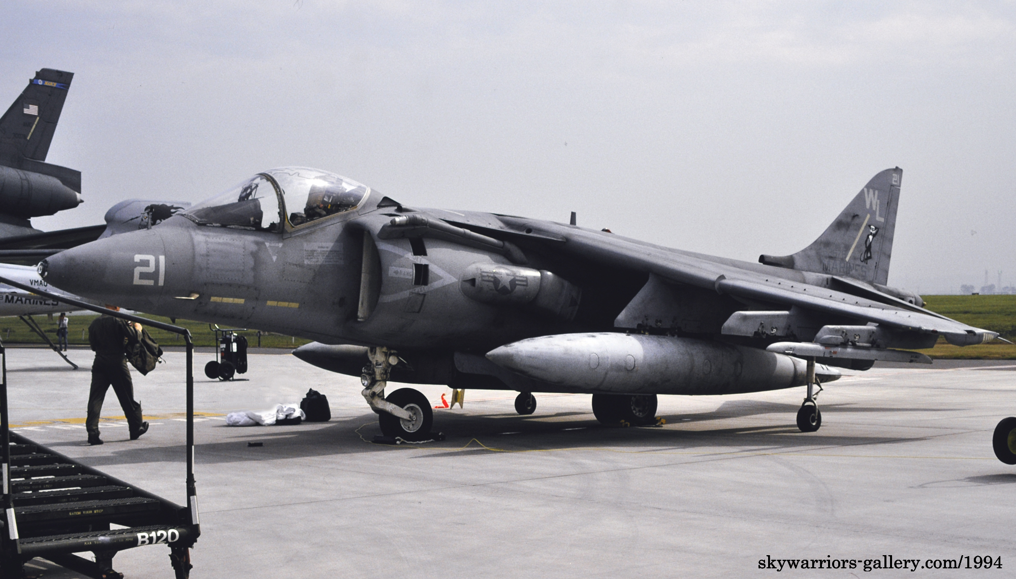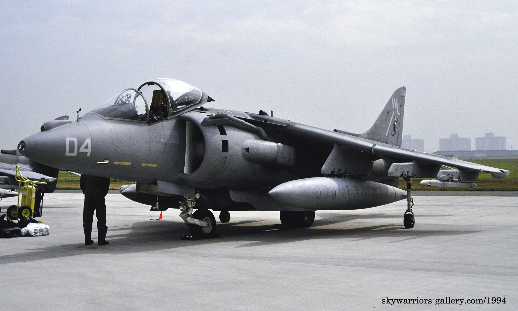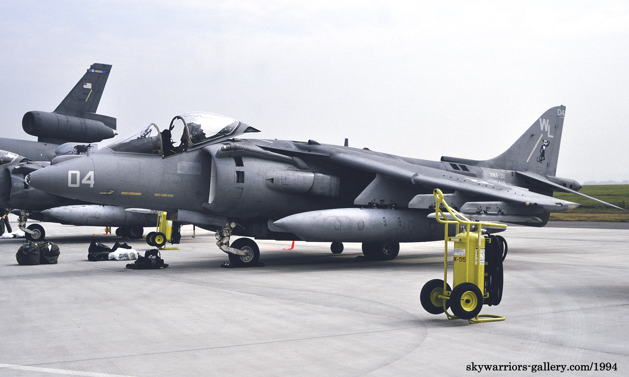 ↑ 1994年事田基地に展示されたVMA-311のAV-8B。この年5月に岩国基地にVMA-531の交代で駐留。湾岸戦争を機に暗いグリーン系迷彩から、ミディアムグレー一色の塗装に塗り替えが促進された。スカイホーク時代の黒猫は、グレー色が地であるとマーキングとして冴える。