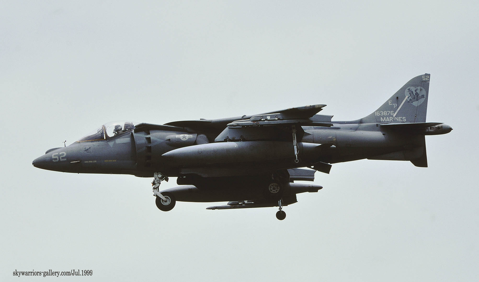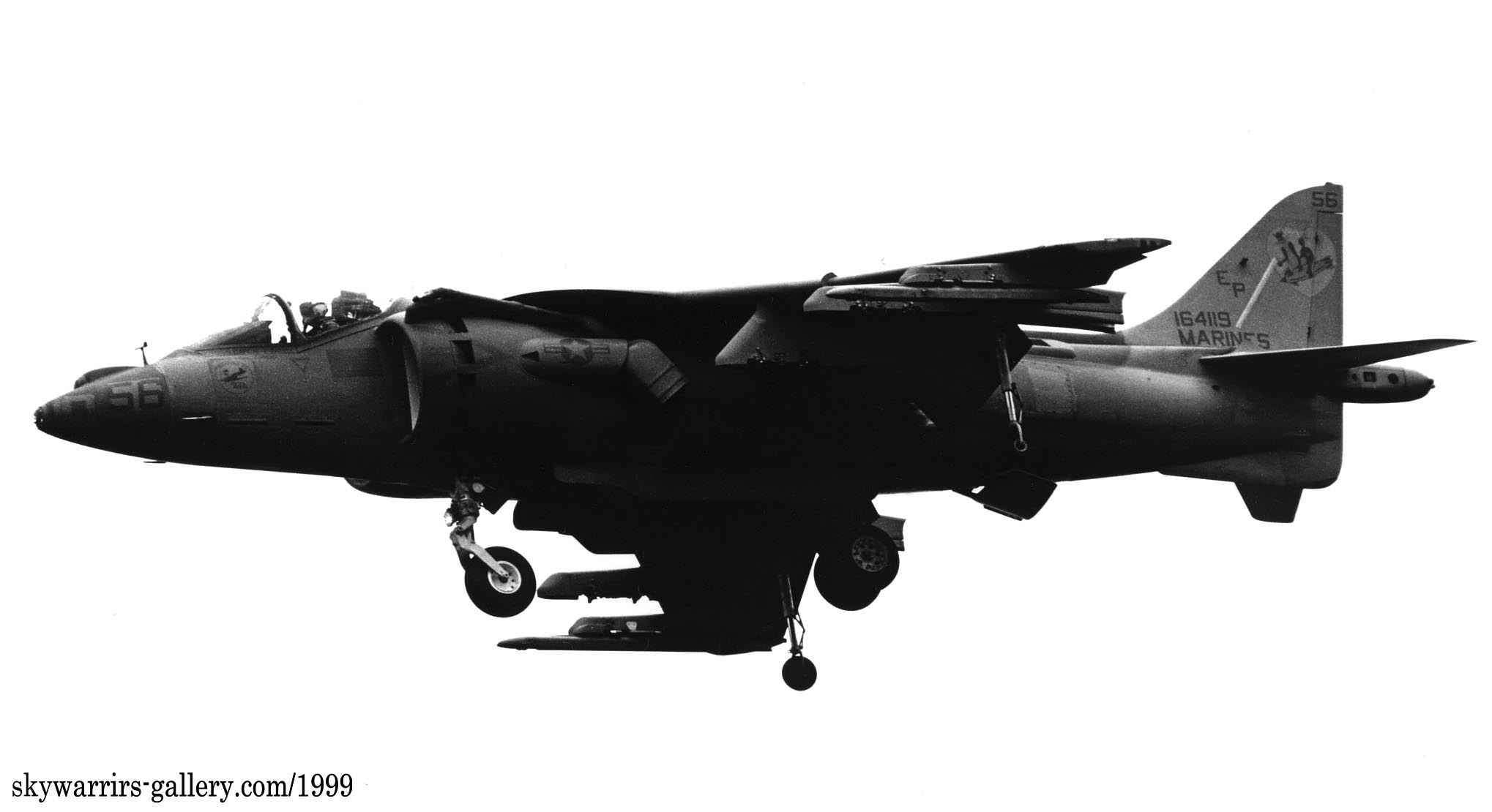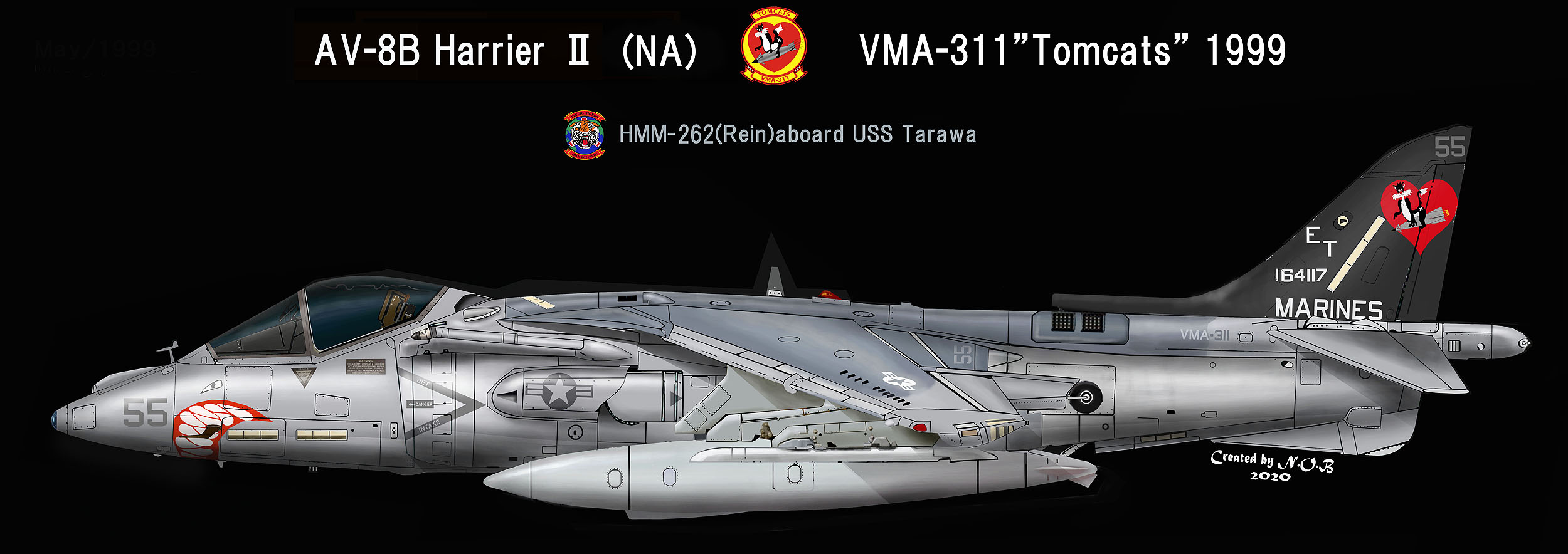↑ 1999年USSタラワに搭載されて航海に出た際のマーキングで ブラックテールのうえ機首にシャークティースを入れていた時期もあった。非常に大きな鮫口で注目を浴びた機体である。この機体1999年5月嘉手納にも飛来したが、鮫口は消されていた。Bu.No.164117