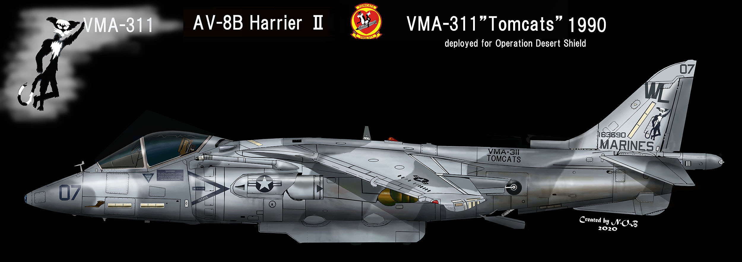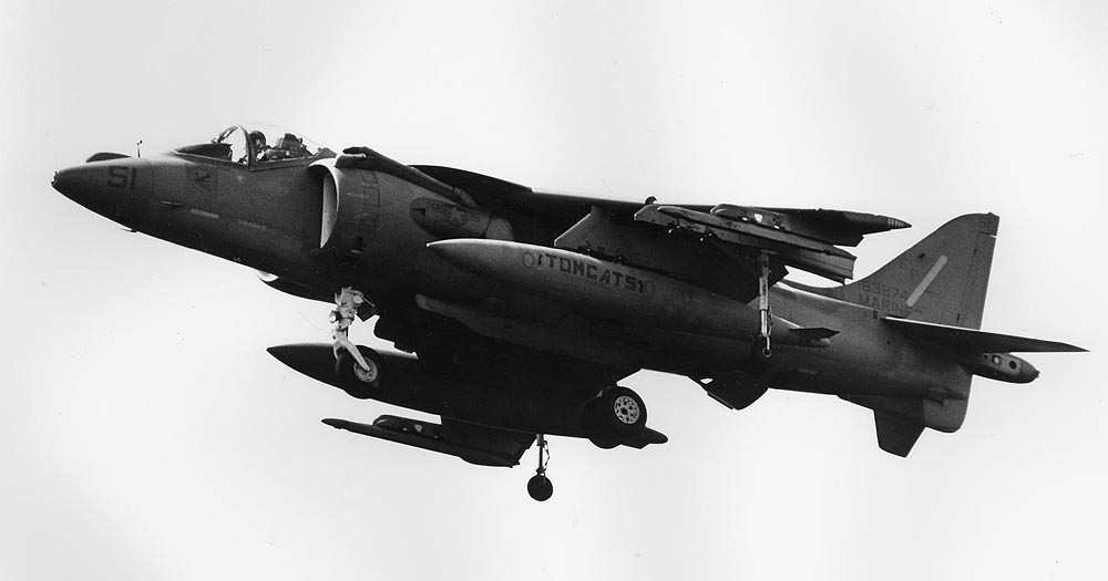 ↑ 湾岸戦争に参加した際のVMA-311のマーキング。1990年までダークグレーだった部分をライトグレーに塗り直し、急遽砂漠に対応したマーキングにしたものの ハリアーは、この戦いでの被撃墜率は高く、湾岸戦争が始まった1991年1月と2月の初戦で4機が撃墜され2名が戦死している。 Bu.No.163690