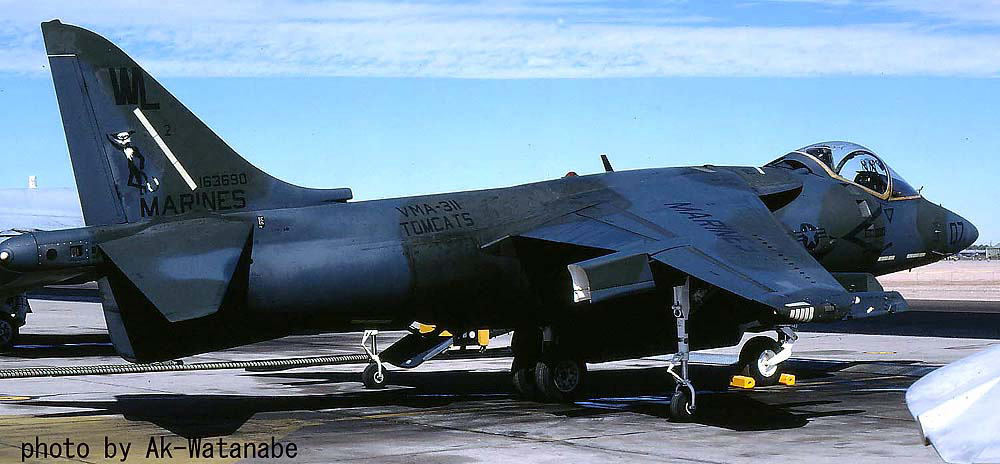 VMA-311は、1991年1月にAV-8Bに機種転換した。1958年からA-4スカイホークの各型を使い続けて何と32年!!同じ機種を30年以上使い続けた希少な部隊である。ハリアー受領後すぐに湾岸戦争の開始と共に参戦、1017回ものコンバット・ソティを熟し、840トンもの爆弾をイラク軍に叩き込んでいる。下写真は渡辺さんがエルセントロにて撮影されたものです。