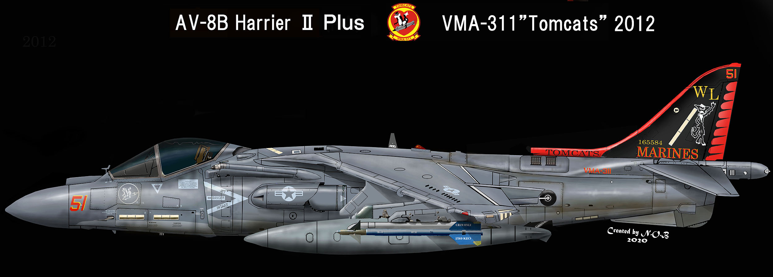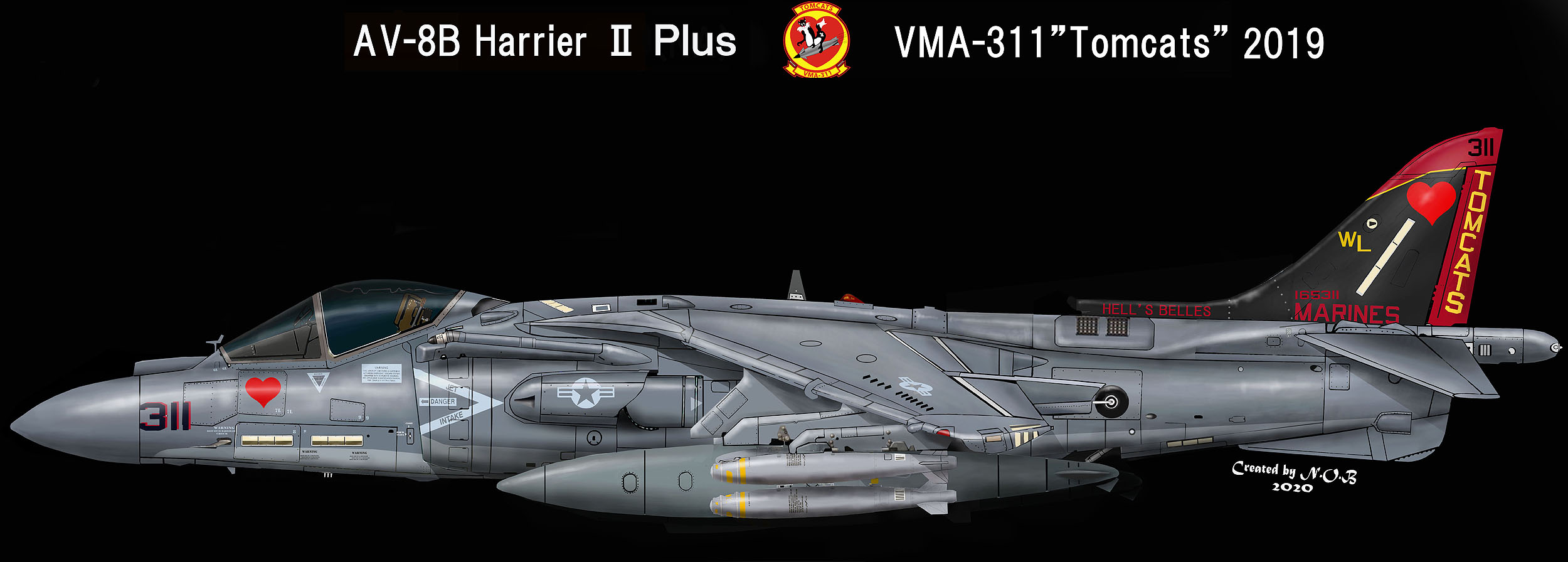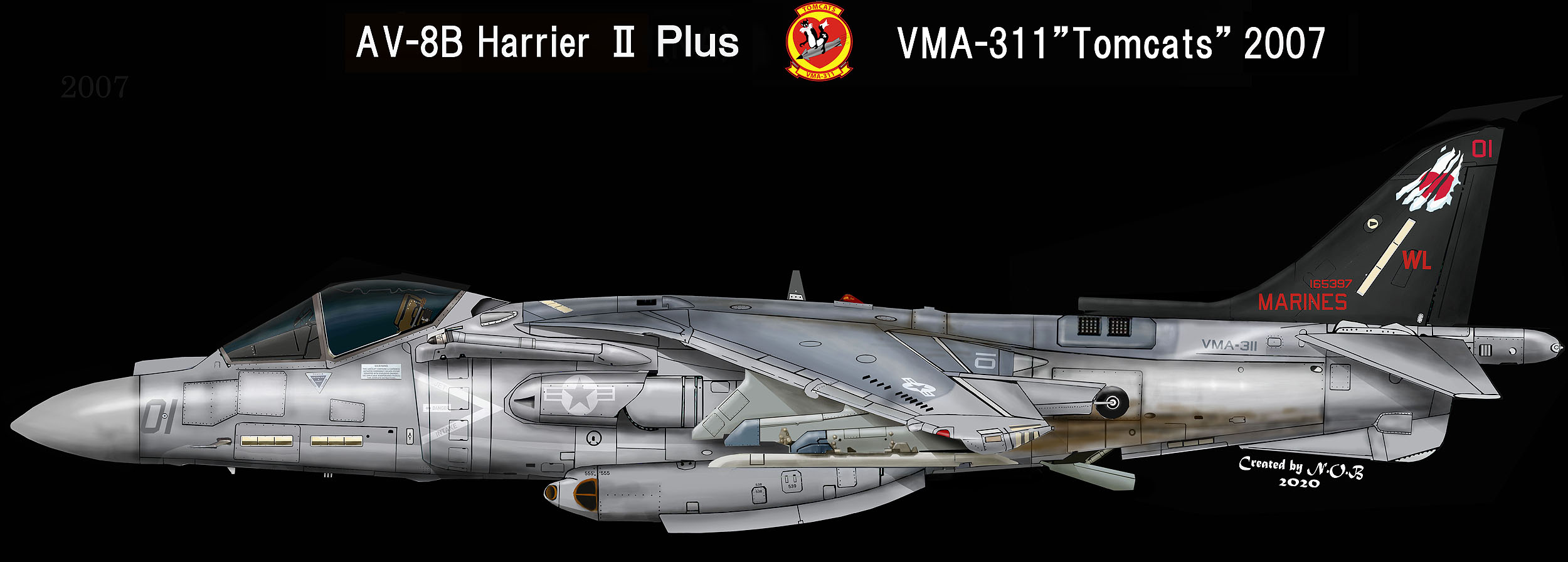 ↑ 2007年のショーバードで久々に部隊としてブラックテールが復活させたもので、前年2006年には51番を付けて丘珠のページェントにも展示された。この後VMA-311はデザインは異なるが、一貫してブラックテールを継承したショーバードを繰り出している。尾翼は猫爪で引き裂かれたハートである。この機体2012年WL-00として嘉手納にも飛来しているが、オールグレーのマーキングであった。Bu.No.165397