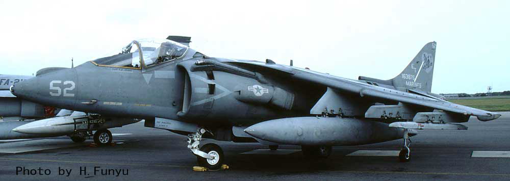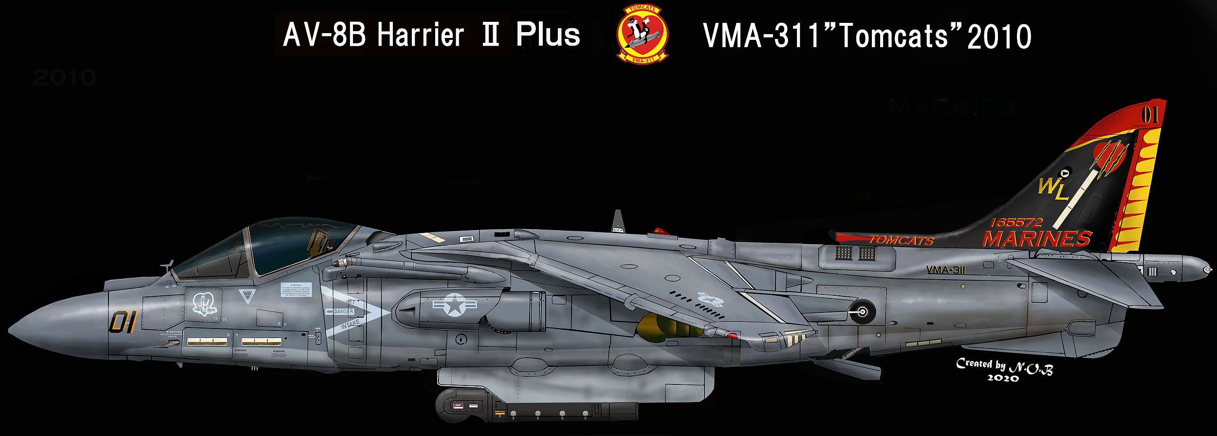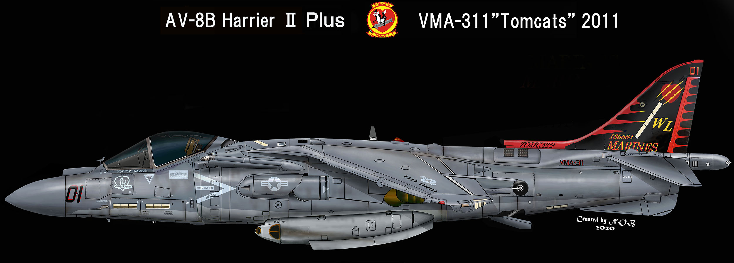 ↑ 2007年のショーバードで久々に部隊としてブラックテールが復活させたもので、前年2006年には51番を付けて丘珠のページェントにも展示された。この後VMA-311はデザインは異なるが、一貫してブラックテールを継承したショーバードを繰り出している。尾翼は猫爪で引き裂かれたハートである。この機体2012年WL-00として嘉手納にも飛来しているが、オールグレーのマーキングであった。Bu.No.165397
