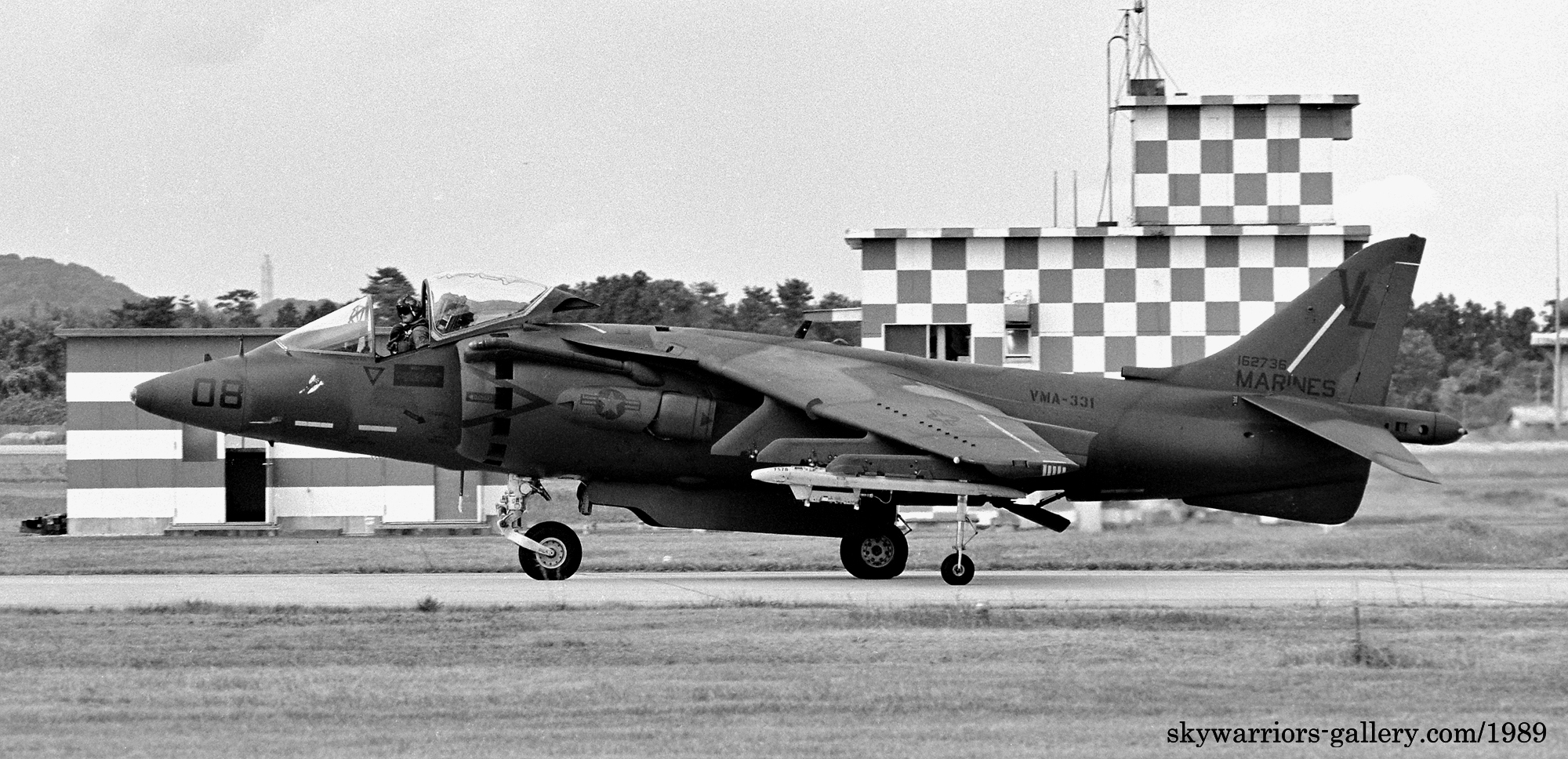AV-8Bに機種交換後VMA-331が、岩国に始めて飛来したのは1989年6月10日。梅雨入りしどんより曇った岩国の空から、彼らは次々にランウェイに舞い降りた。前任のVMA-211のA-4Mに替わりMAG-32から6ヶ月のローテーションで AV-8B部隊としては初の来日であった。何と20機という空軍スコードロン並みの定数で岩国に配備されたのである。