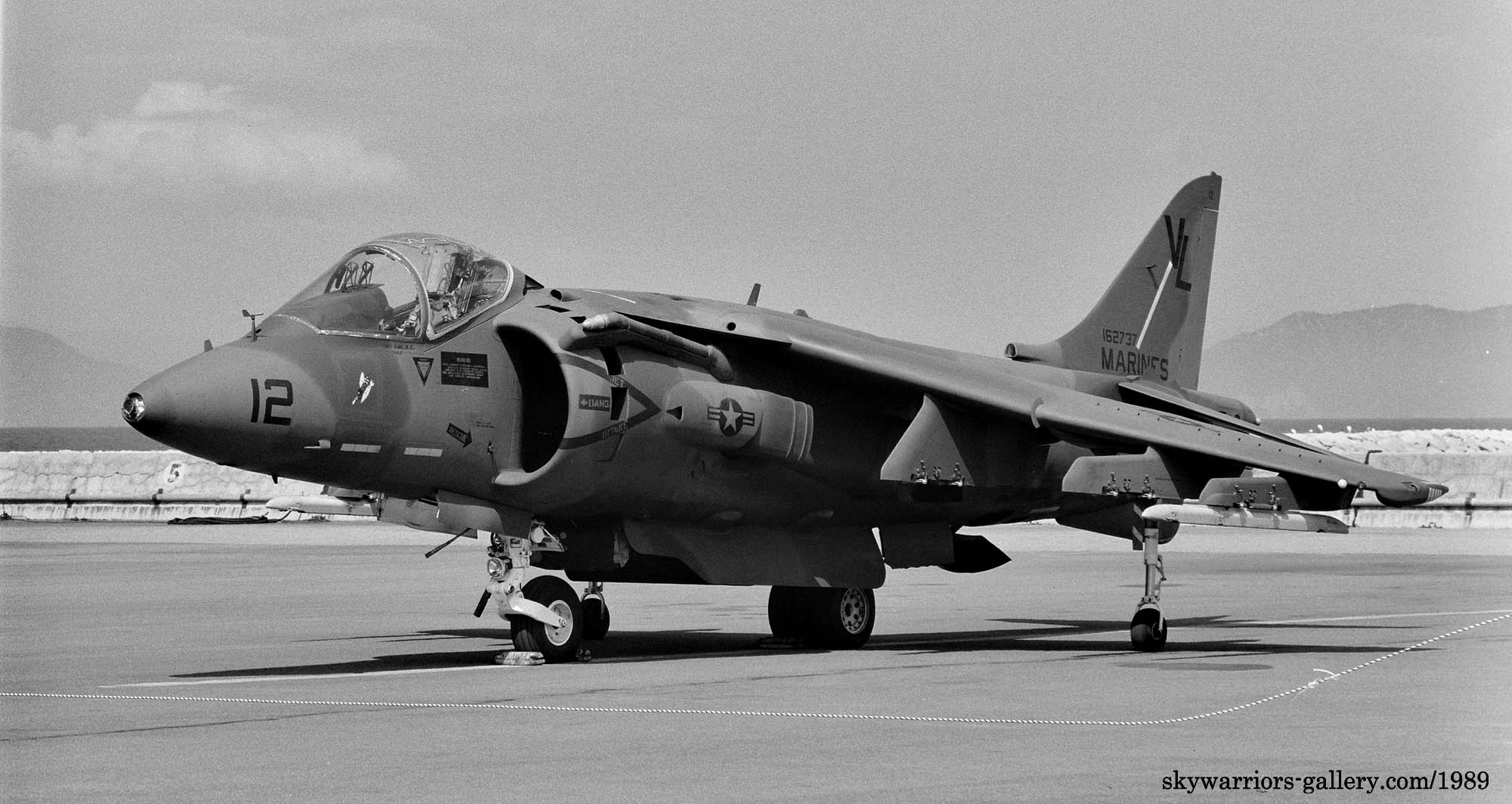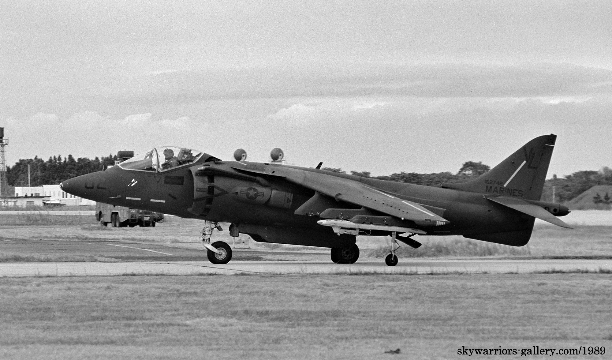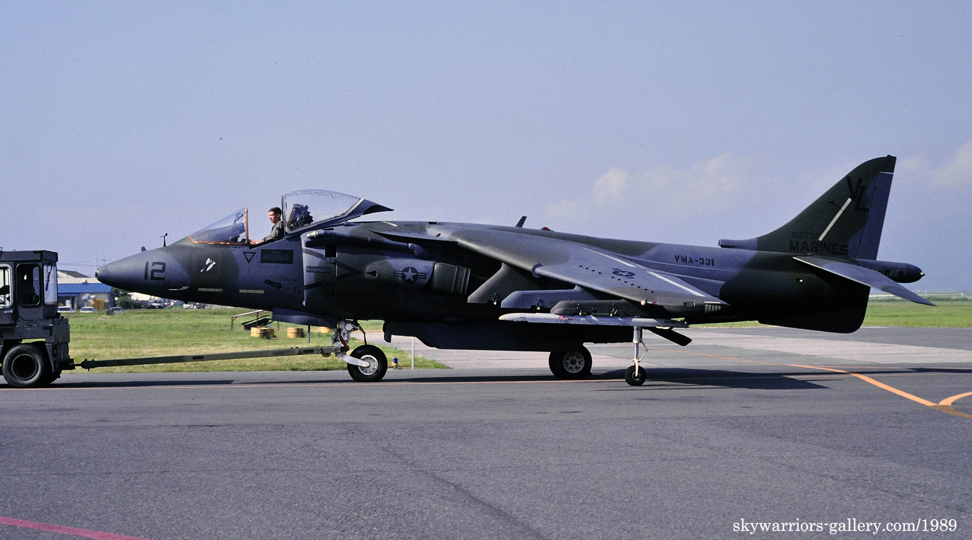 1983年1月24日 当時チェリーポイントのMAG-32に所属していたVMA-331は、A-4Mから新鋭のAV-8Bに転換を始めた。”ハリアーⅡ”の海兵隊最初の飛行隊であるから当然注目の的であったが、彼らは21名のパイロットと15機のAV-8B”ハリアーⅡ”で転換任務を開始し、2年半後の1985年8月にはクロフォード中佐の元、完全なる作戦遂行の能力を持ったハリアー部隊に仕上がったとされる。1987年1月から強襲揚陸艦ベローウッドで初の海外展開を経験、1989年6月には岩国展開である。私は彼らが来るのを指を数えて待っていたが、先代のAV-8Aに比べ重厚感のあるB型は結構絵になる被写体であった。