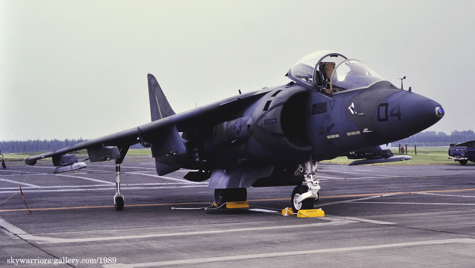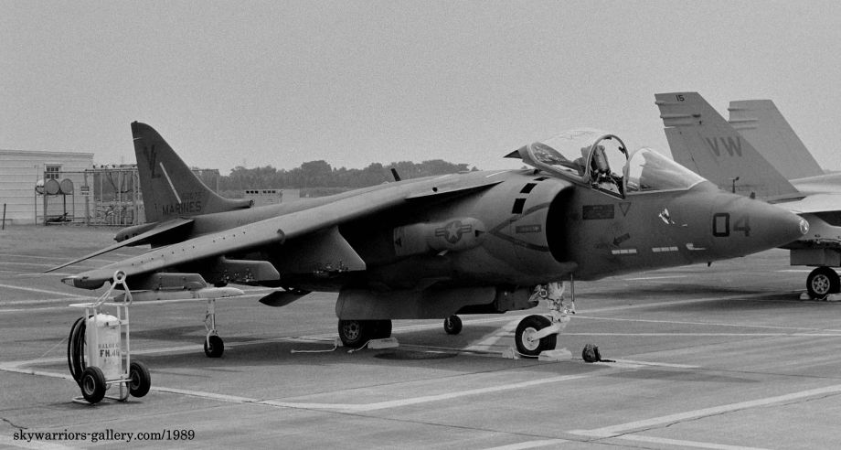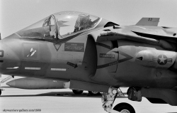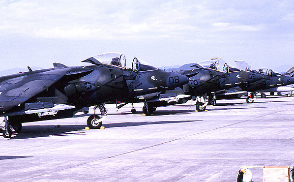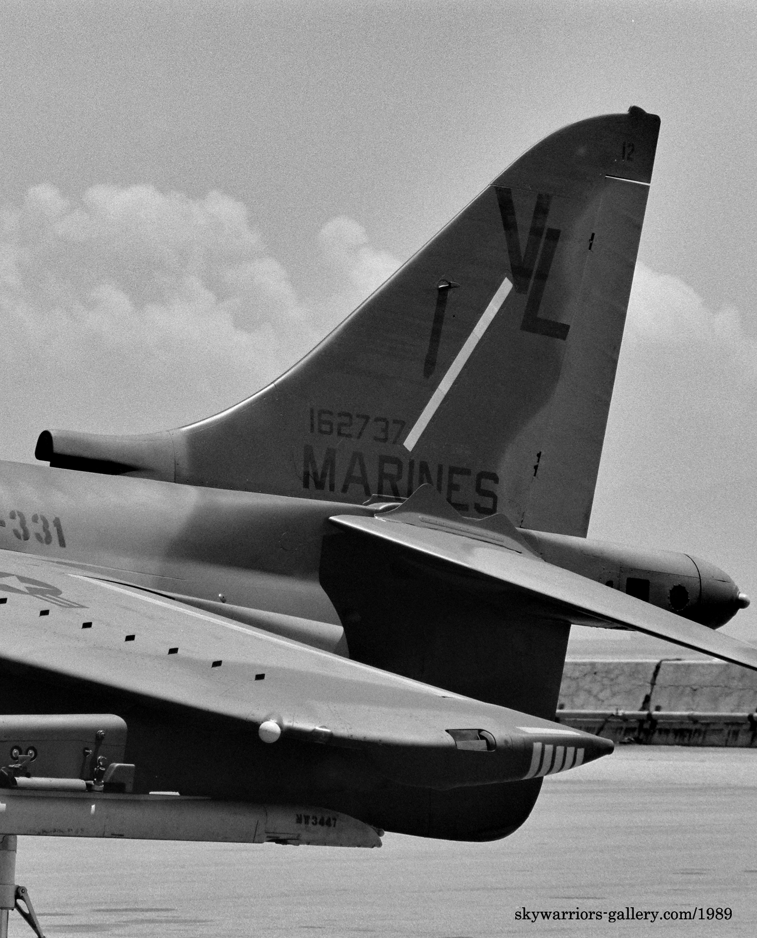 VMA-331はA-4M時代にも岩国に駐留していたが、私は就職したばかりで仕事の関係上関東地区から離れたせいで、撮影のチャンスは殆どなかった。しかしAV-8Bに代わって日本に飛来した時期は時間にも余裕があって、それまでより多くの撮影チャンスを得る事が出来た。特に築城/芦屋など九州地区の航空祭にはよく展示された為、丁度山陰地方(松江)に転勤で住んでいた私にとっては都合が良かった。九州各地でこの新型ハリアーを十分堪能できた事は運が良かったと思う。只ダークグリーンとダークグレーのオーバーラル迷彩にこの小さな部隊マークでは、近くからでないと何が描いてあるかさえ、全く判らない。しかもロービジ・マークの蜂は灰色で表現されたので 「ハエ」に見えてしまう人も多かったのではないだろうか・・・・・・
