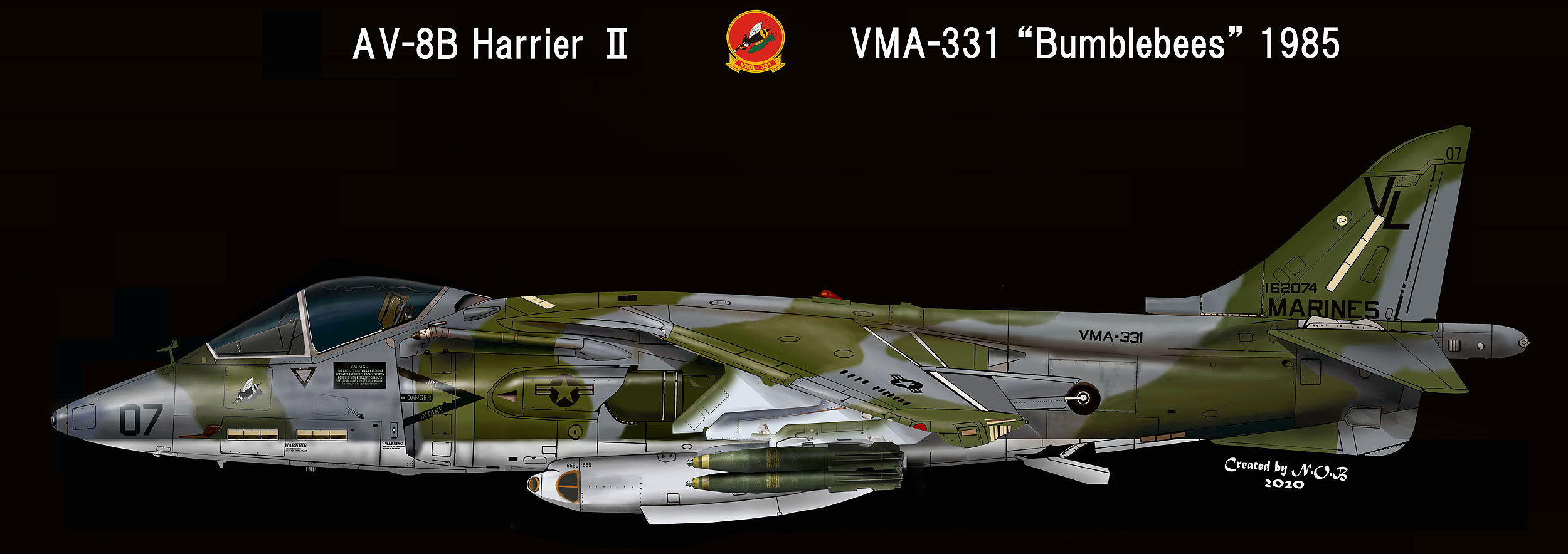 1985年にVMA-331がAV-8Bを受領して1年ぐらいまでは、下面をライトグレーに塗っていた機体が多かったが その後 オーバーラル・マーキング(全面迷彩色)に変更統一された。