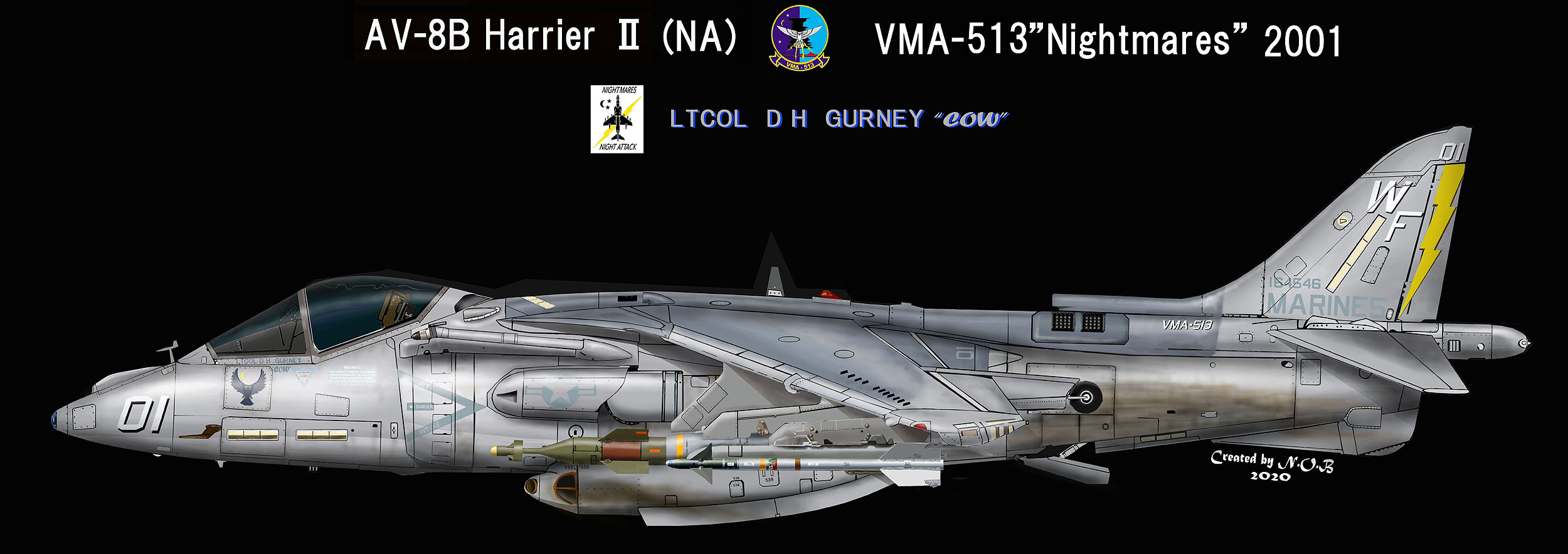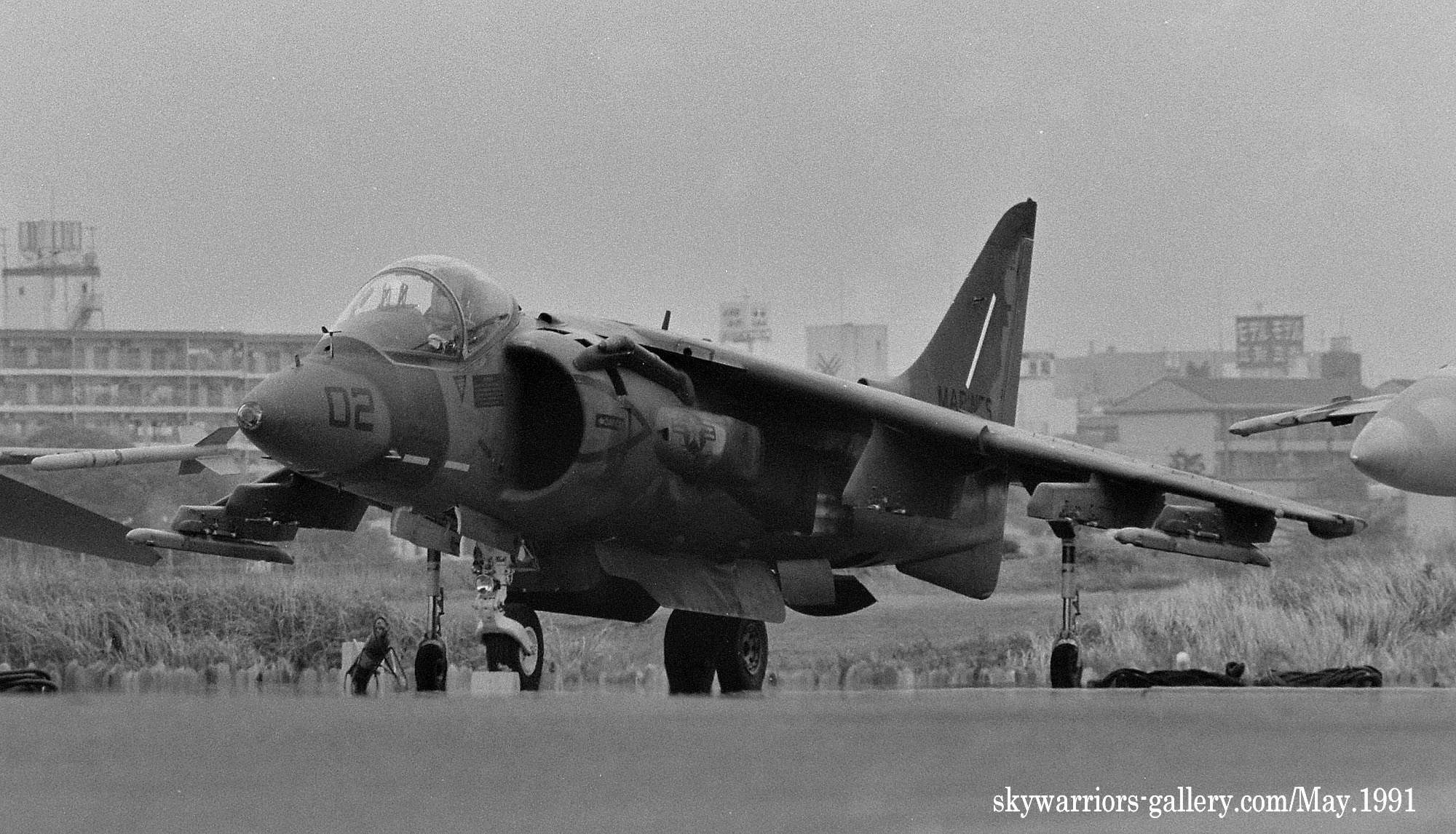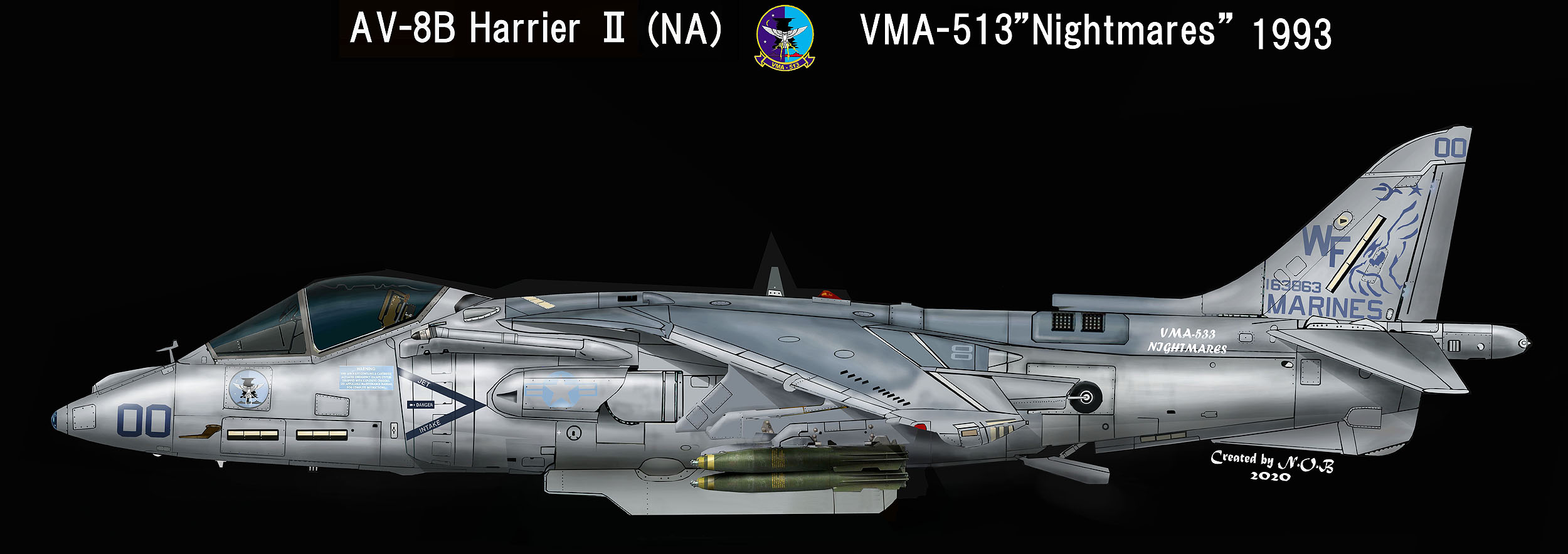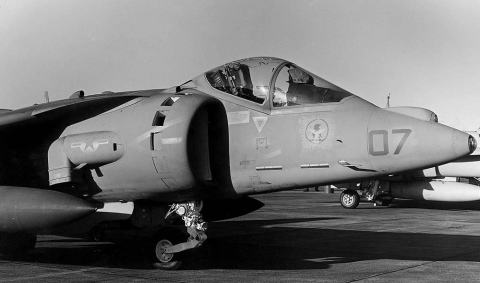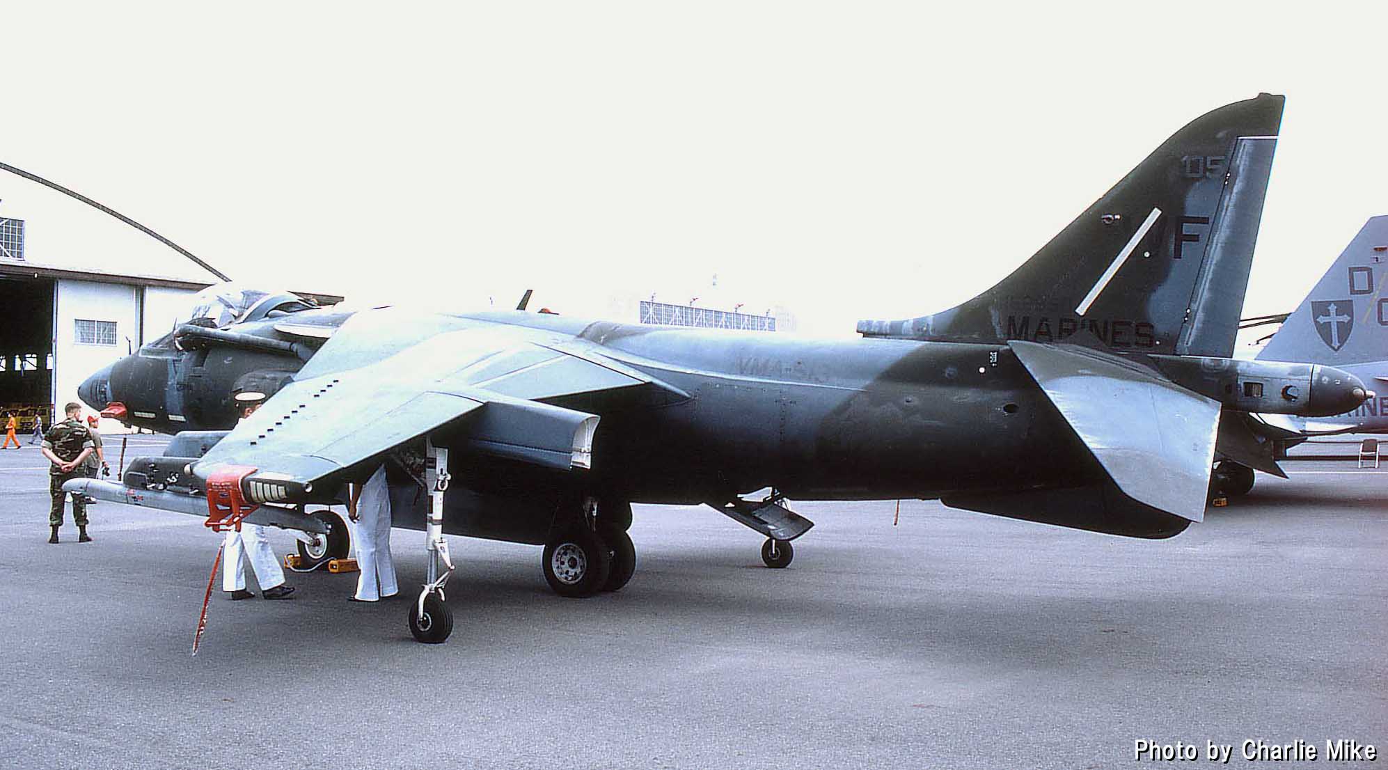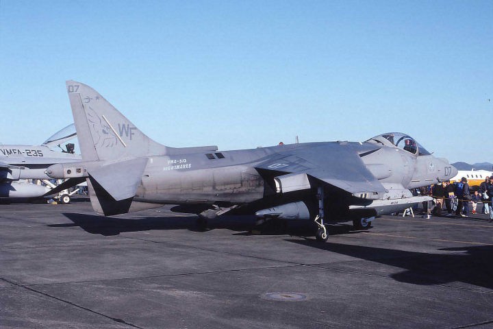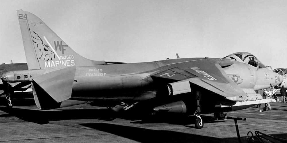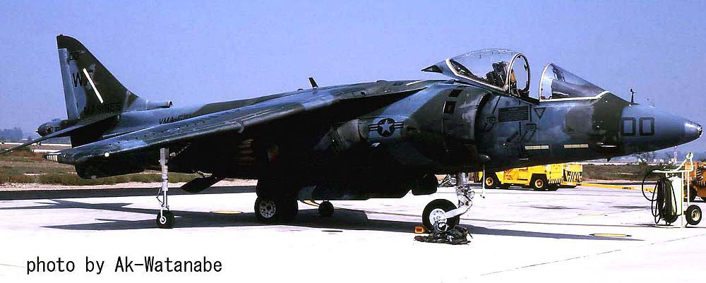 VMA-513ナイト・メアーズは、1987年10月にAV-8B ハリアーUを受領している。この頃の海兵隊の航空機はダークグリーン2色とミディアムグレーの迷彩で統一されていた。特にこの時期のVMA-513のマーキングは、テールレターWFが書かれているだけのシンプルなもので淋しい。渡辺明氏がポイントマグーで撮影されたもの。