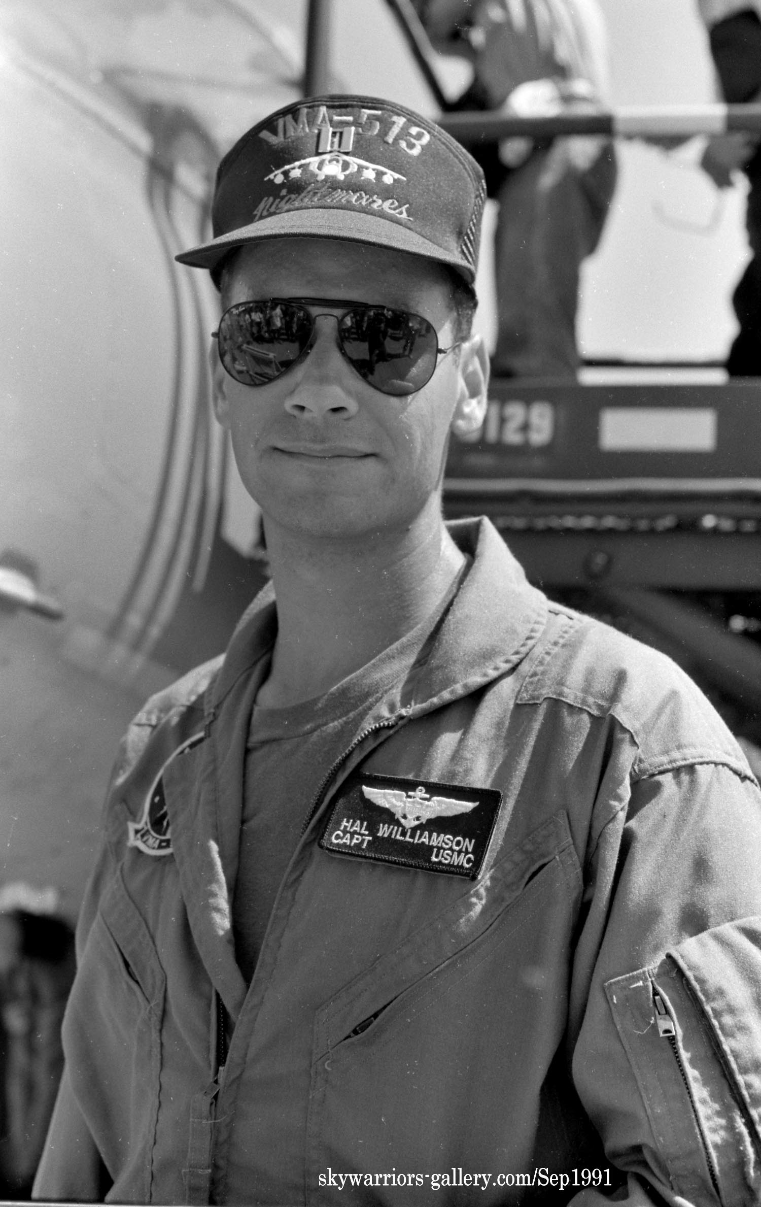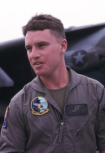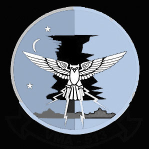 機体が海兵隊グレーに塗り直されて以降、嬉しい事は、インシグニアに因んだ梟のシルエットを尾翼に書込み始めた事だろう。しかも 機首には部隊のインシグニアまで入っている。尾翼を良く見ると「月&星」も書かれているのだ。↓