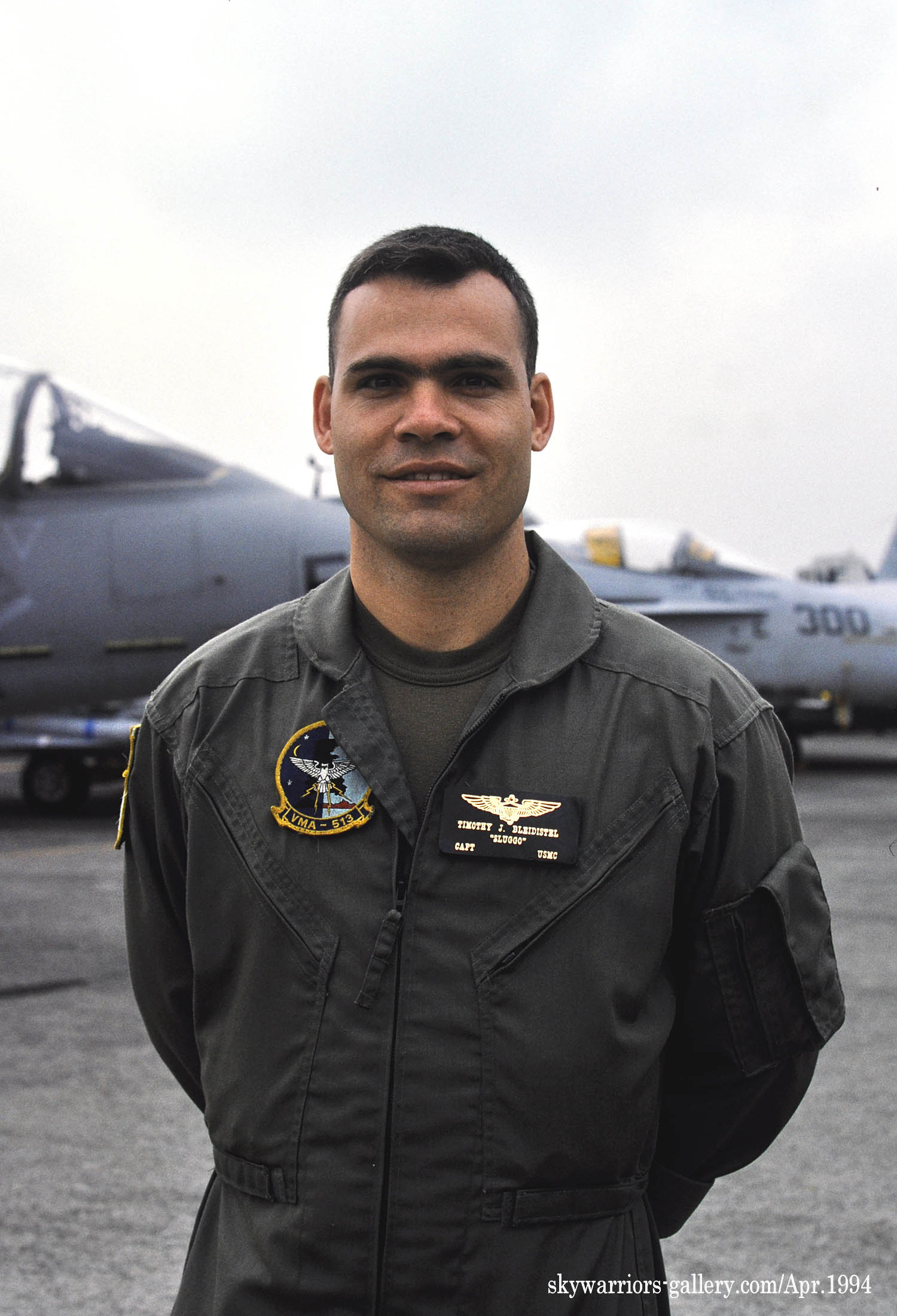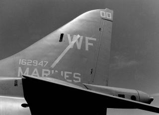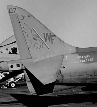 VMA-513は、WW-Uの後期1944年2月に海兵隊の攻撃機飛行隊として創設されているので、結構古い部隊である。日本人からは”グラマン”と忌み嫌われた代表的な海軍戦闘機F-6Fヘルキャットが最初の使用機で、VMF-513は1945年になってグアム・サイパン攻略戦に参加、沖縄戦にも出ている。F3Dスカイナイトのジェット戦闘機を受領して朝鮮戦争に参加の際は北朝鮮機を夜間撃墜している。この頃位から現在の部隊名”Nightmare"が使われるようになったようだ。全天候ダグラスF4Dスカイレイを経て1963年8月に海兵隊3番目のファントム飛行隊としてF-4Bを受領している。ファントム時代は、尾翼に黒で”WF"と入れたシンプルなマーキングで後までこの伝統?は受け継がれる。F-4B時代の部隊ナンバーはVMFA-513である。